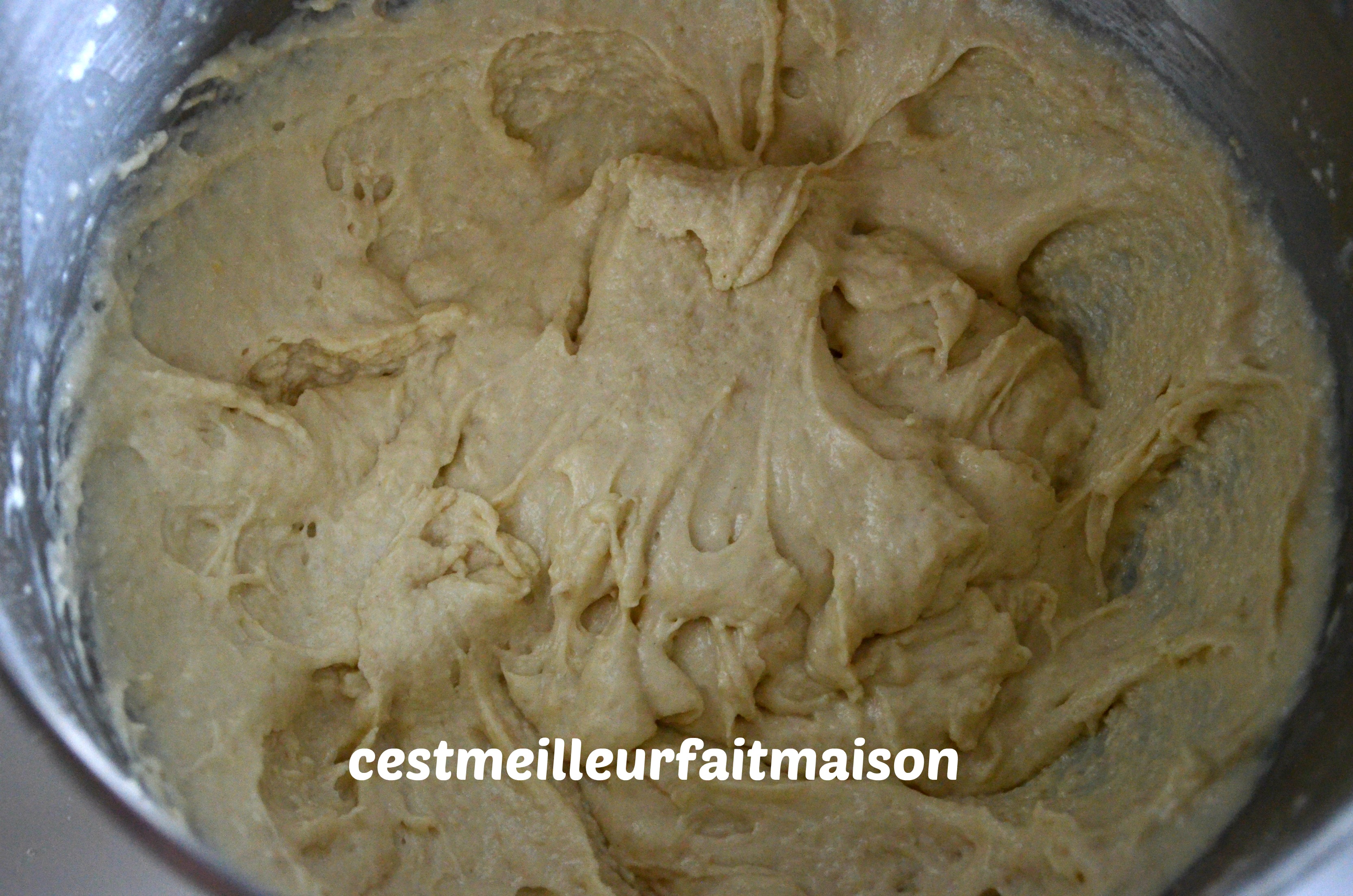 Dans un récipient, ajouter la farine, la levure, le sucre, la vanille en poudre, l’œuf et le beurre fondu. Mélanger en ajoutant le lait. Le mélange peut se faire avec une cuillère en bois, au fouet ou au robot.