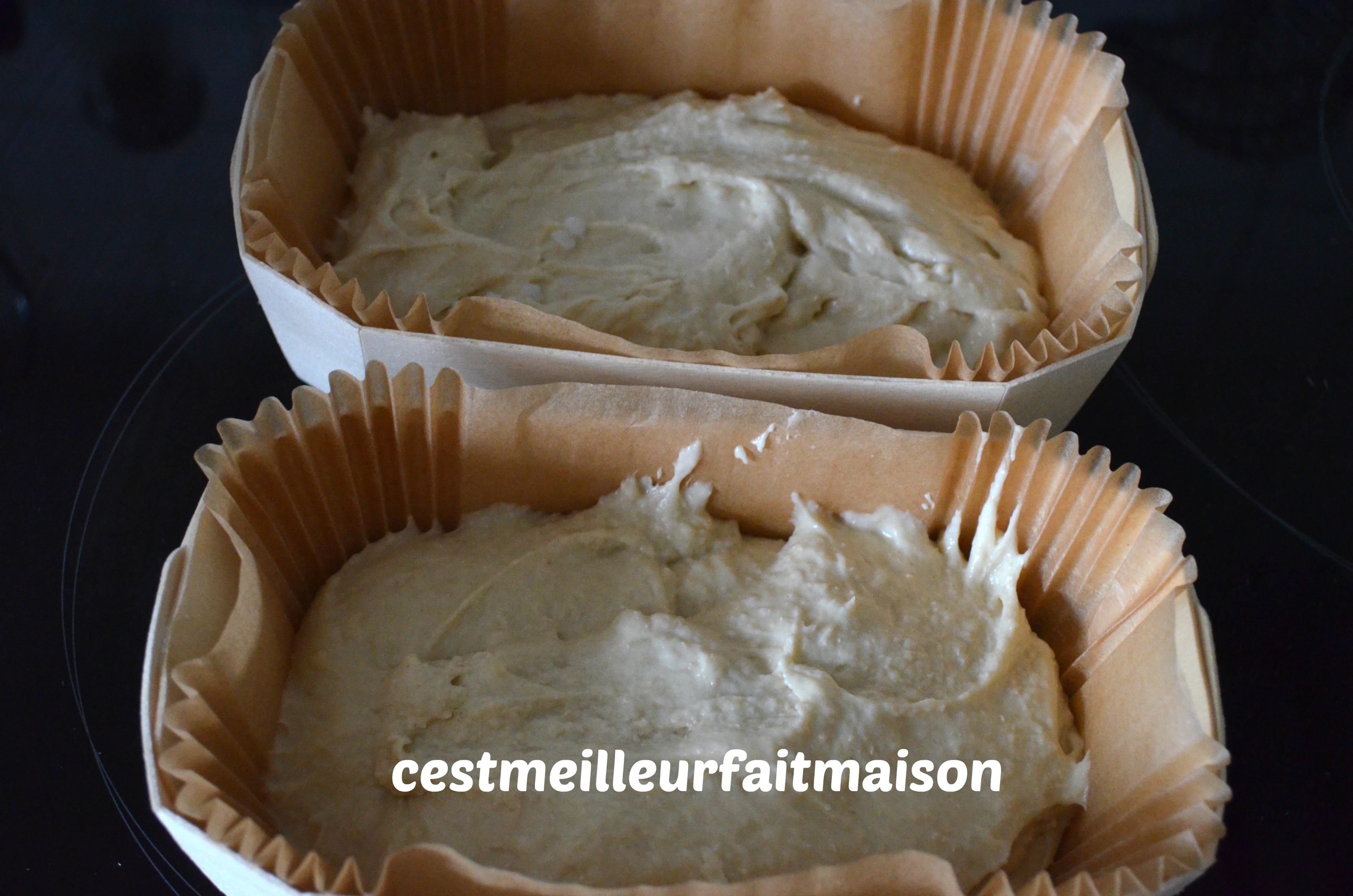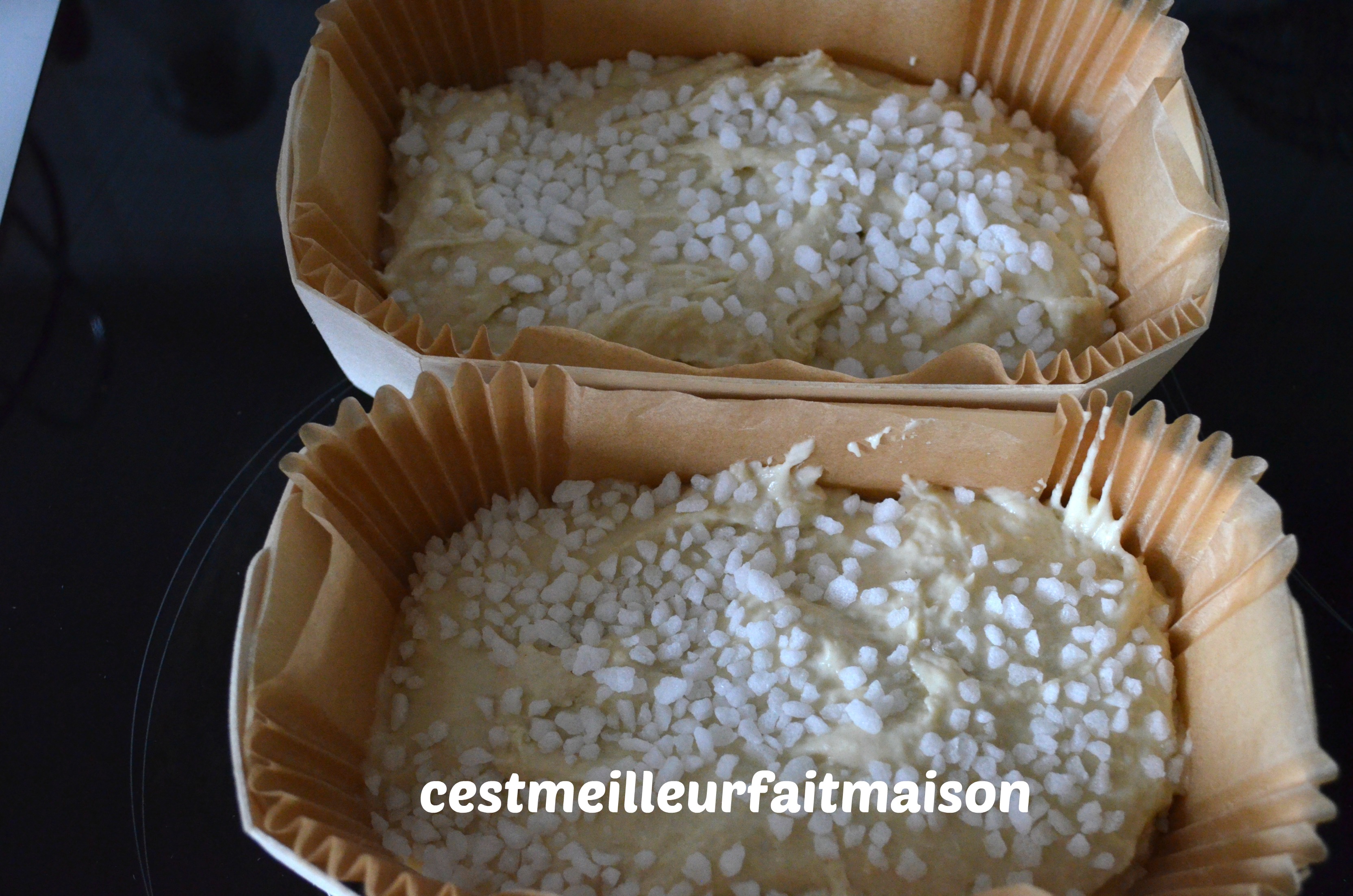 2- Verser la pâte dans un ou deux moules. Elle est très collante. Parsemer de sucre en grains.