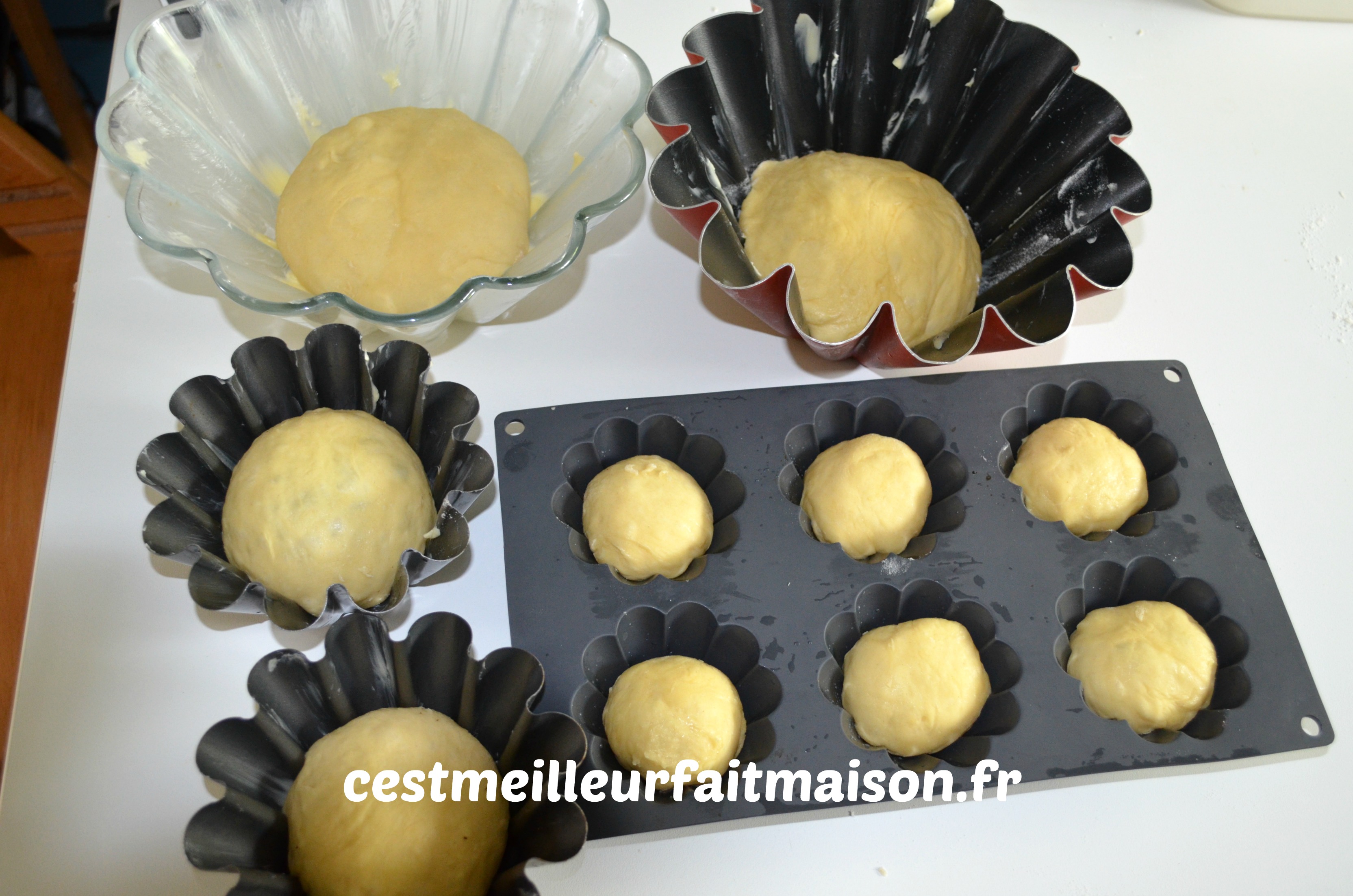 3- Beurrer les moules (ce n’est pas nécessaire avec des moules en silicone ou Guy Demarle). Bouler les pâtons, ajouter des pépites de chocolat (facultatif) dans les boules les plus petites. Les mettre dans les moules et laisser pousser 1 h 30 min.