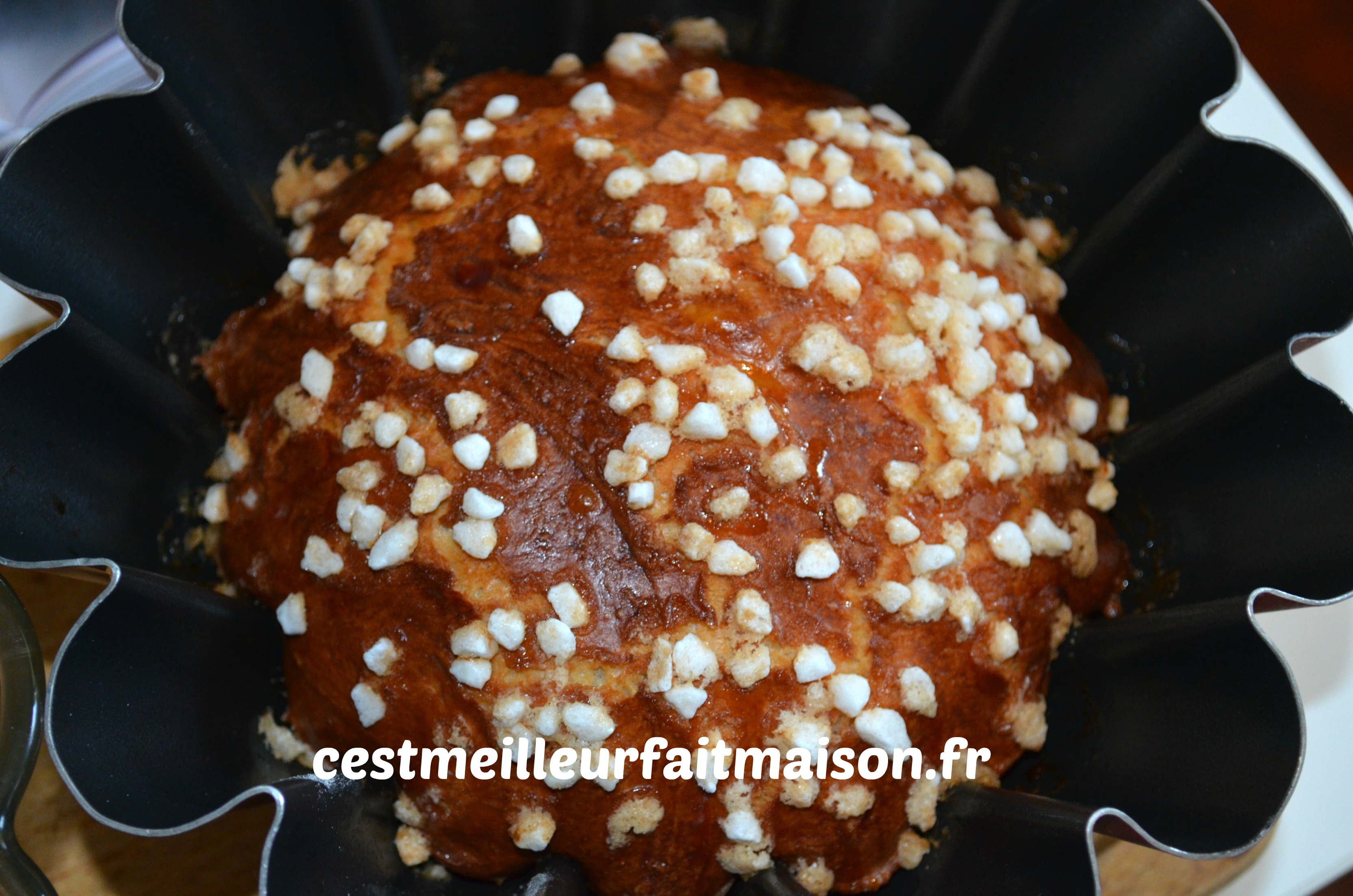 A la fin de la pousse, dorer les brioches à l’œuf battu et parsemer de sucre en grains. Enfourner les grosses brioches pour environ 25 min.