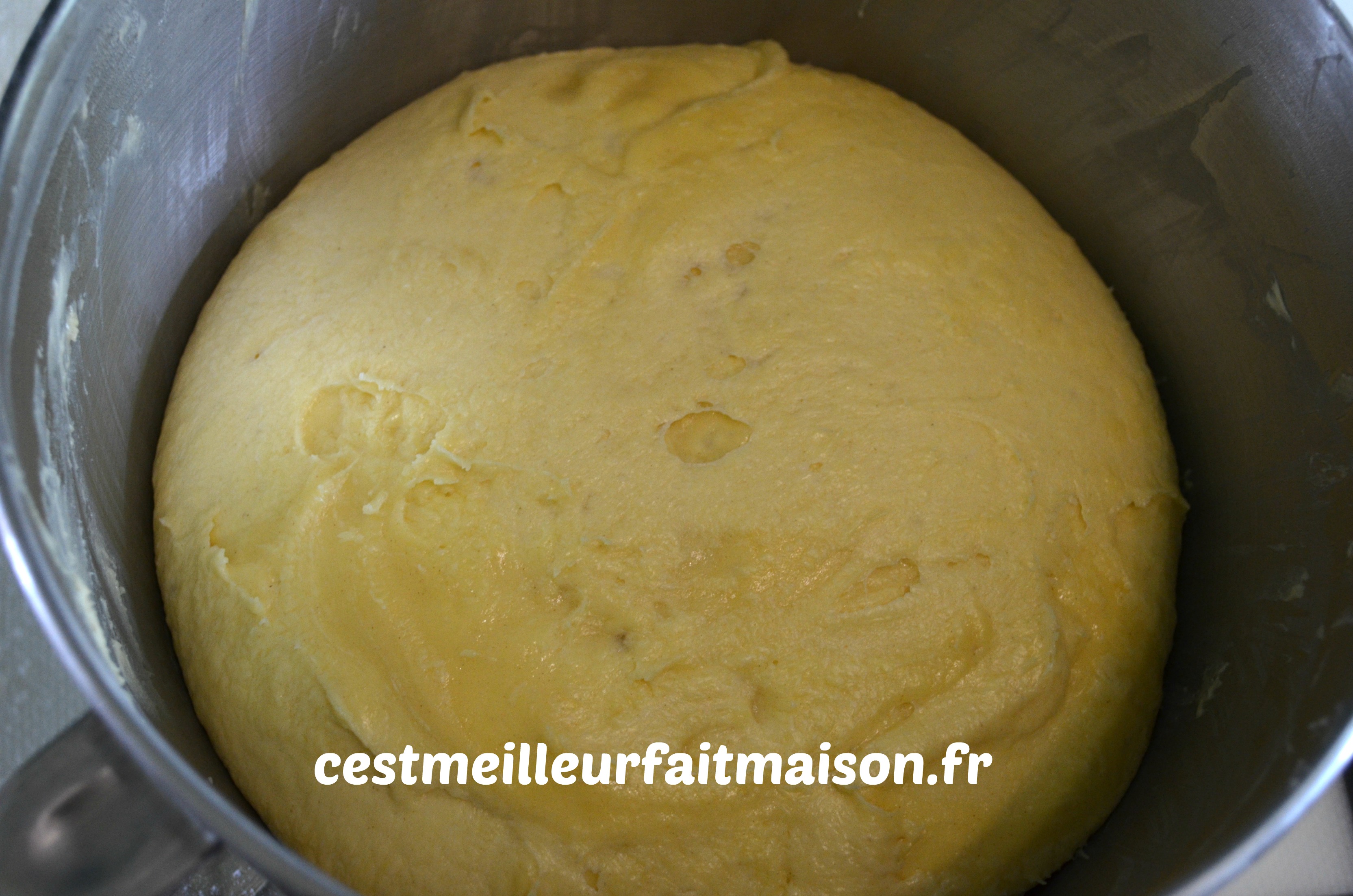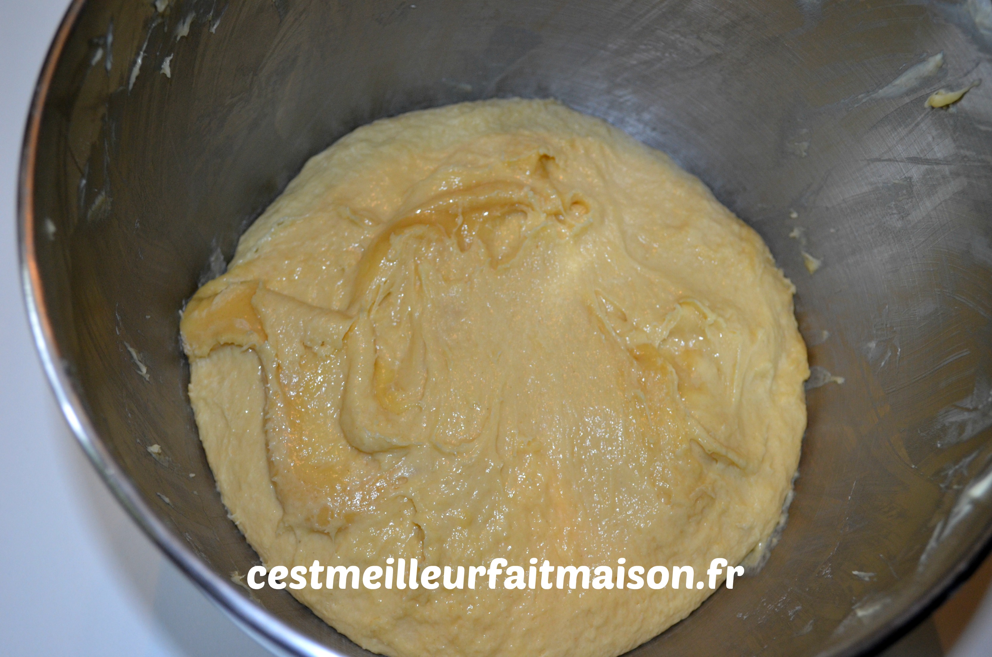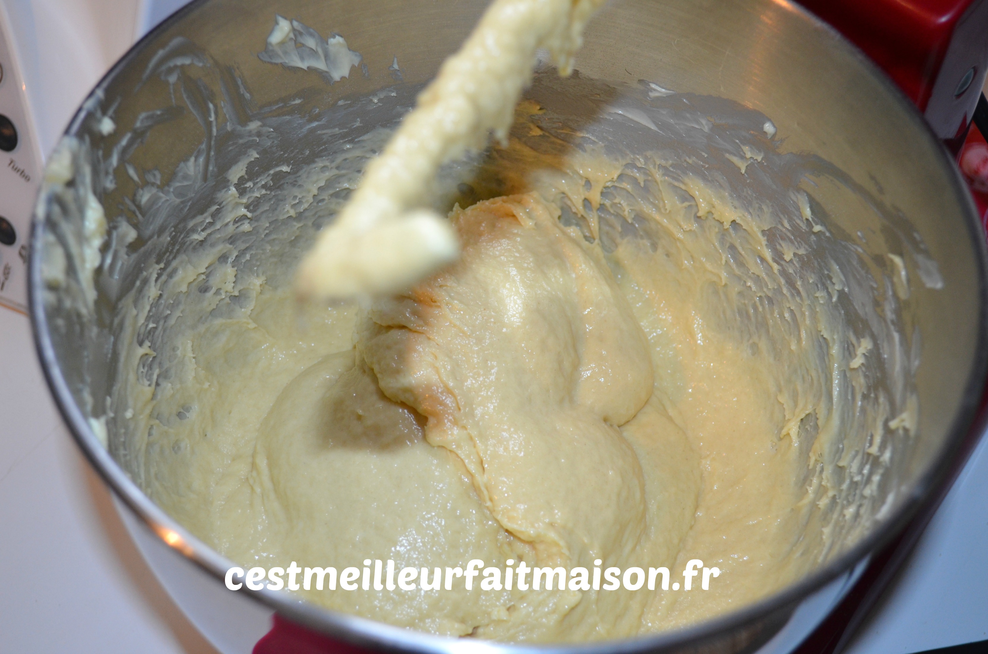 1- Dans la cuve du robot, verser la farine, le levain liquide, la levure fraîche, le sel, le sucre et les œufs. Pétrir 5 min à vitesse lente, puis 10 min à vitesse rapide (Vit 1 et 2 avec le Kitchenaid). Environ 4 min avant la fin du pétrissage, ajouter le beurre ramolli et la fleur d’oranger ou la vanille.