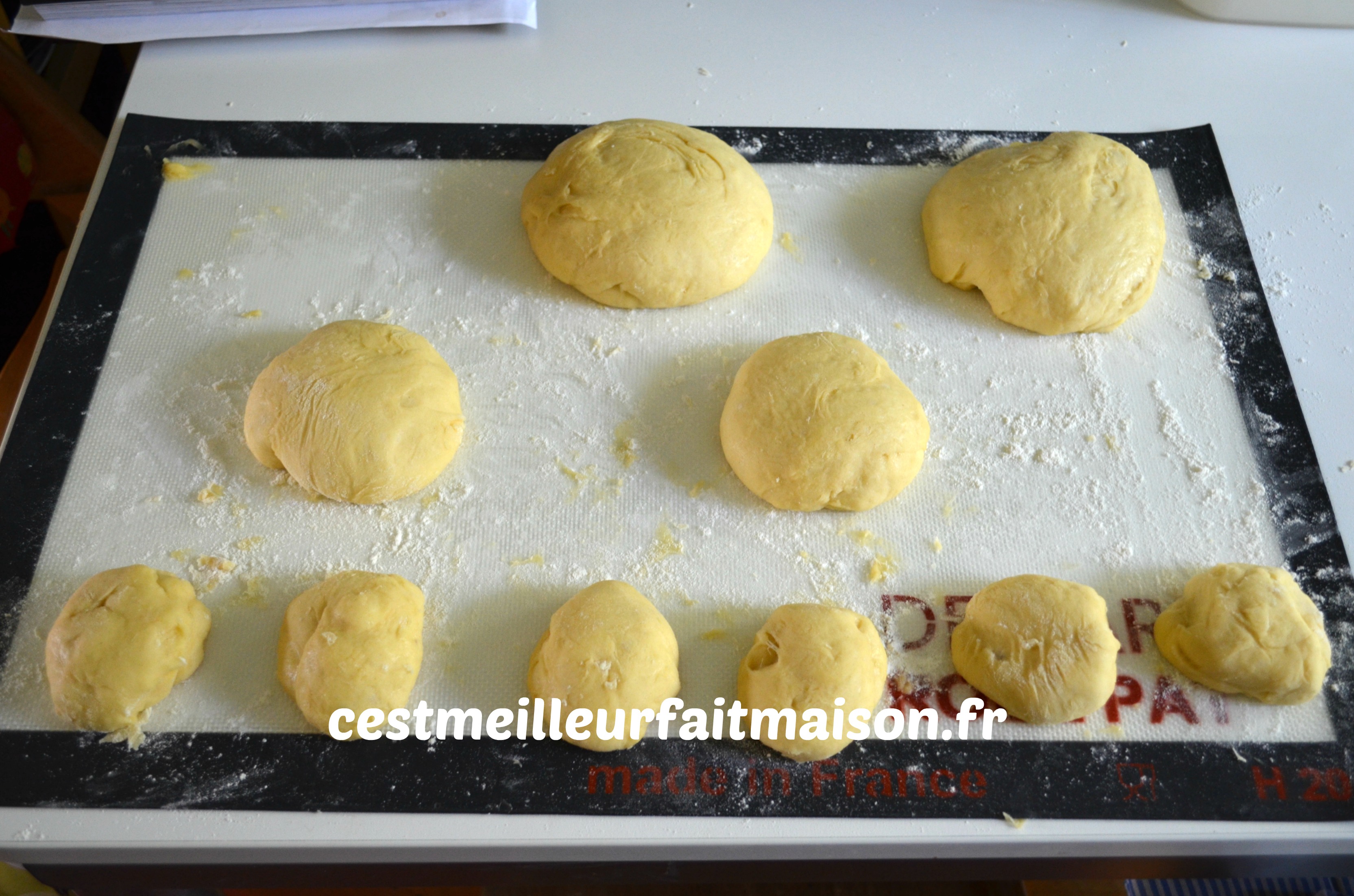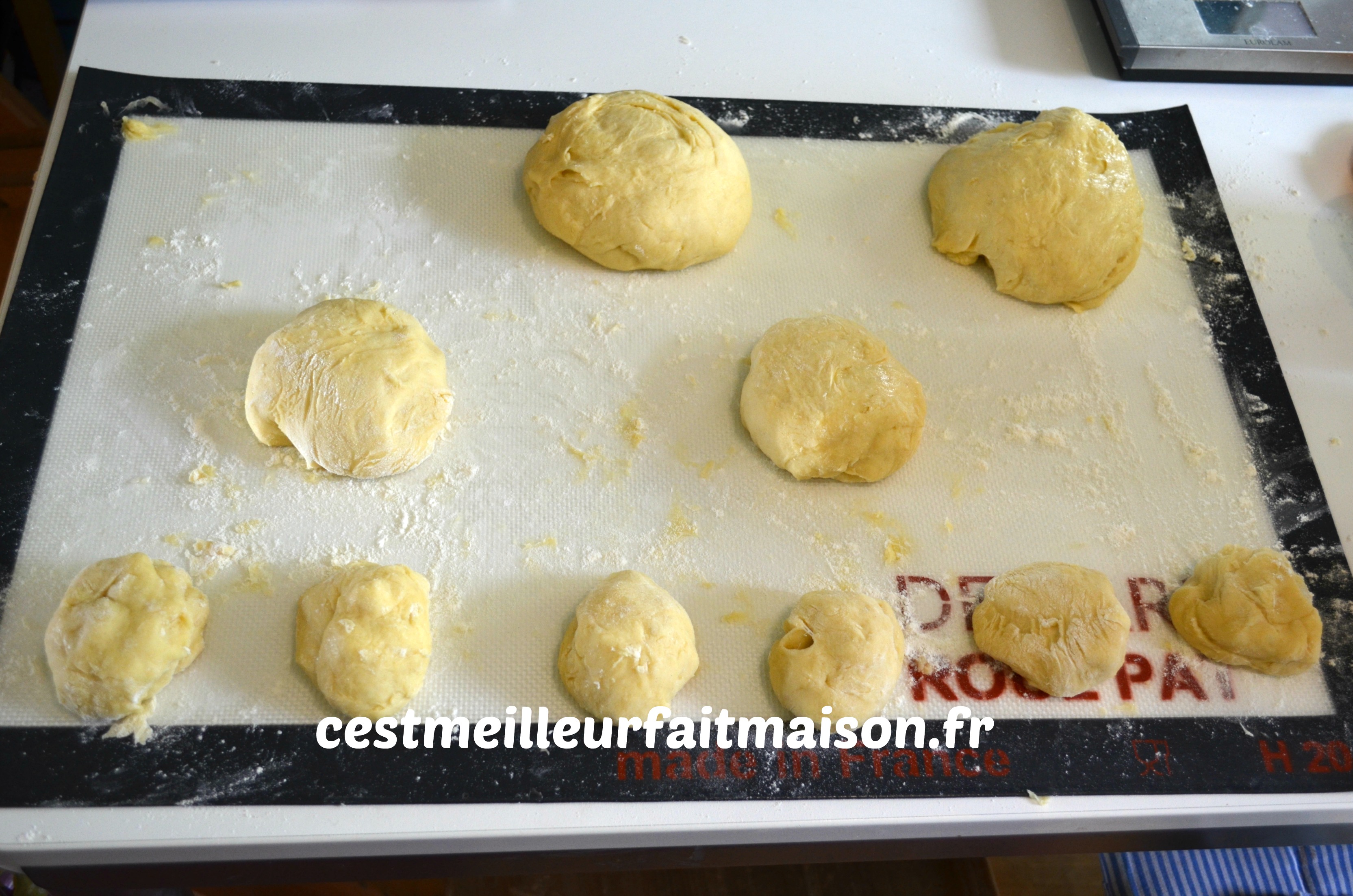 2- Fariner un plan de travail et diviser la pâte en fonction du volume et du nombre de vos moules. Former des boules sans trop travailler la pâte et laisser reposer, sous un linge, pendant 30 min.