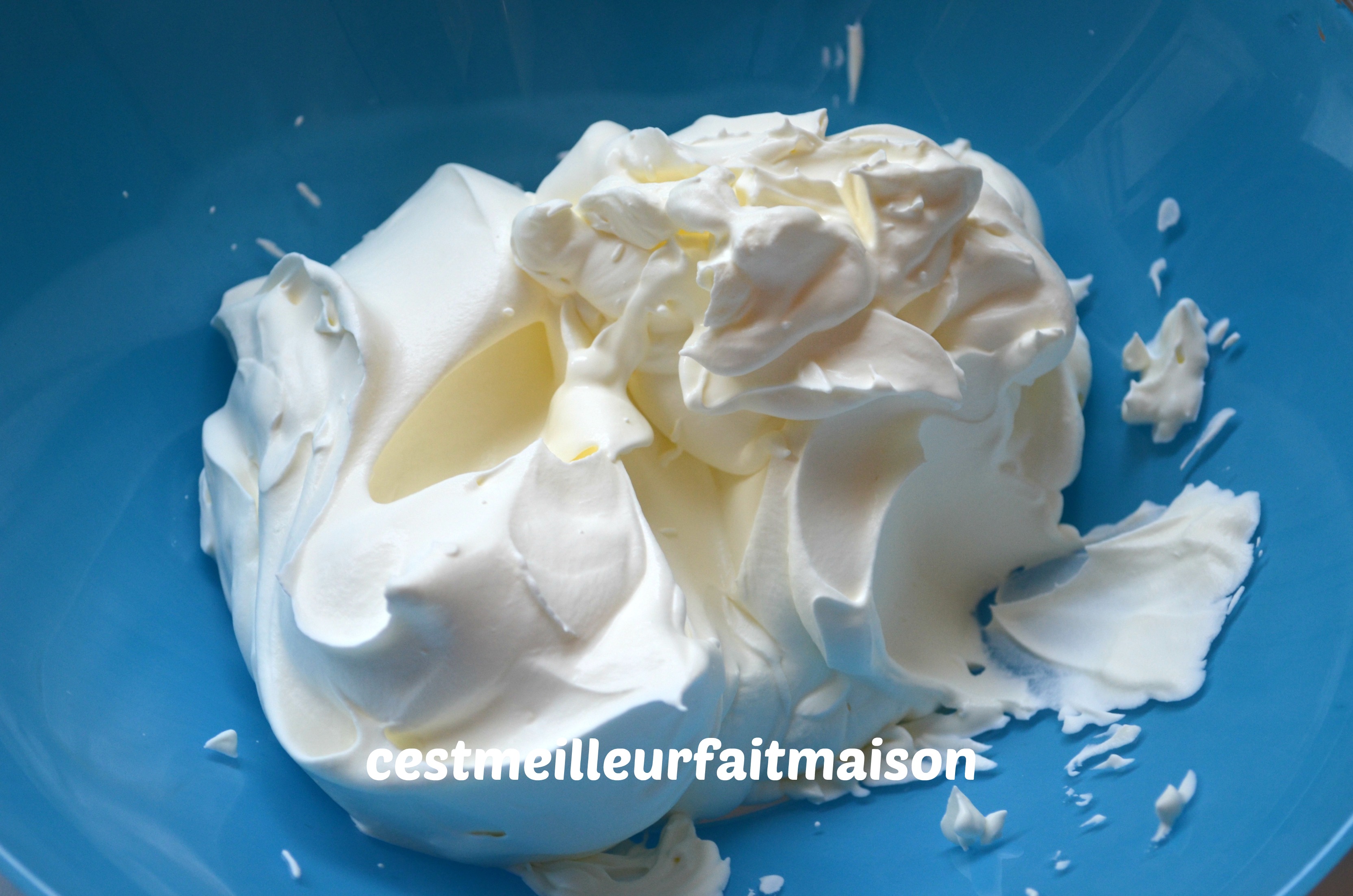 Verser la crème dans le bol muni du fouet et faire tourner jusqu’à obtenir une chantilly. Il faut surveiller pour que la crème ne se transforme pas en beurre. J’ai fouetté Vit 3/3.5 pendant moins de 5 min. Le temps dépend de la température de la crème et du bol.