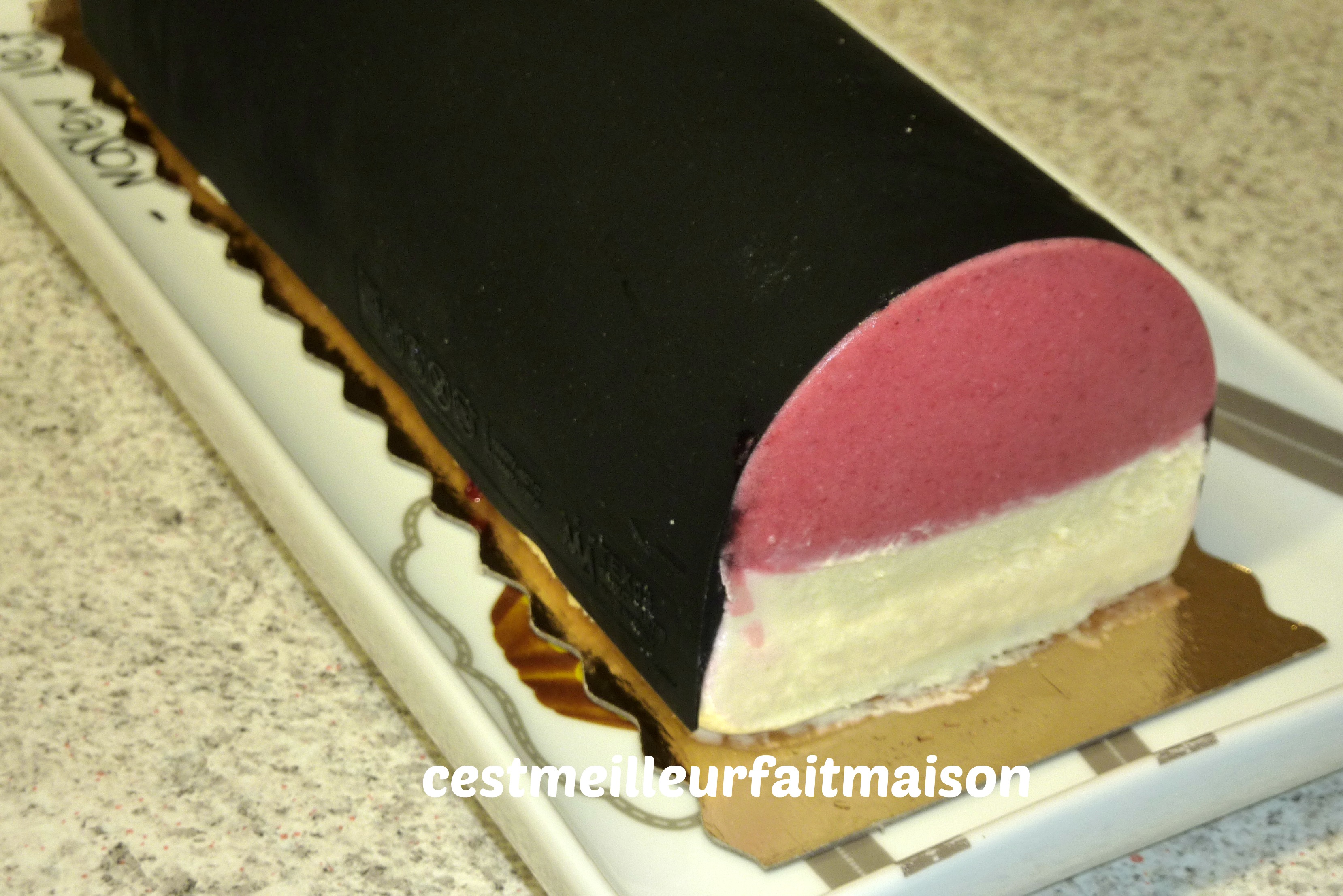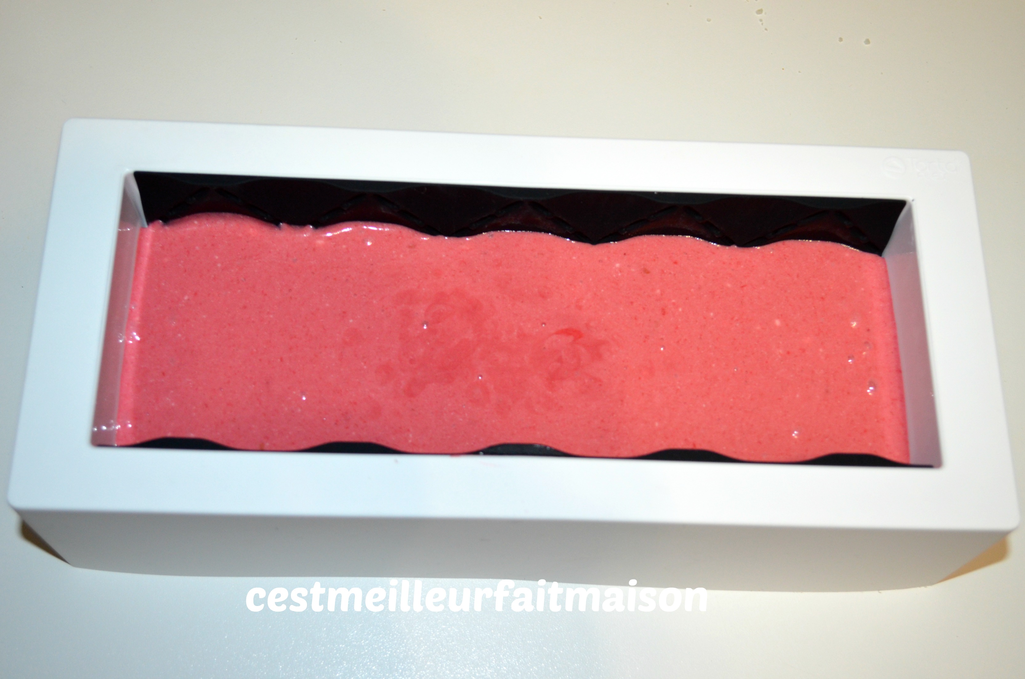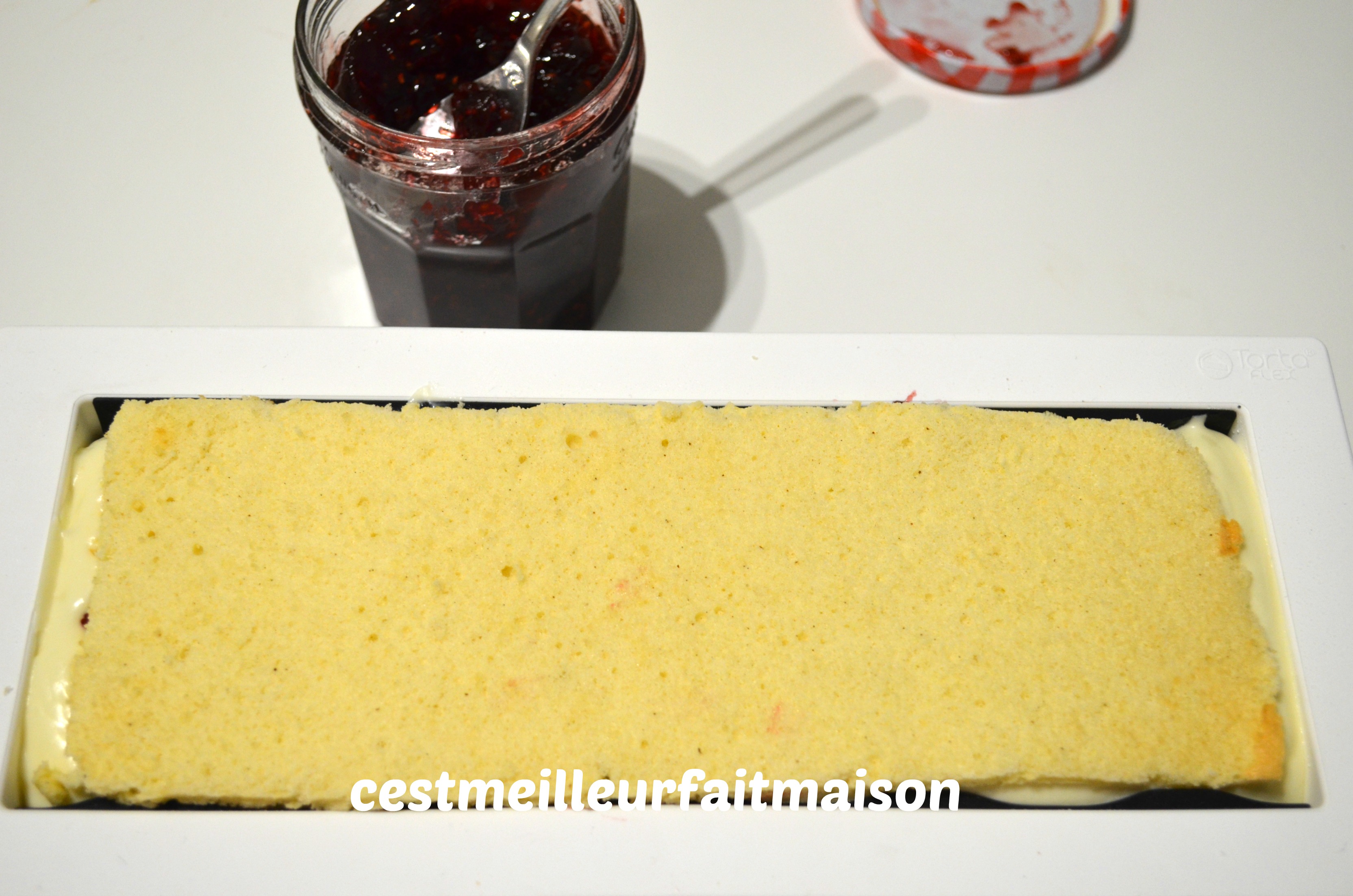 8- Tartiner de confiture de framboises le rectangle de génoise. Le placer au-dessus de la mousse au chocolat blanc (confiture à l’intérieur bien sûr).
