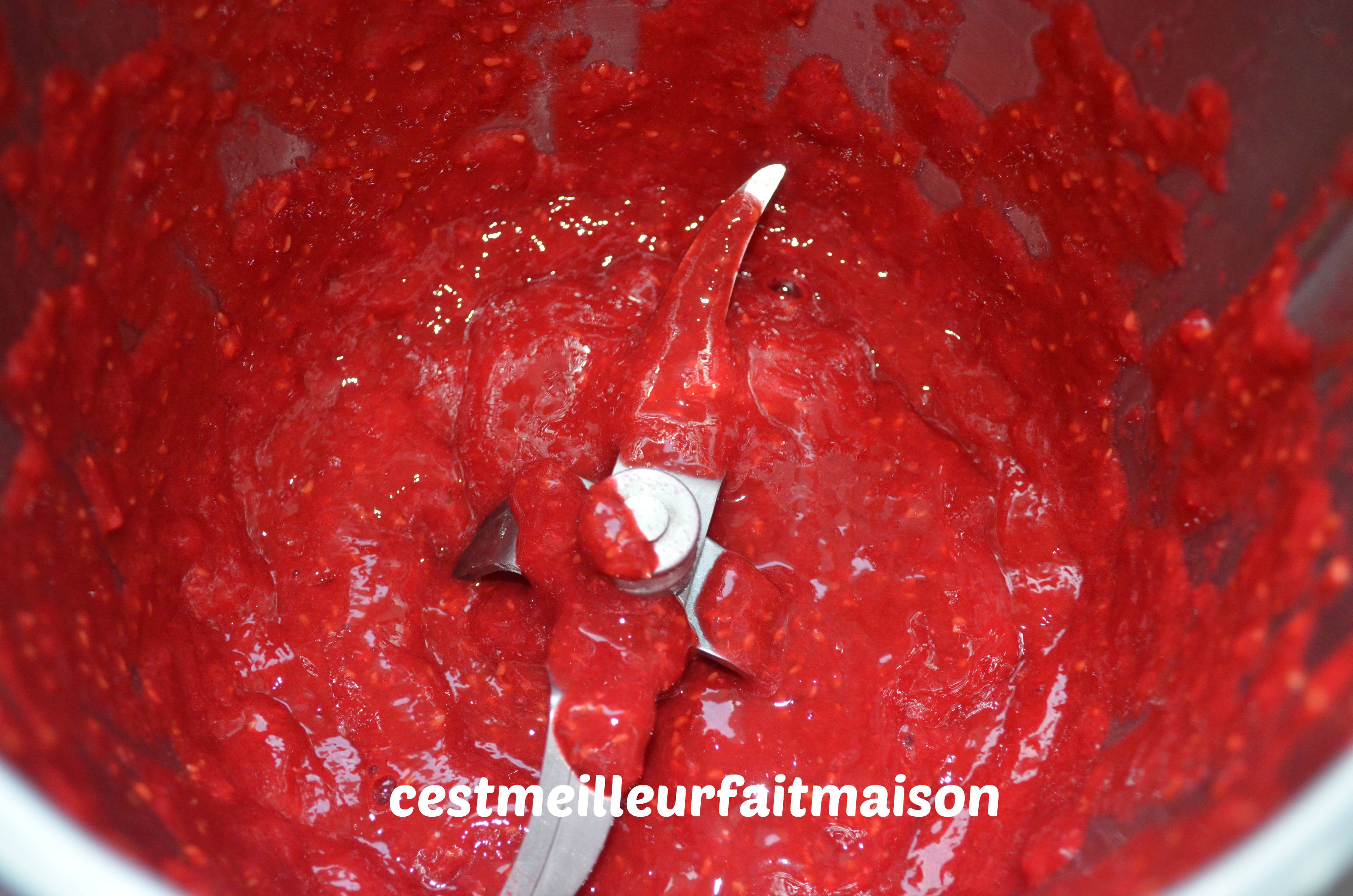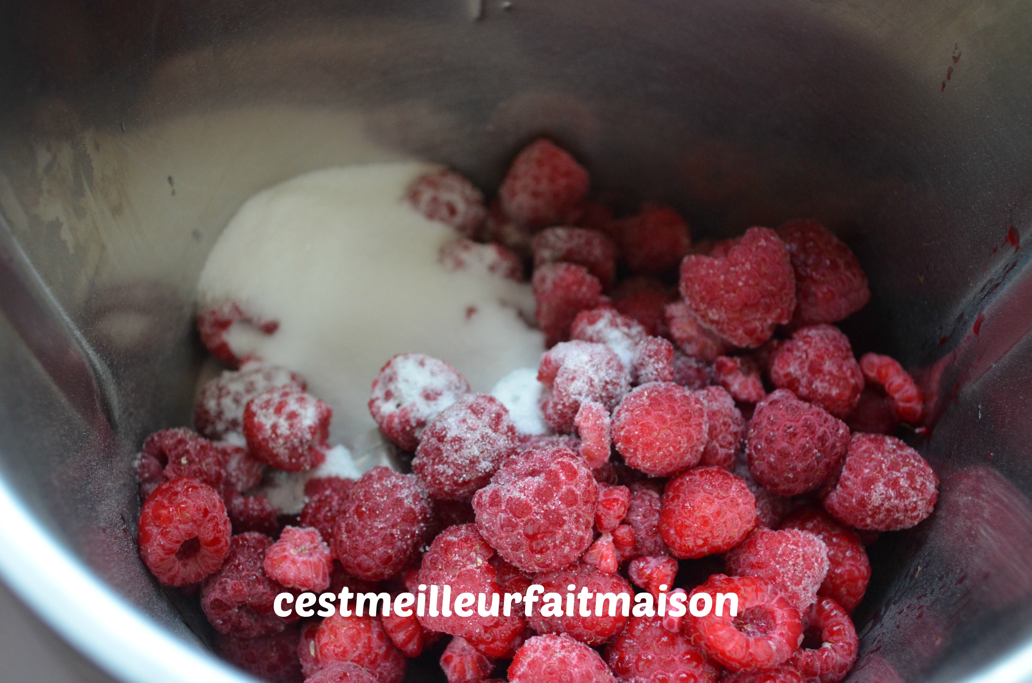 Laver le bol et y mettre les framboises avec le sucre. Mixer 8 sec/Vit 8.