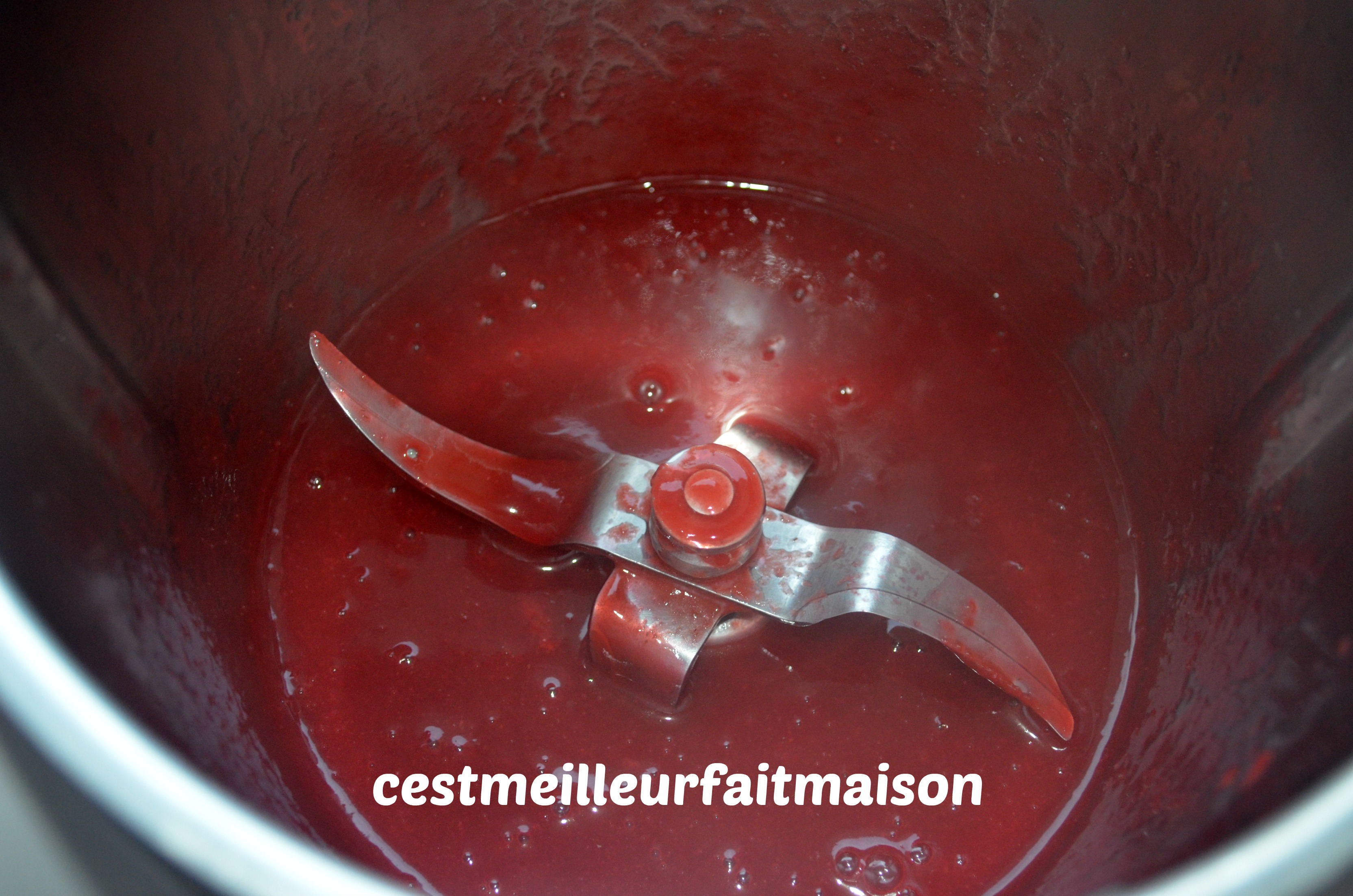 3- Remettre le coulis dans le bol avec la gélatine et chauffer 4 min/ 80°C/ Vit 2. A la fin du temps mixer 10 sec /Vit 3 et verser le coulis dans un récipient.
