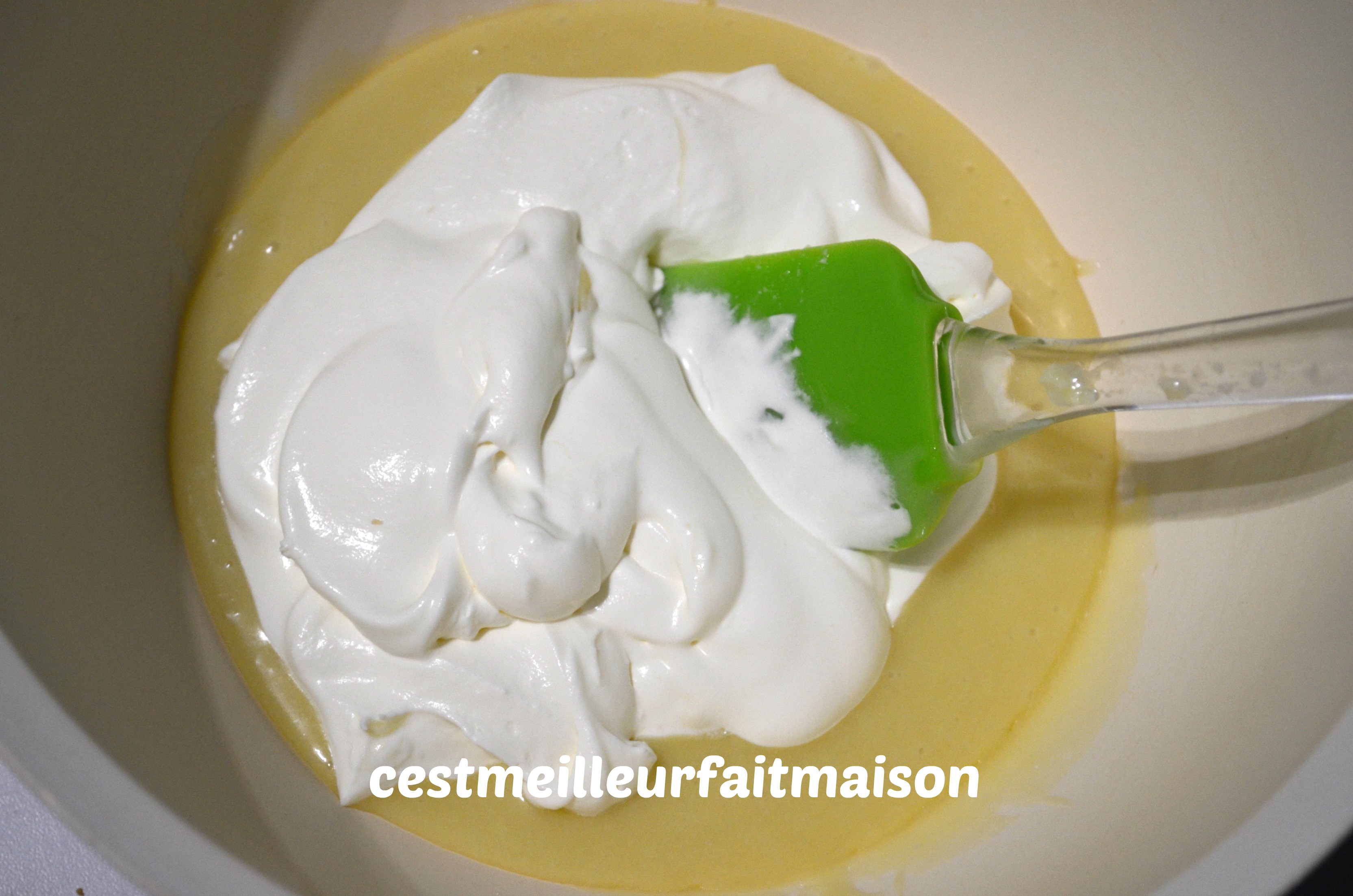 4- Attendre que le coulis refroidisse et y ajouter la moitié de la chantilly. Bien mélanger en soulevant la masse et verser dans le moule à bûche. Mettre le moule au congélateur.