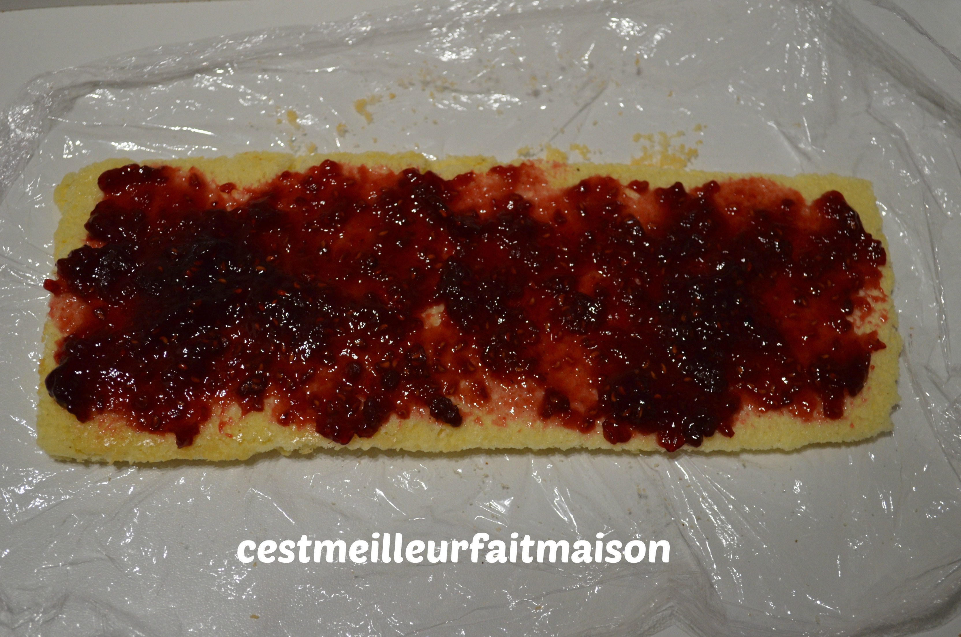 5- Pendant la prise de la mousse aux framboises, faire la génoise en suivant les indications du gâteau roulé indiquées ici. Suivre les indications de l’étape 1 à 3.