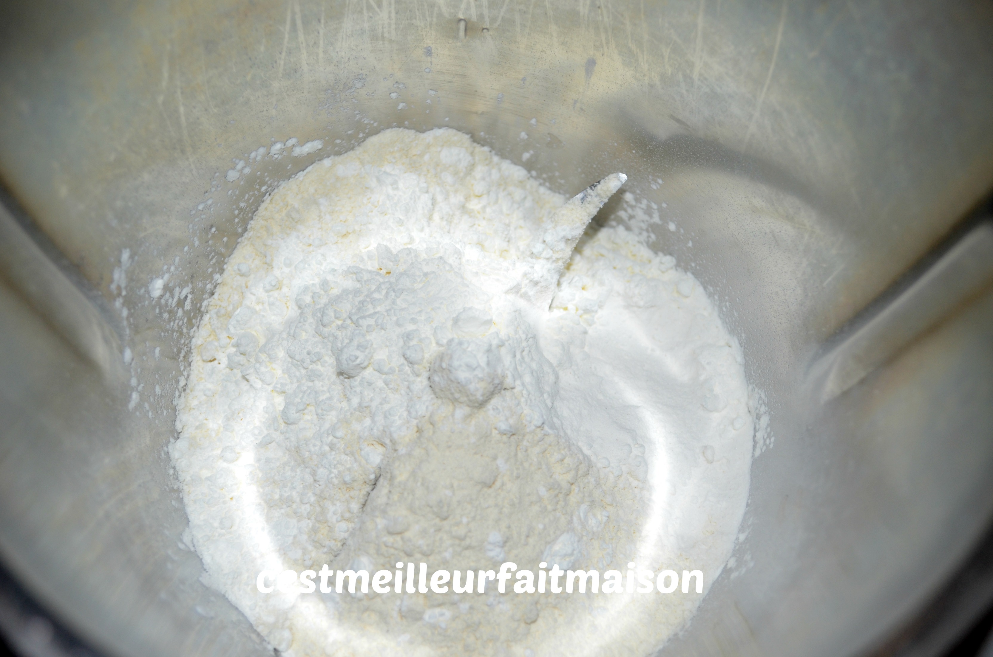 Dans le bol de Thermomix, mettre la farine, la Maïzéna et la levure. Mélanger 3 sec/Vit 3.