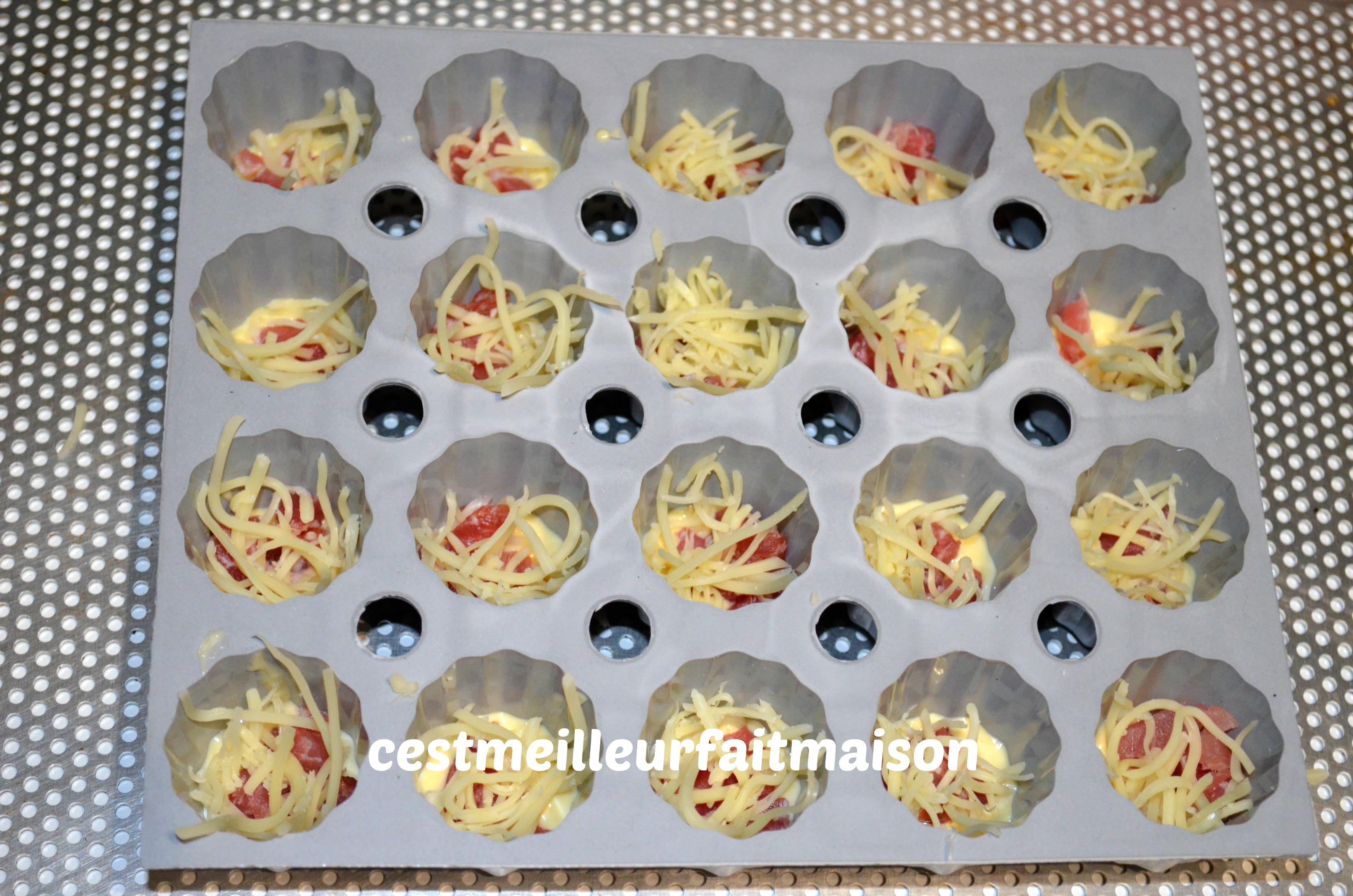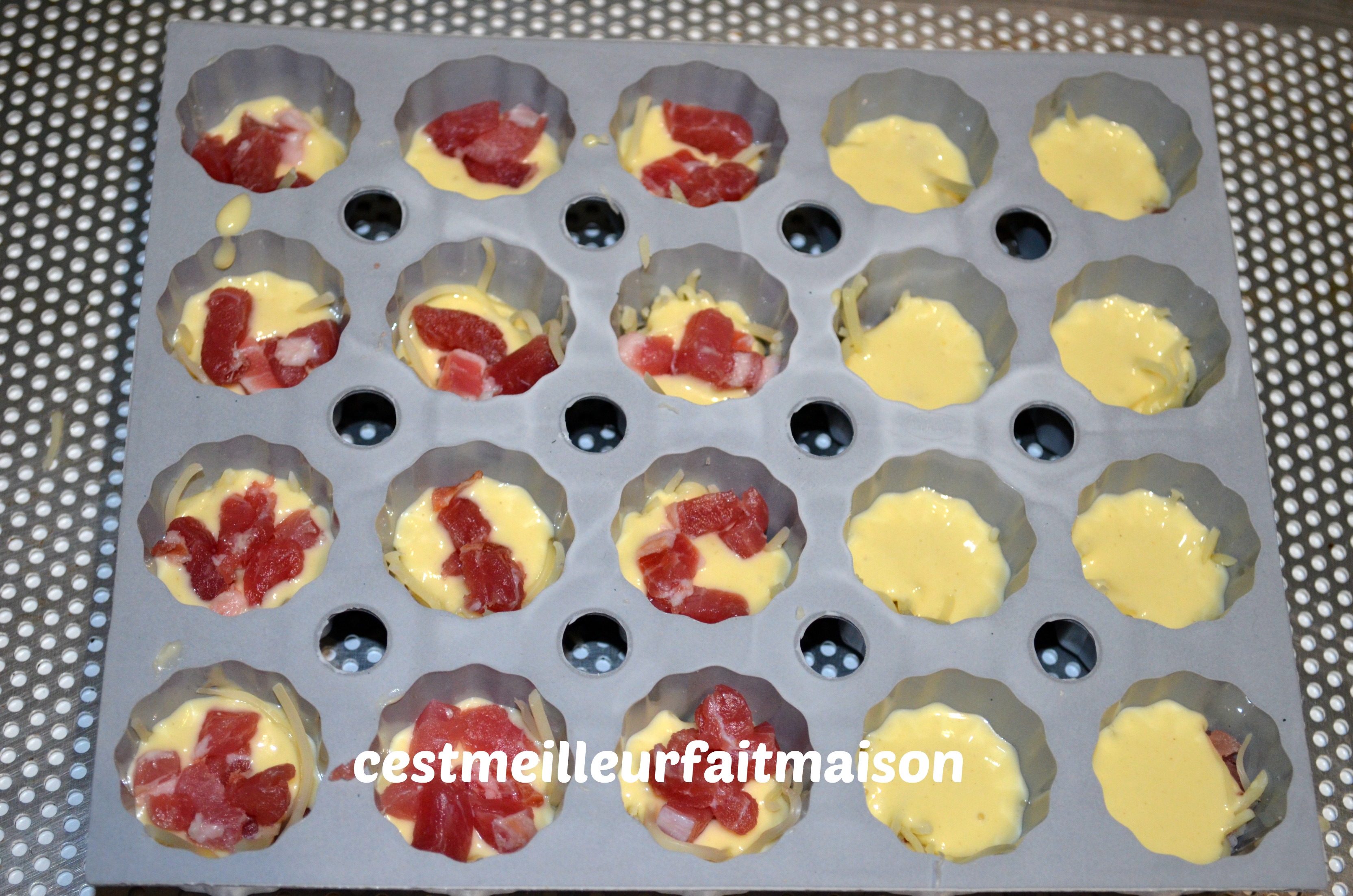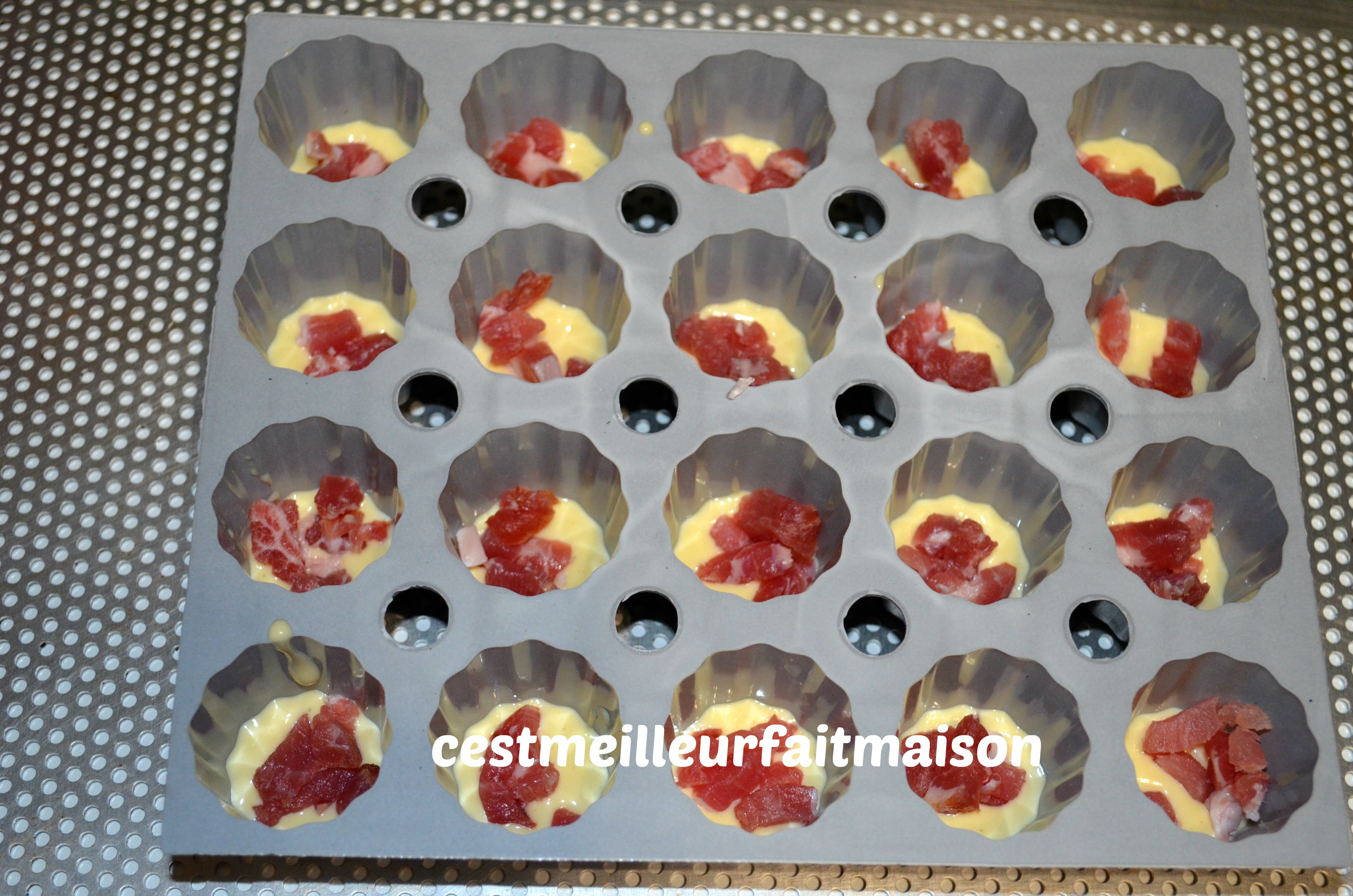 Verser un peu de préparation au fond de chaque empreintes, mettre un peu de lardon (pour cette fois j’ai mis aussi un peu de fromage râpé), recouvrir de pâte, remettre des lardons et finir par de la pâte en faisant en sorte que les empreintes ne soient remplies qu’au 2/3.