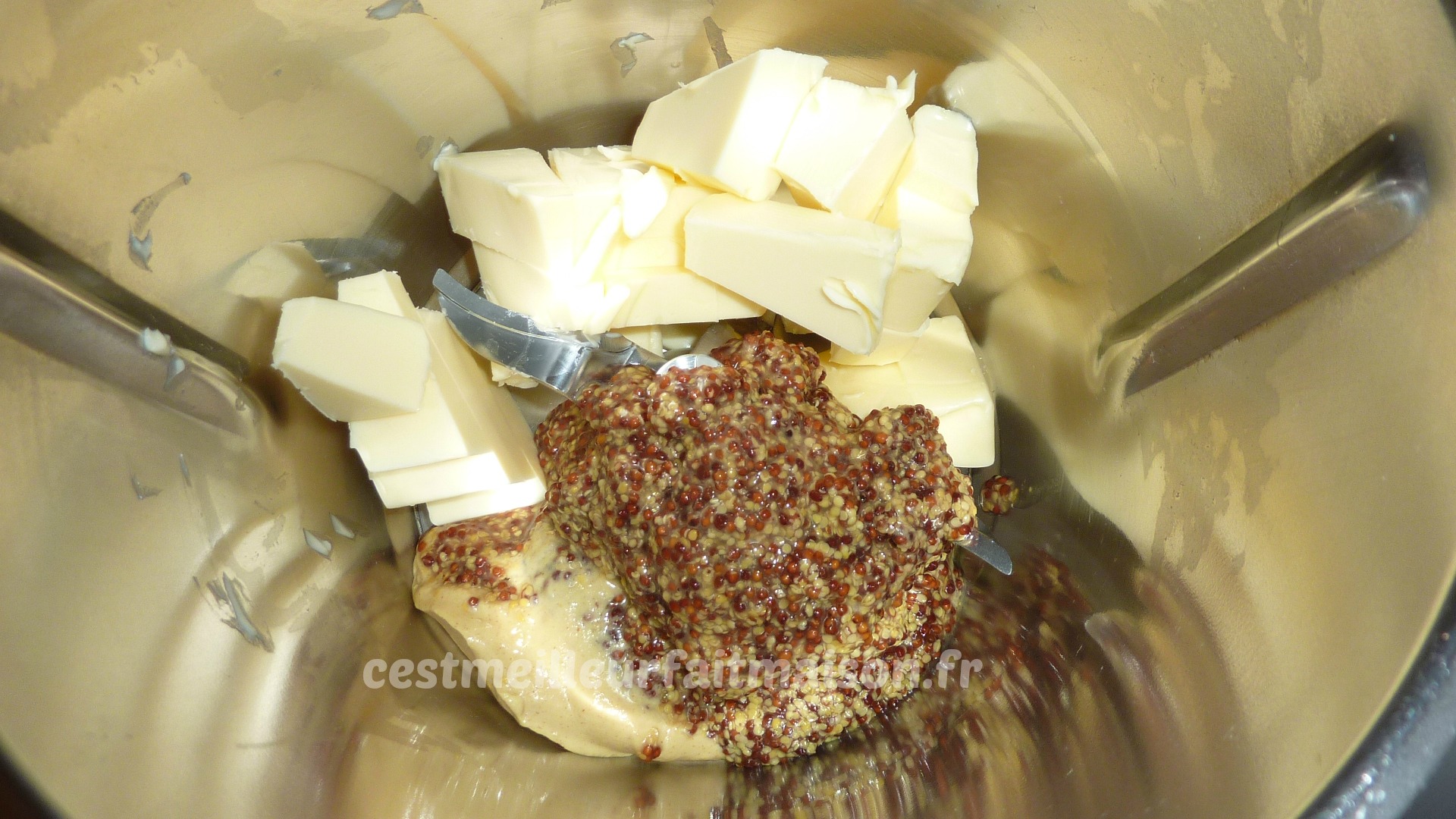 7- Après avoir nettoyé le bol, mettre le beurre et les moutarde et mixer 3 min/Sens Inverse/Vit 3.