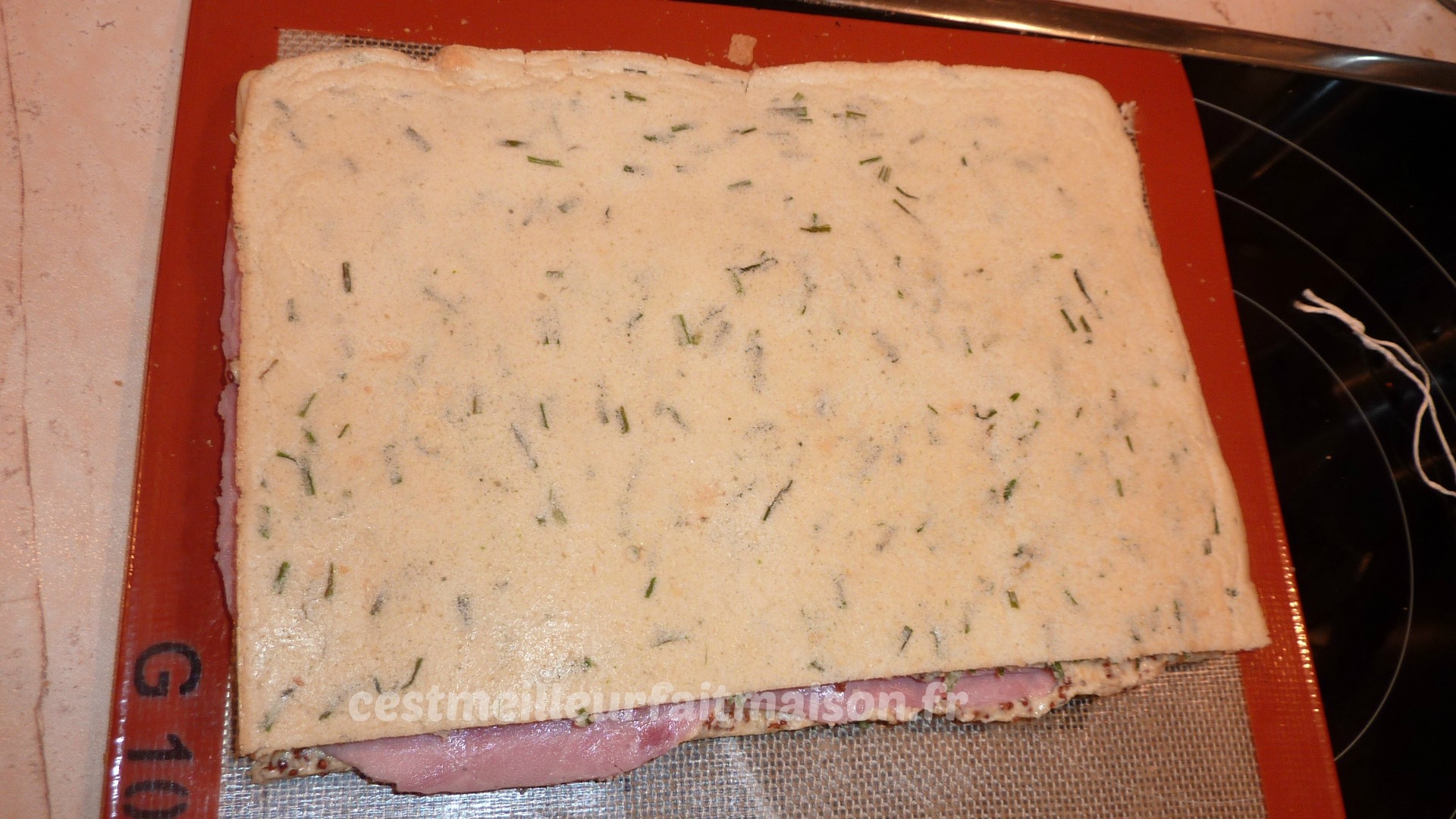 8- Une fois que le biscuit est froid, étaler la préparation au beurre sur toute la surface. Couper le biscuit en deux et mettre les tranches de dinde sur une moitié. Recouvrir avec l’autre moitié. Filmer et mettre au frais plusieurs heures.
