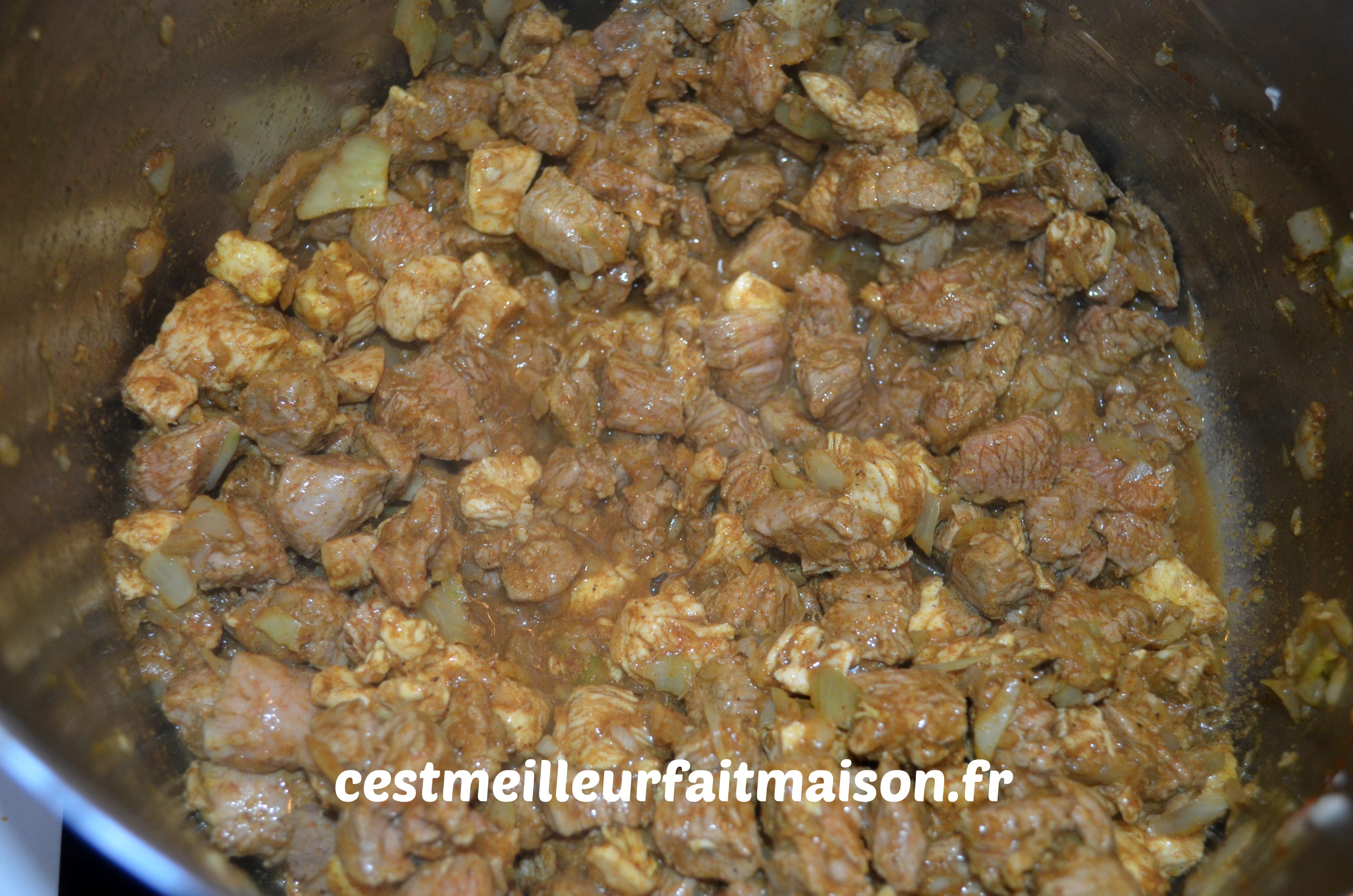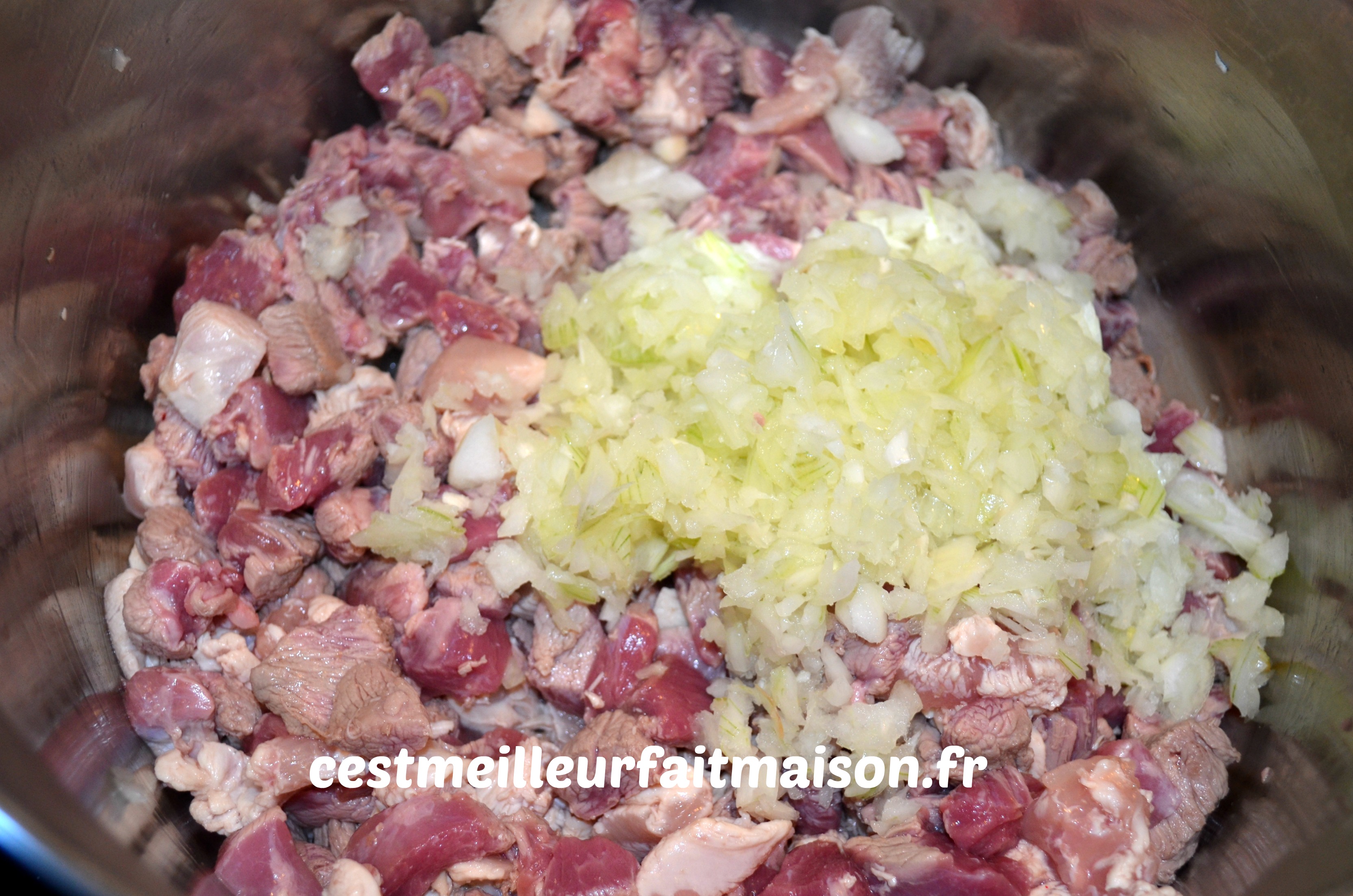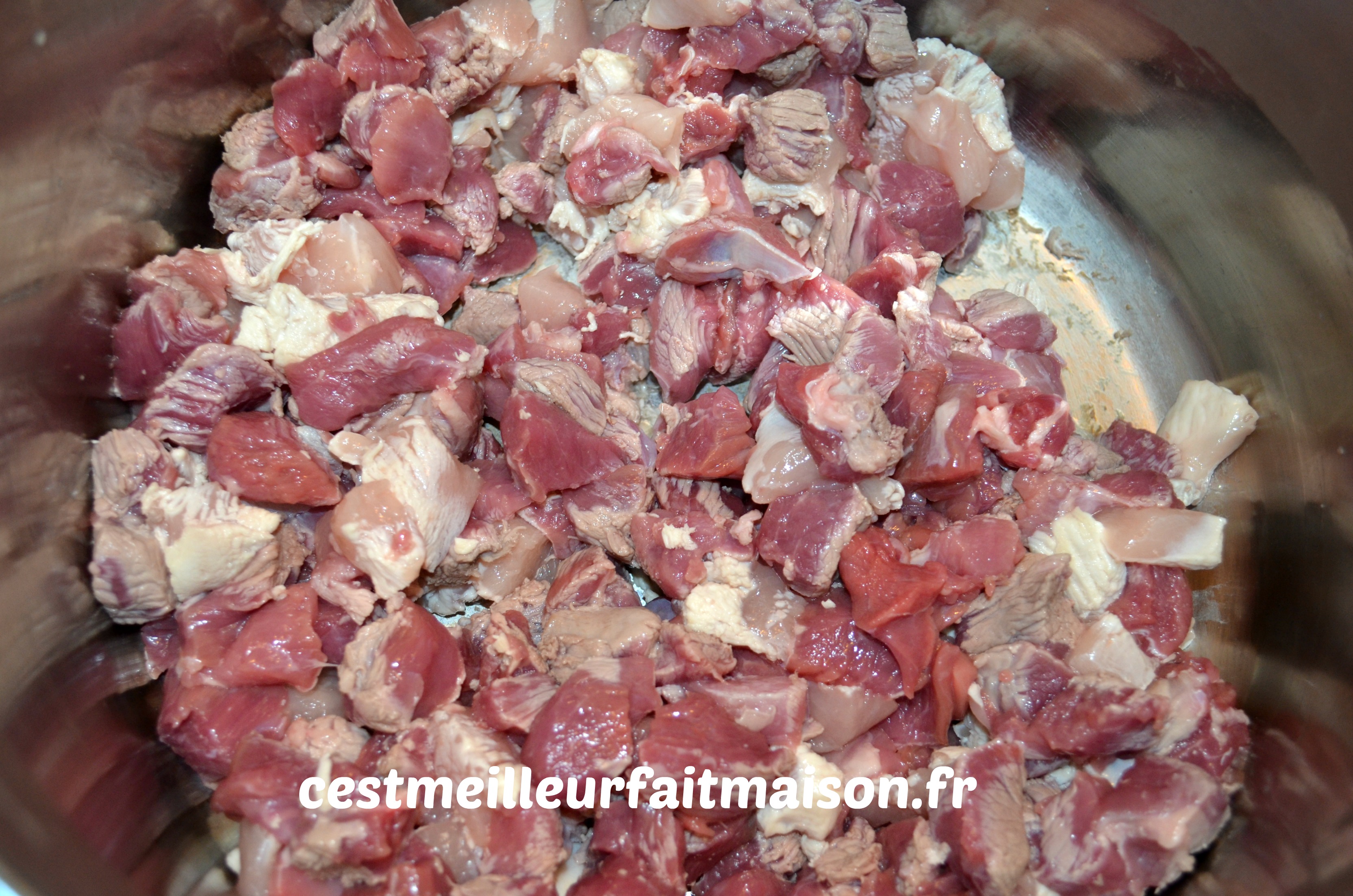 1- Couper la viande en petits dés et la faire revenir dans une cocotte sans ajout de matière grasse pour l’instant.