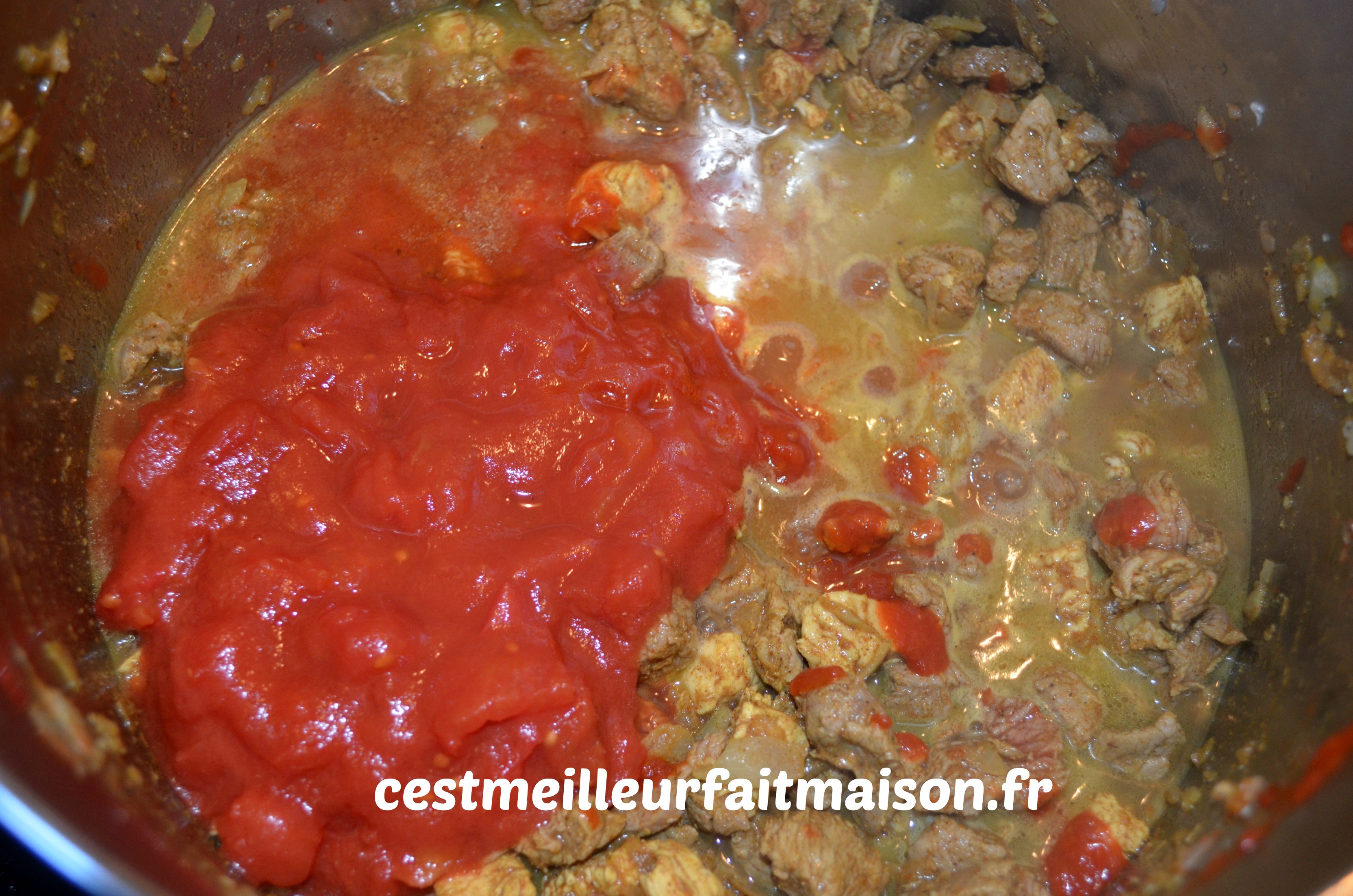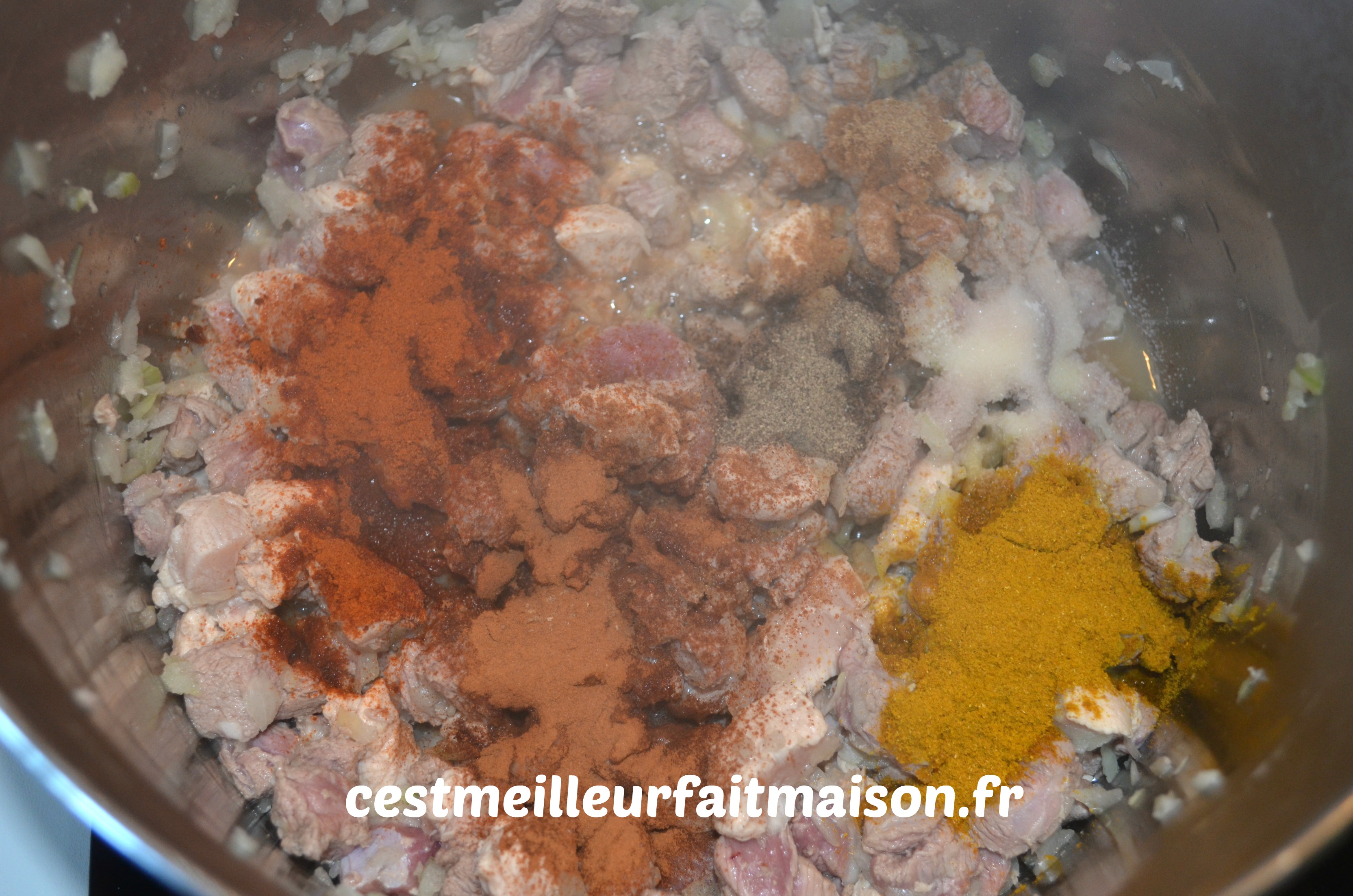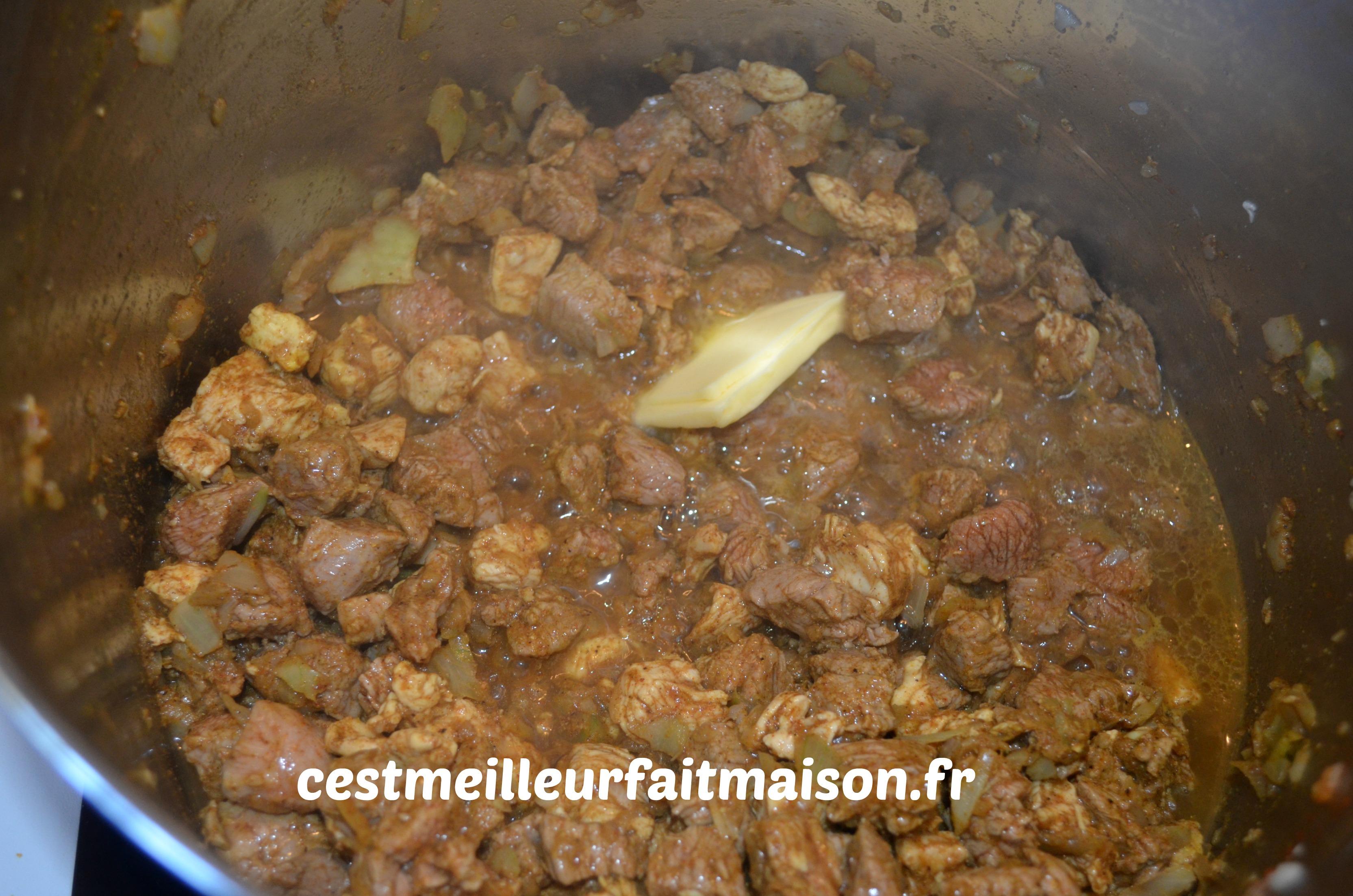 1- Couper la viande en petits dés et la faire revenir dans une cocotte sans ajout de matière grasse pour l’instant.