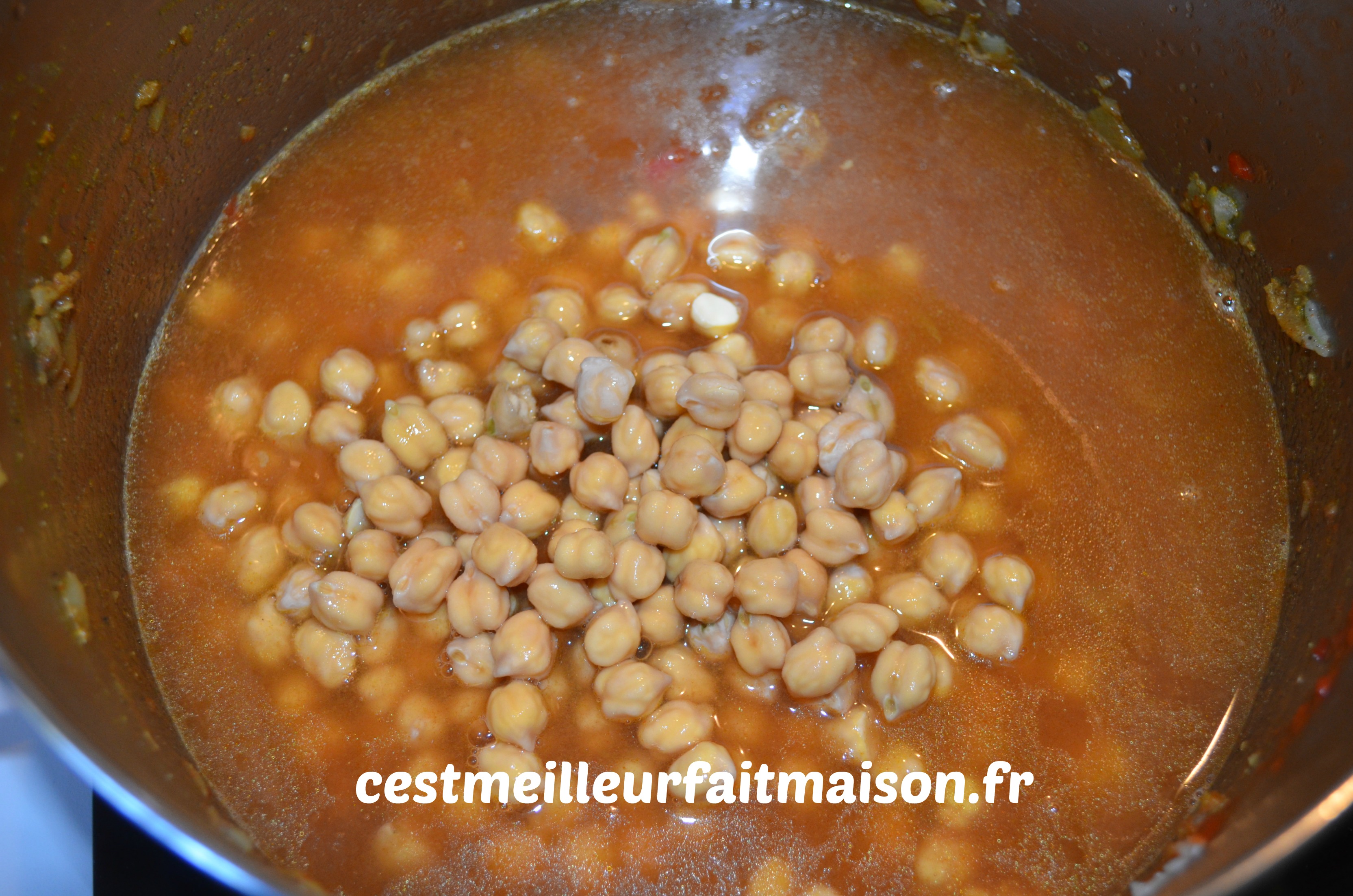 4- Ajouter ensuite le concentré de tomate, la boite de tomates concassées et couvrir d’eau. Ajouter les pois chiches et bien mélanger. Laisser mijoter.