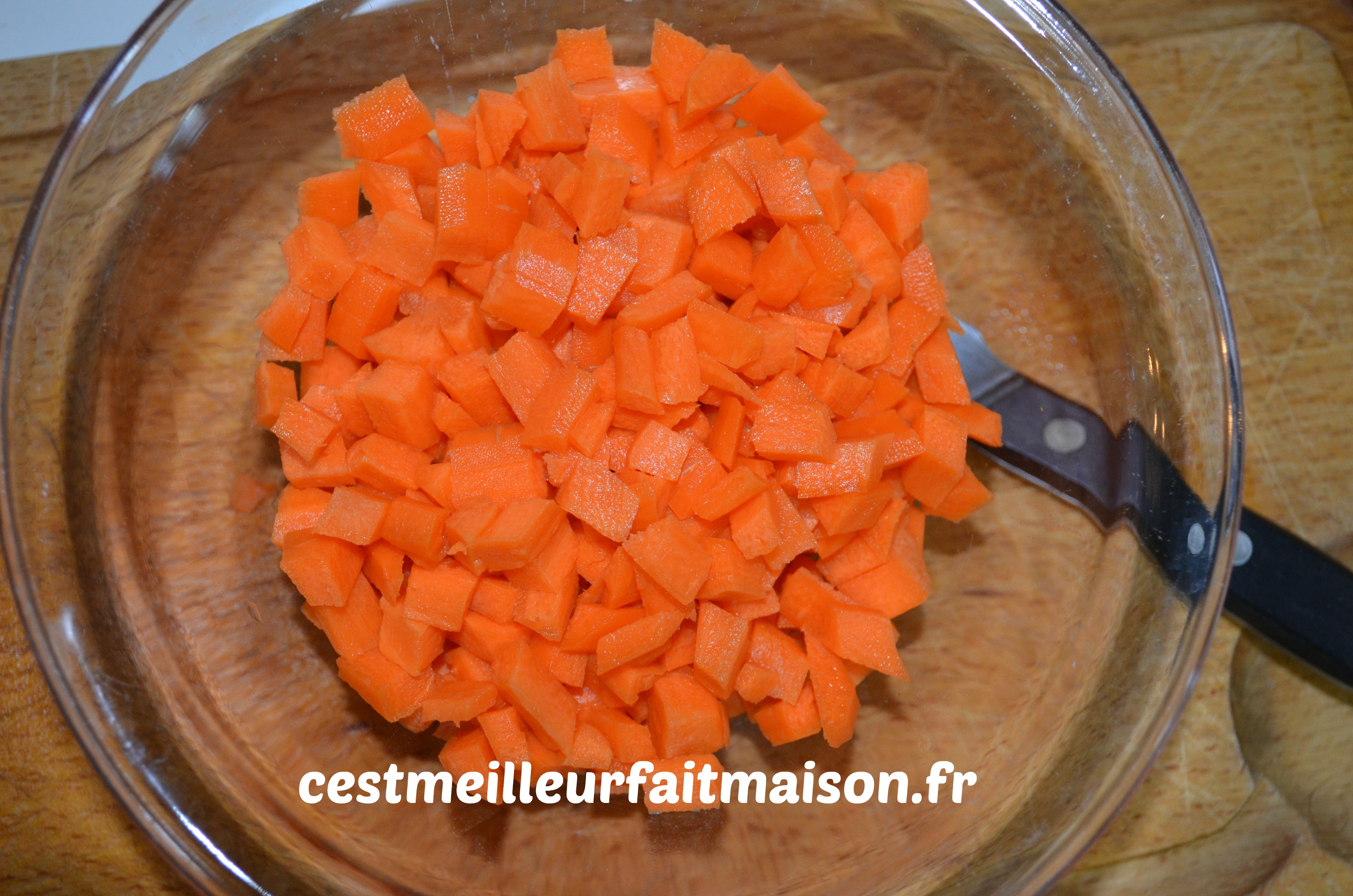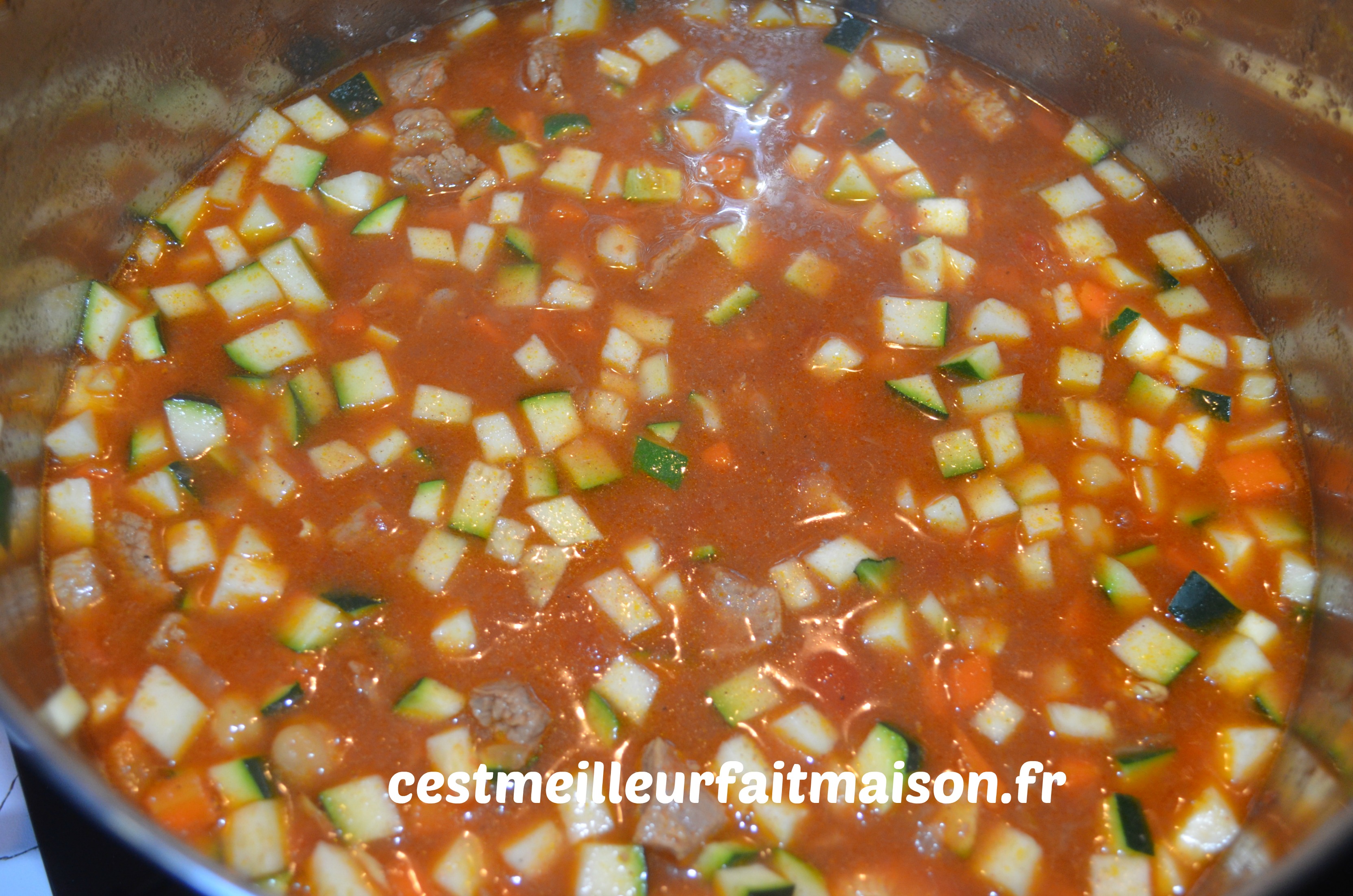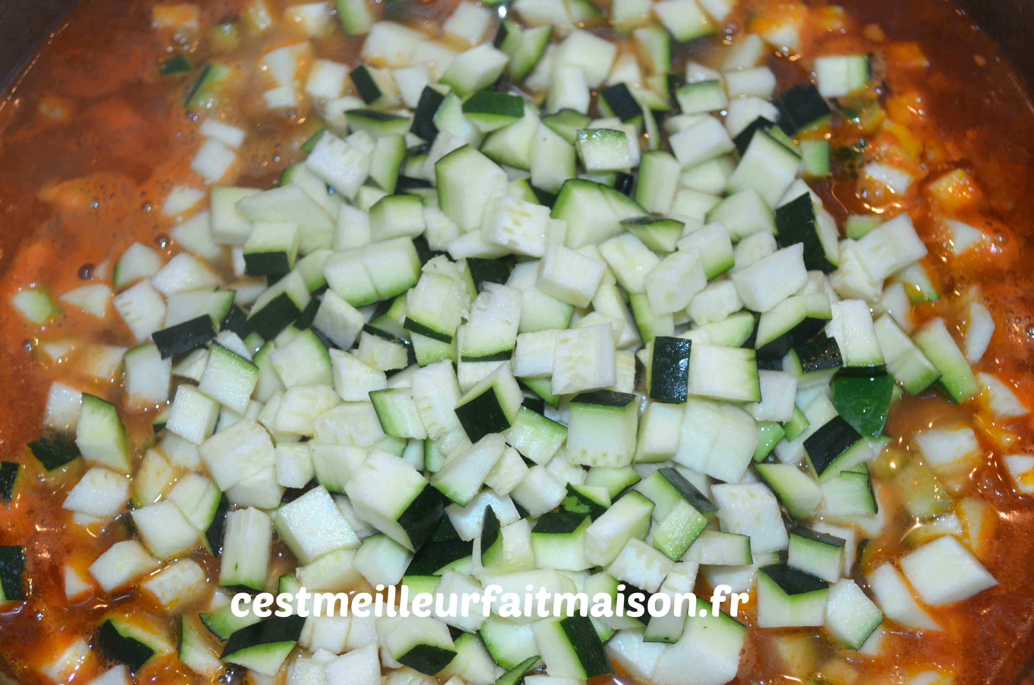 5- Couper les carottes et les courgettes en petits dés. Les ajouter dans la cocotte et laisser mijoter 1h30 min.