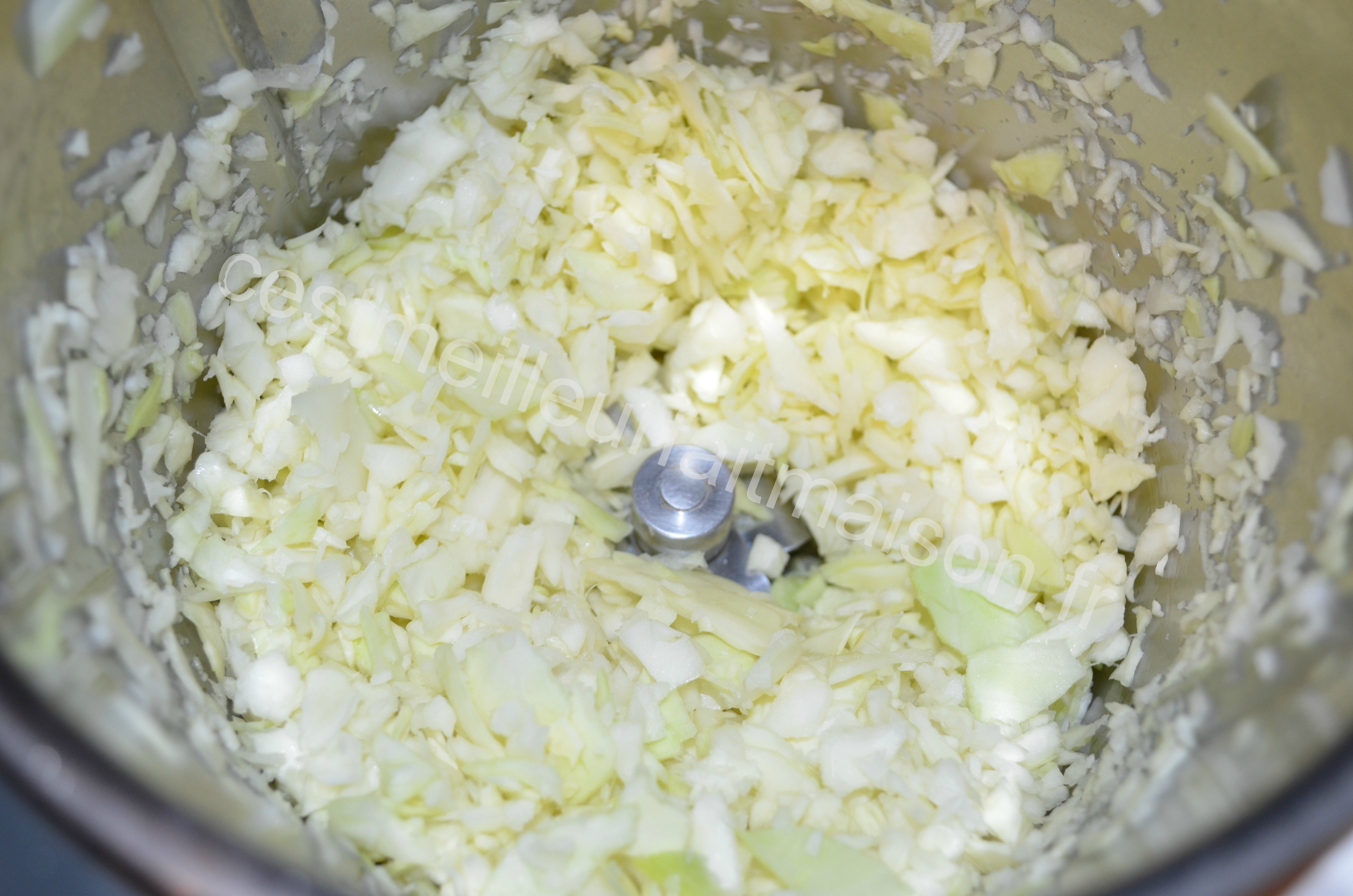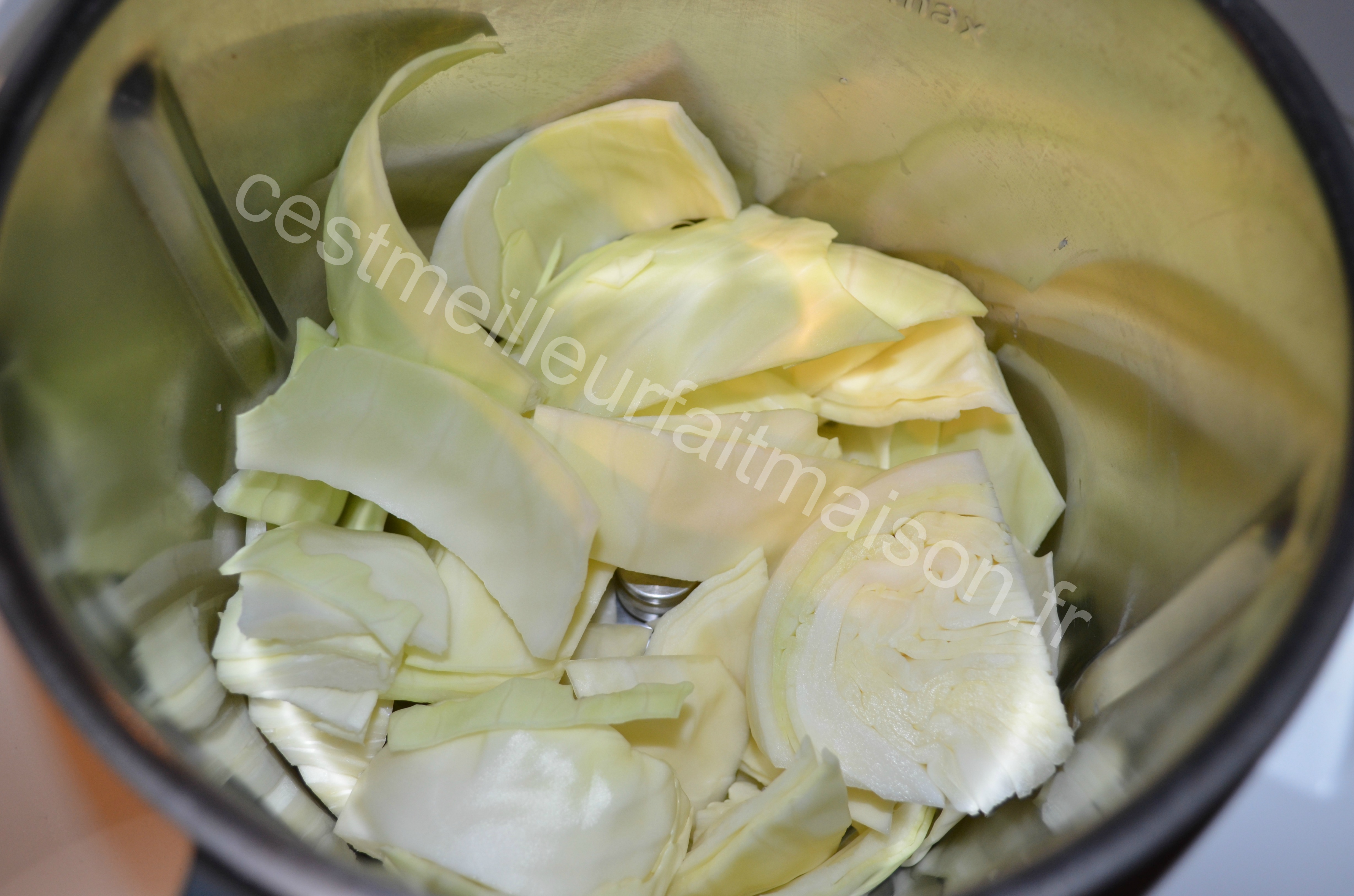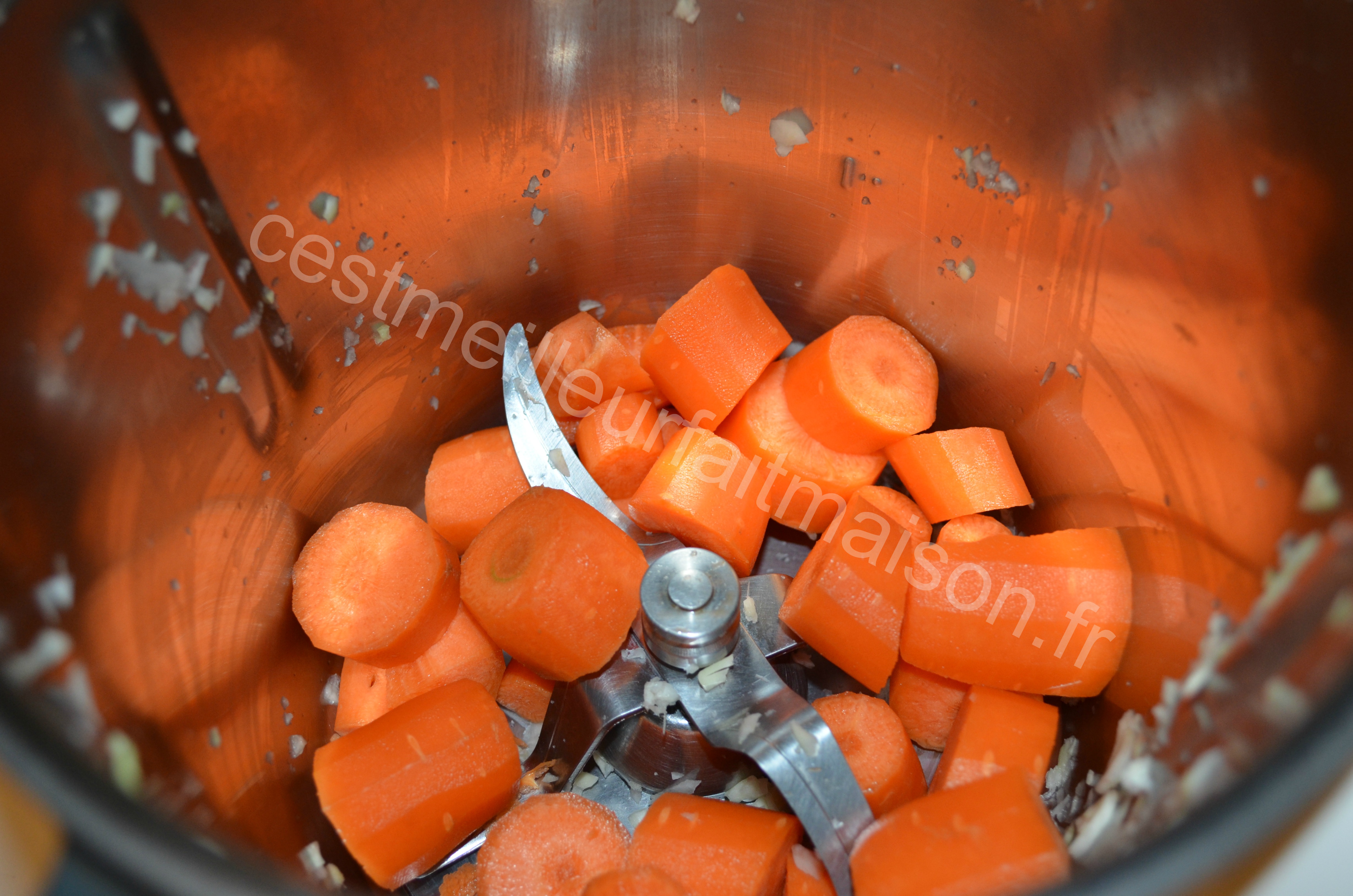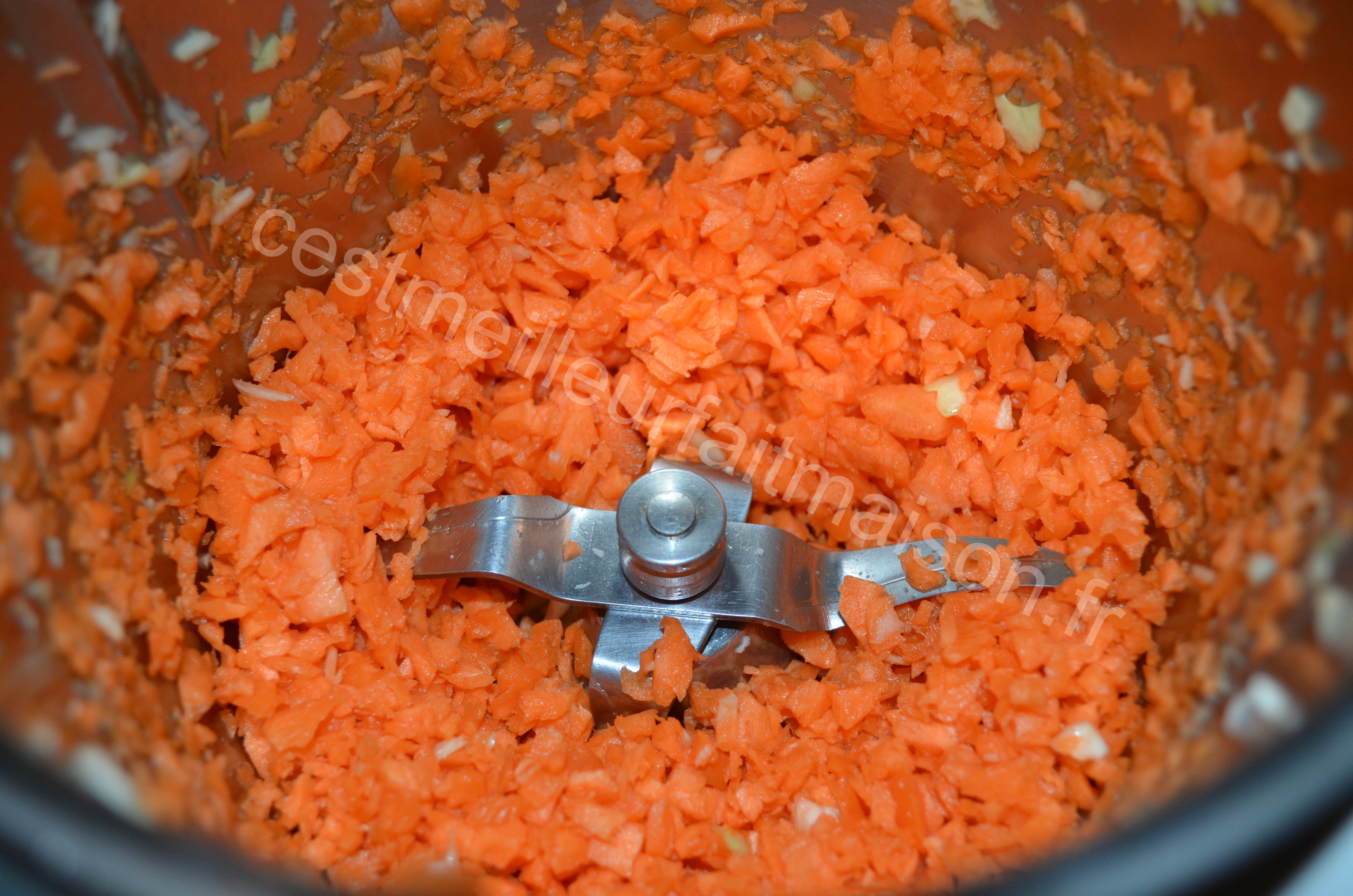 1- Couper le chou en gros morceaux et le placer dans le bol du Thermomix. Mixer 3 sec Vitesse 5. Faire la même chose avec les carottes.