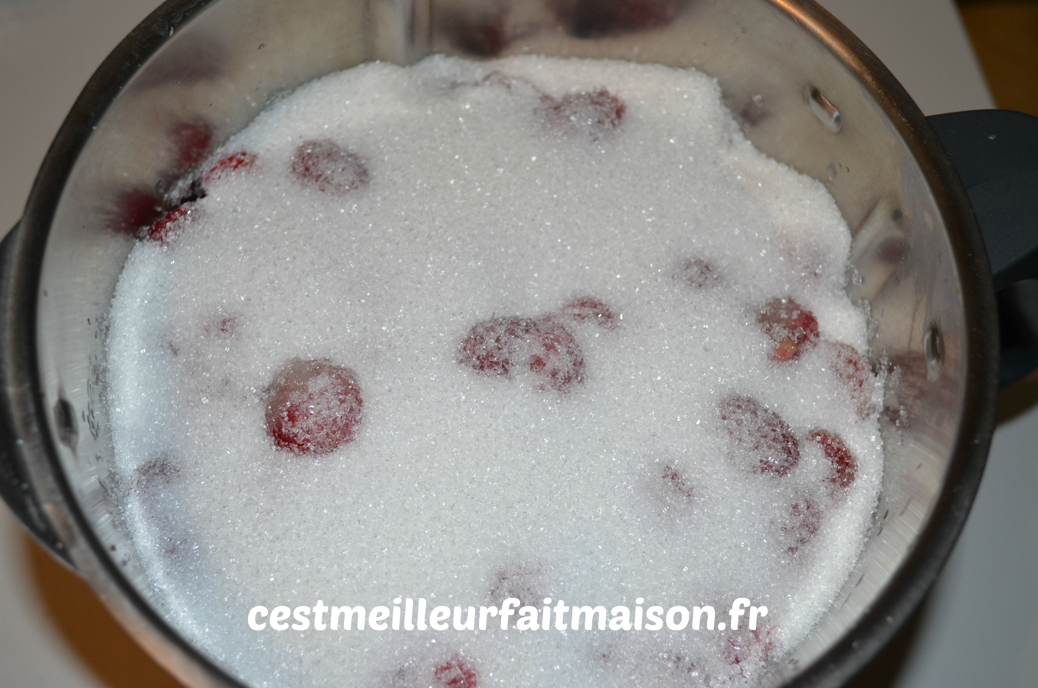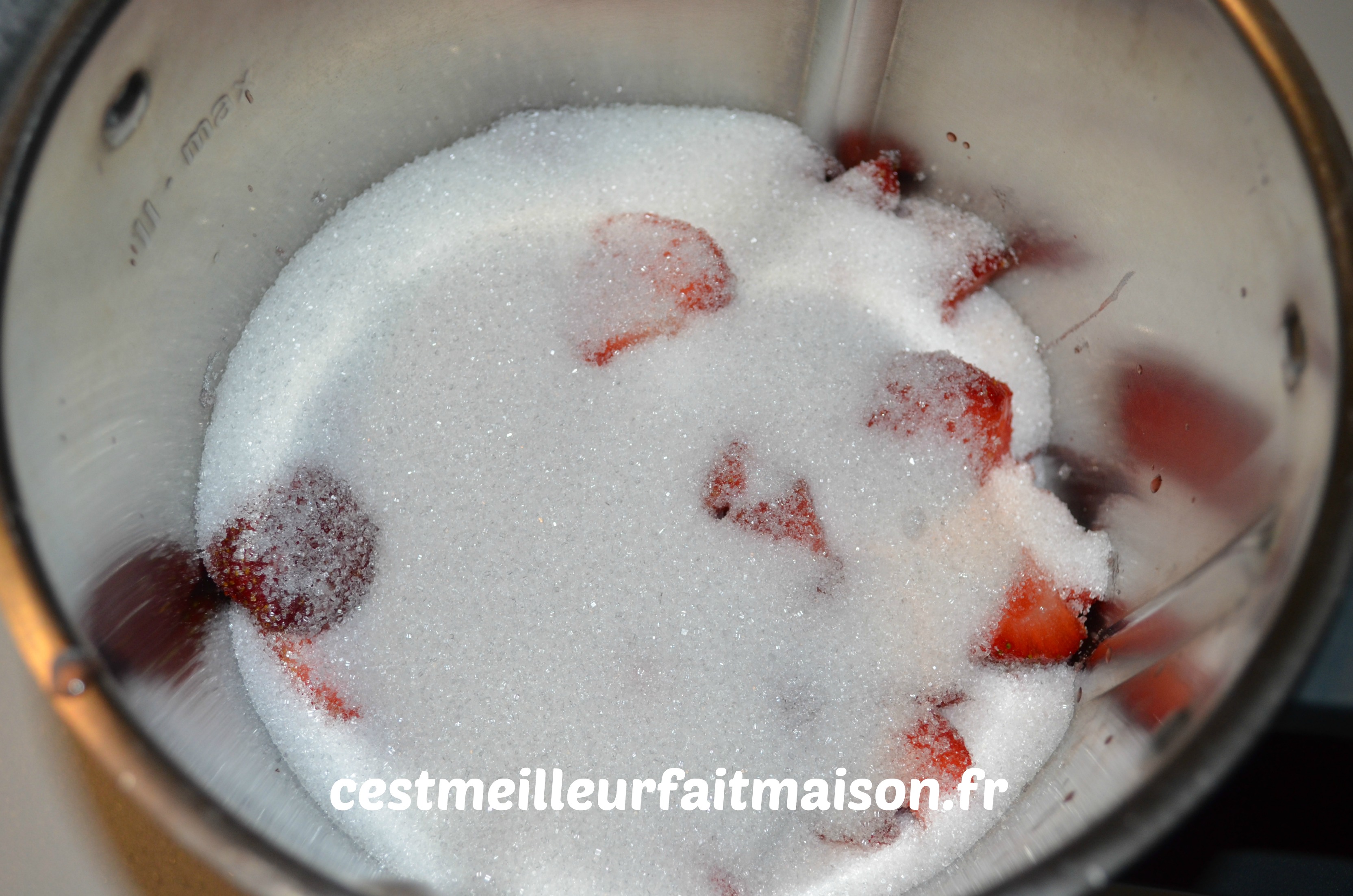 1- Laver et couper les fraises en quatre et les mettre dans le bol du Thermomix. Ajouter 300 g de sucre.