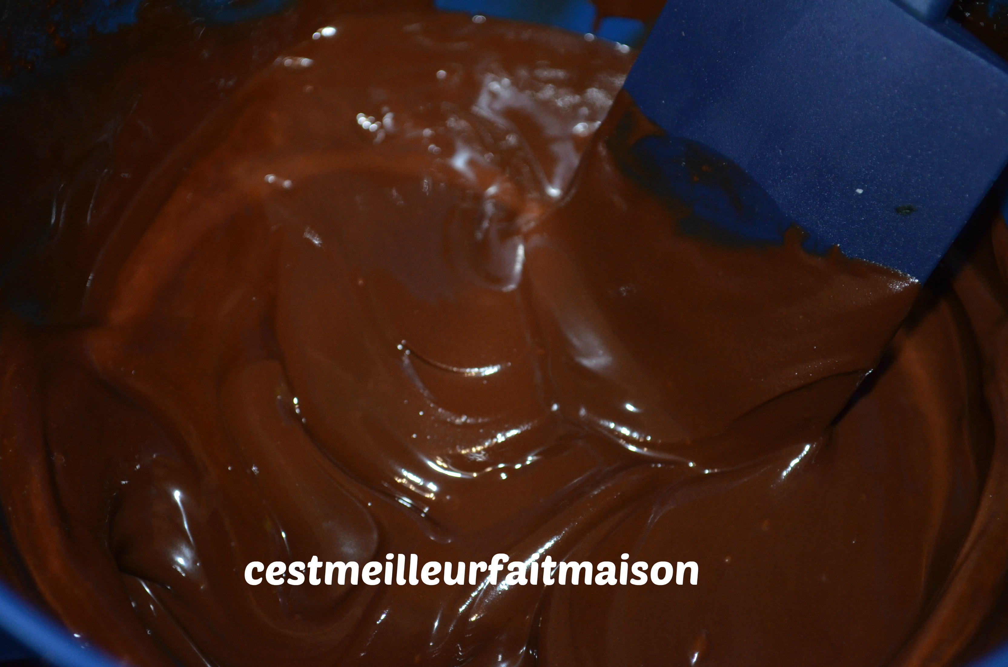 2- Faire fondre au micro-ondes le chocolat et le beurre environ 4 min à 400W. Mélanger à la maryse, le chocolat va finir de fondre. Le mélange doit être lisse et brillant.