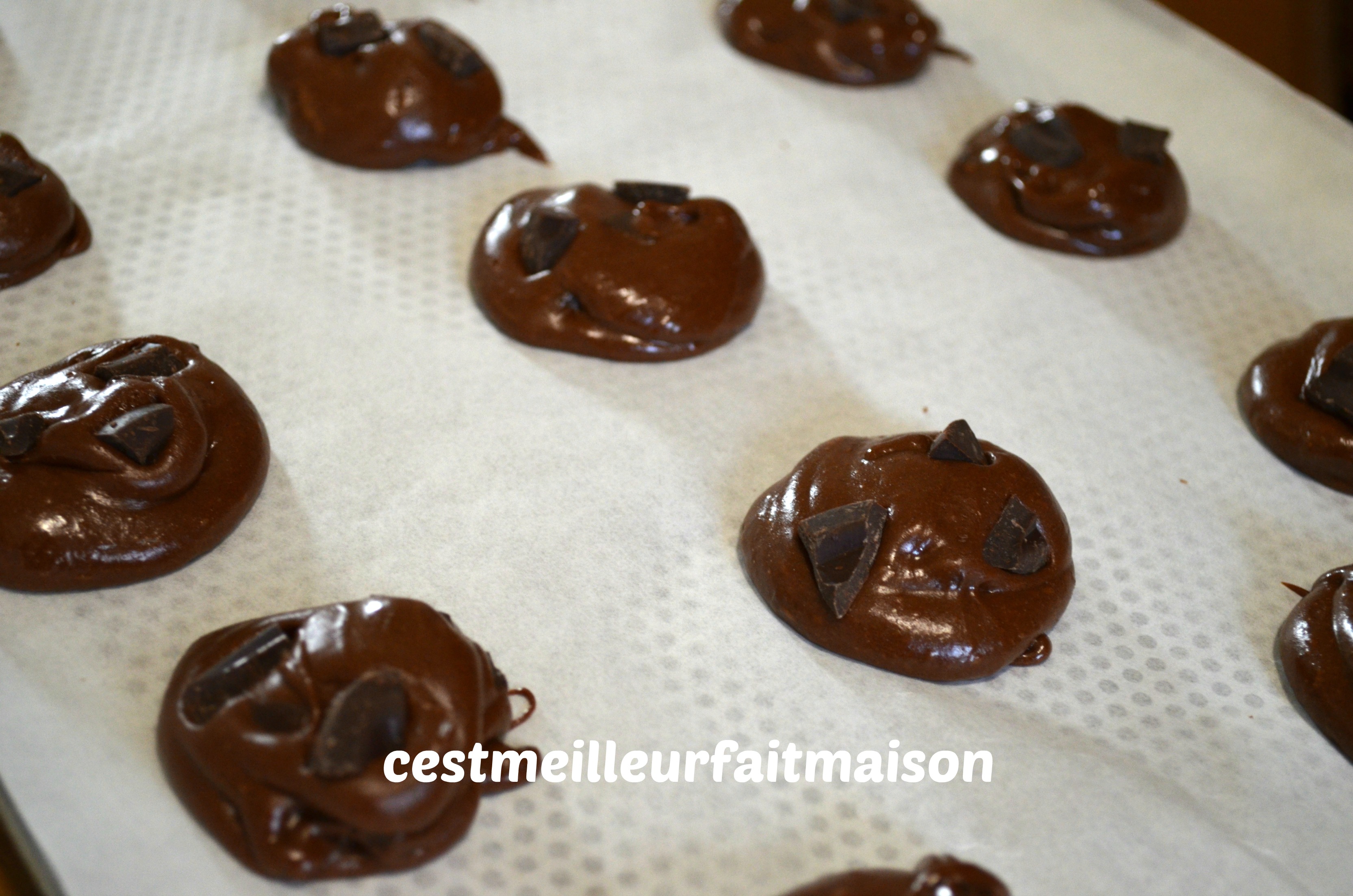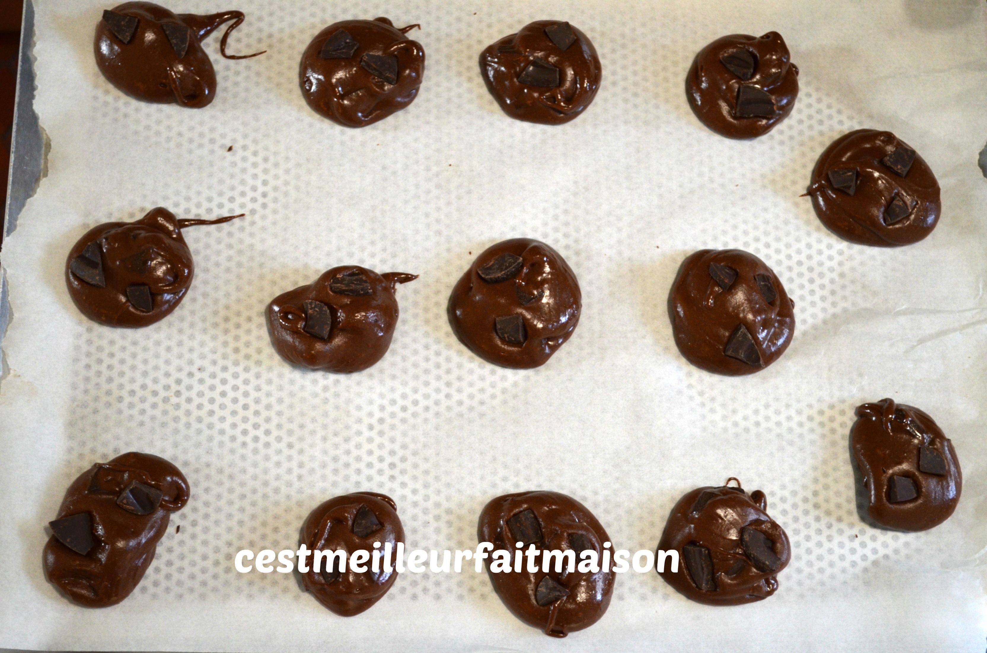 7- Mettre la pâte dans une poche à douille. Former 12 à 14 cookies sur une plaque perforée recouverte de papier cuisson. Avec cette préparation, on peut faire deux plaques de cookies. Ajouter les chunks restants.
