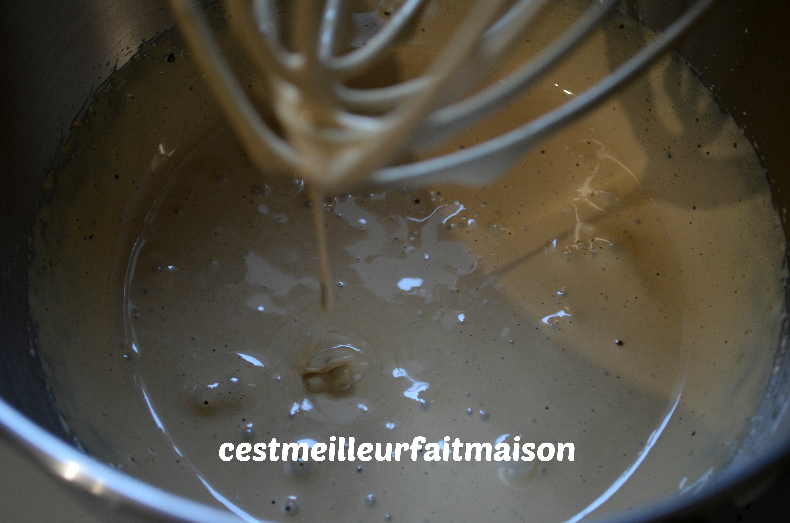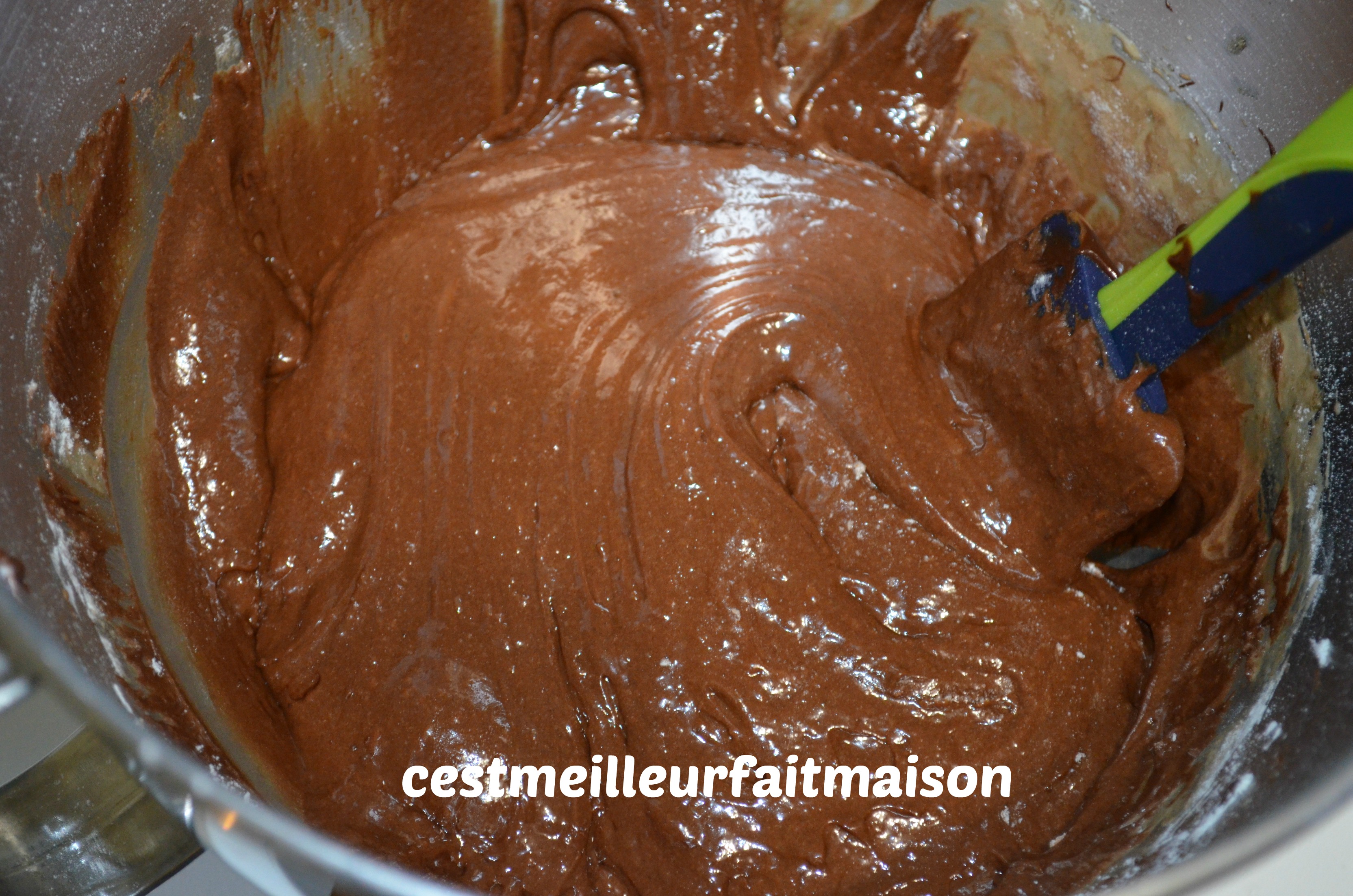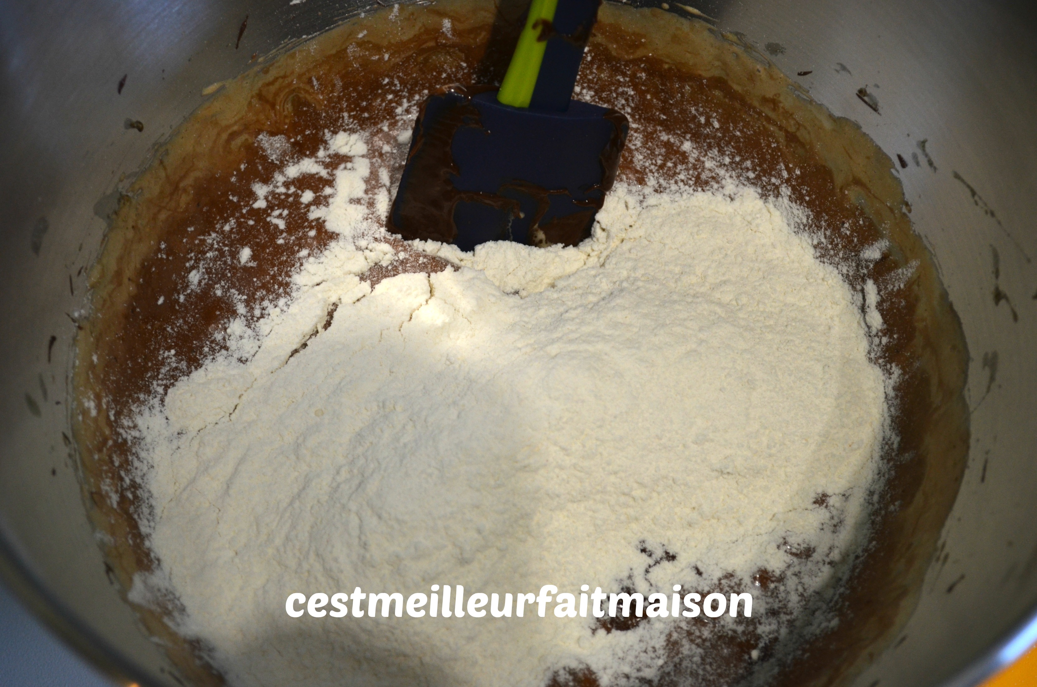 5- Ajouter le mélange avec la farine et mélanger à la maryse sans insister.
