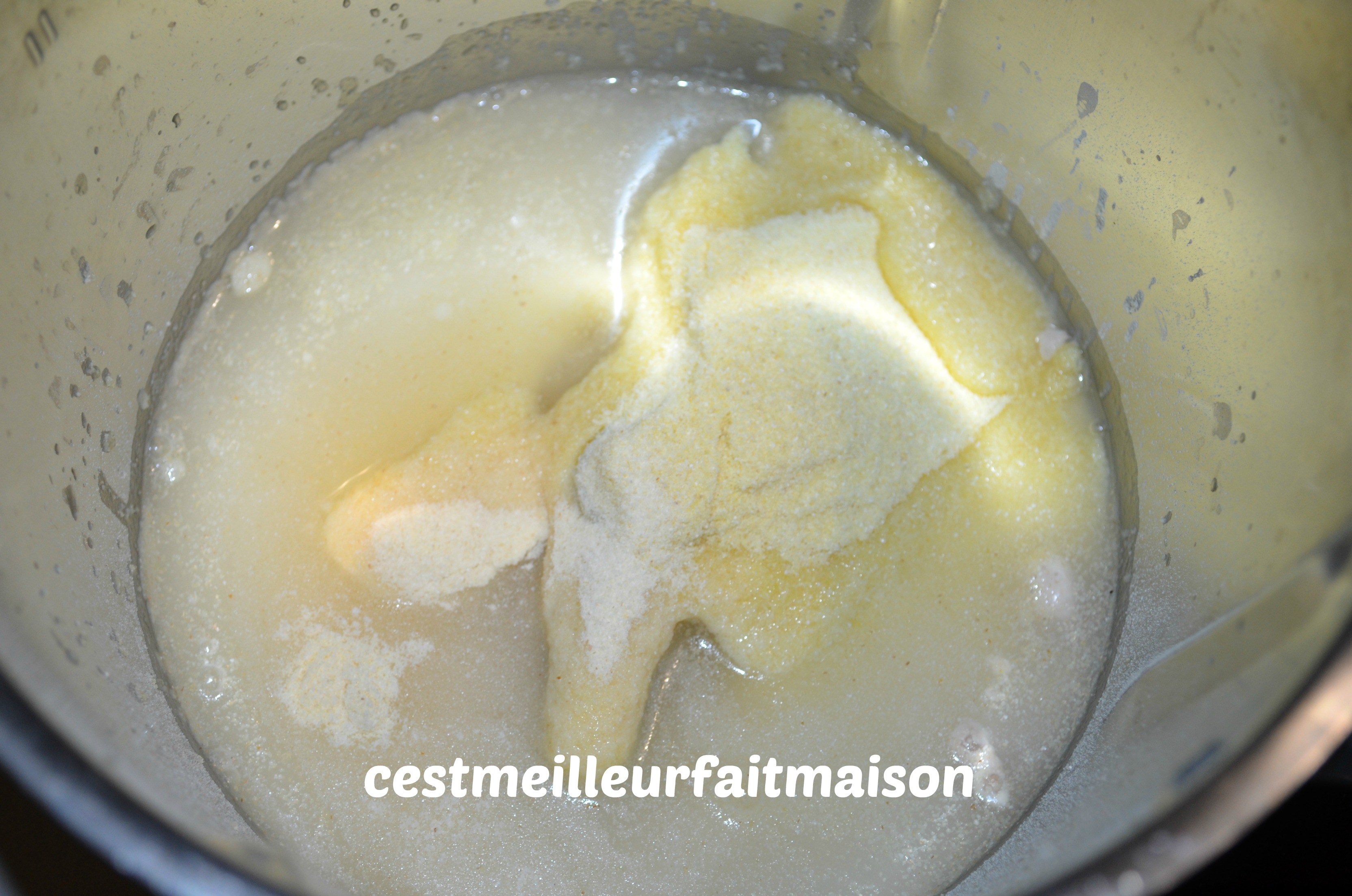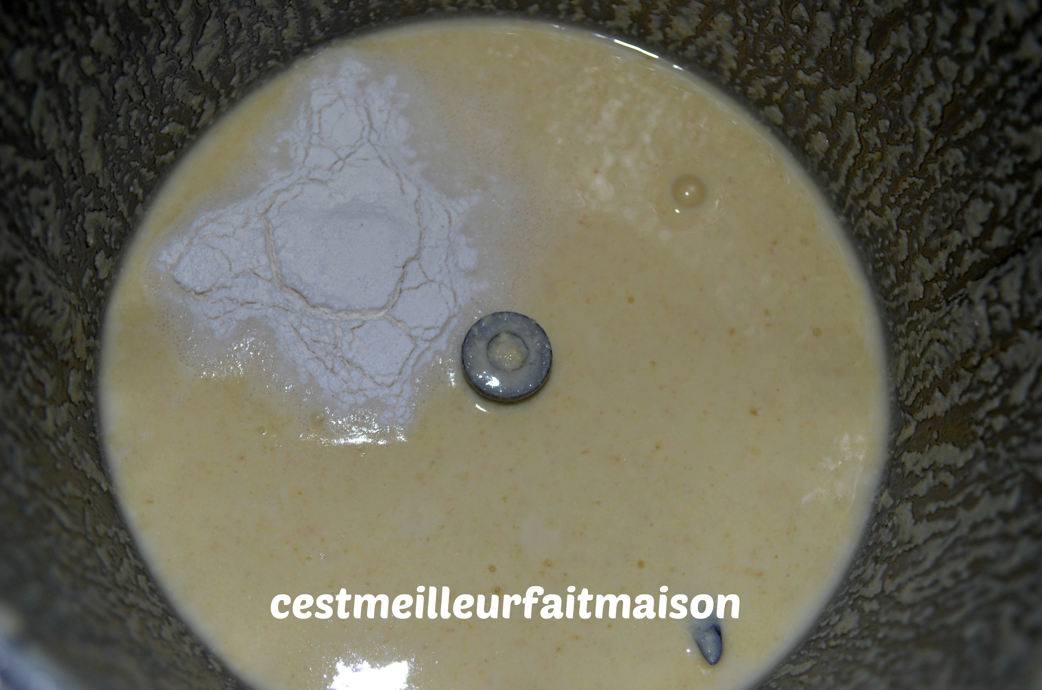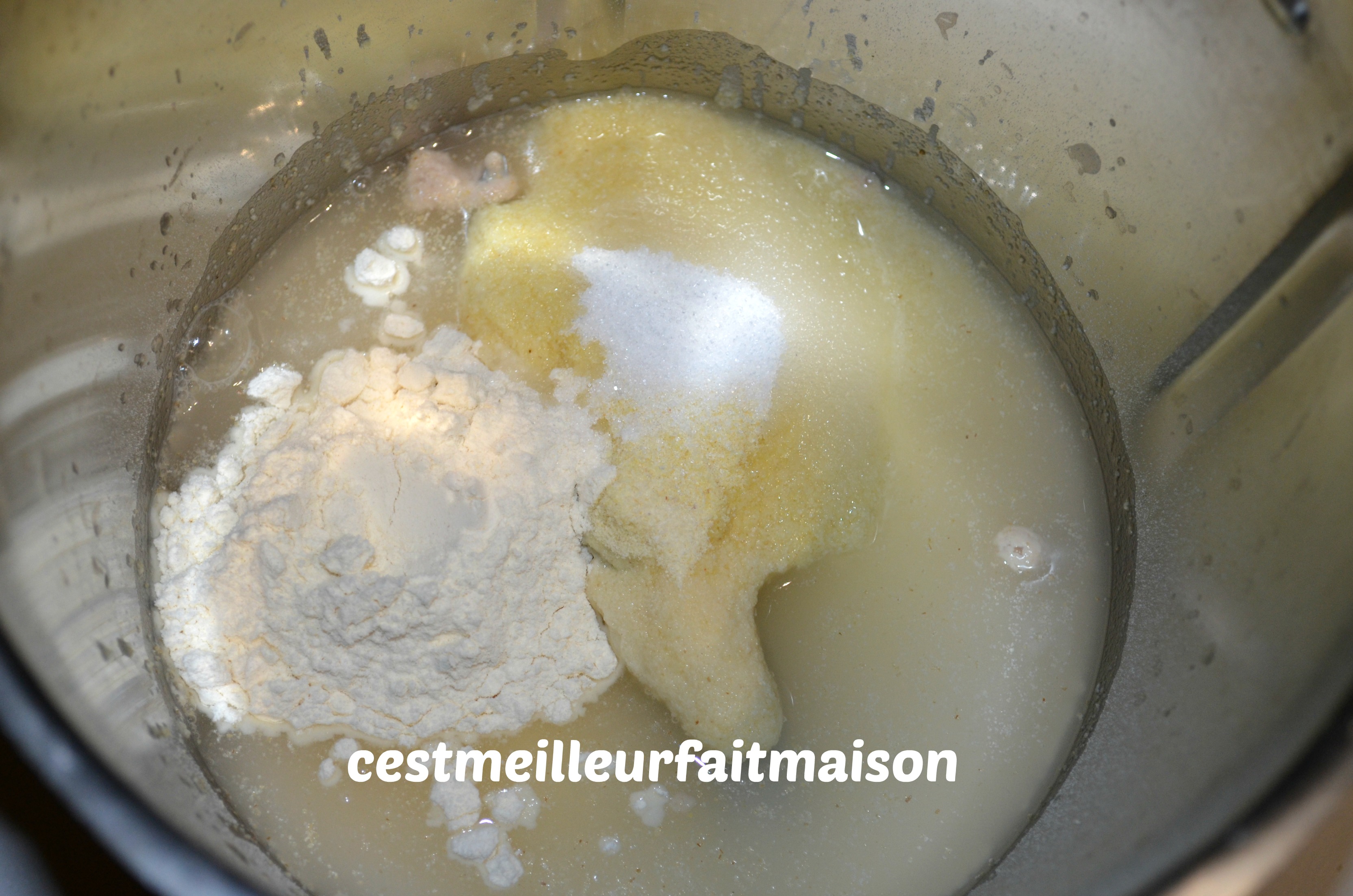 1- Mettre l’eau et la levure de boulanger dans le bol du Thermomix et ajouter la semoule, la farine, le sel et le sucre. Mixer 3 min/ Vit 6.