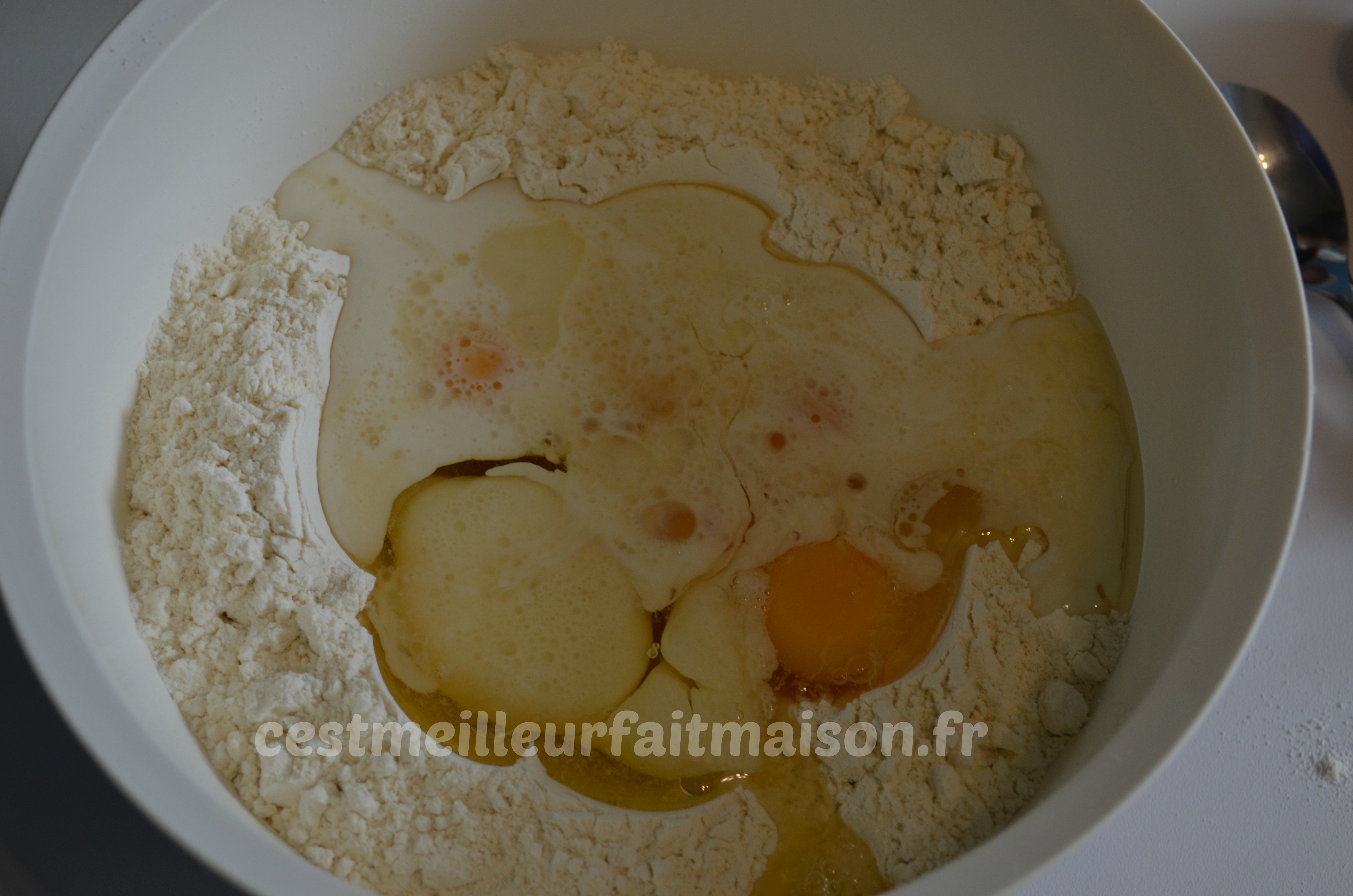 1- Mettre la farine dans un saladier ou bol d’un robot et faire une fontaine. Ajouter au centre les oeufs, le sel, l’huile et les arômes. Verser un peu de lait et commencer à fouetter. Continuer à verser le reste du lait petit à petit tout en fouettant.