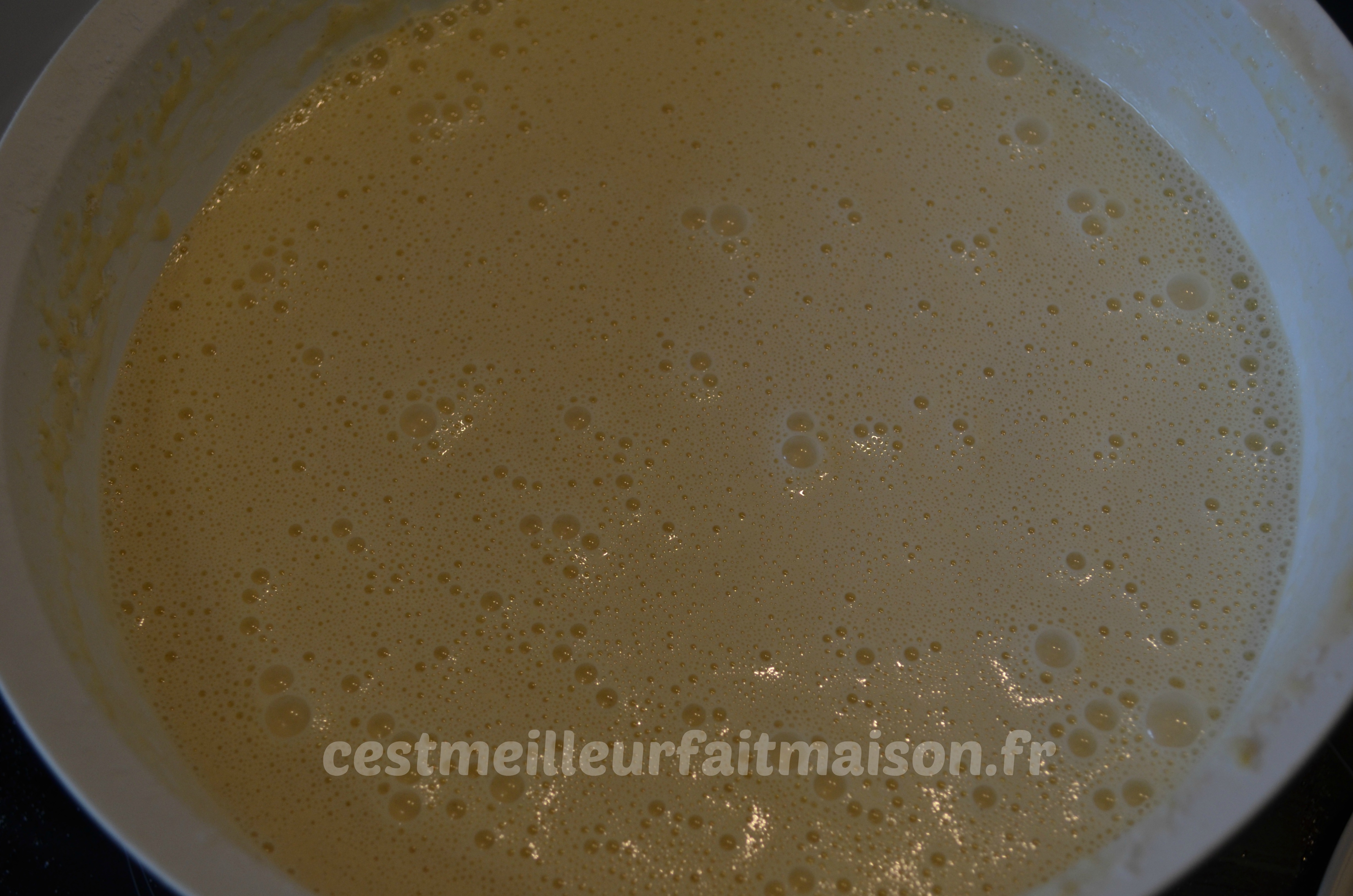 2- Laisser reposer ou non suivant le temps que vous avez. Si la pâte est trop épaisse, je rajoute du lait et dans ce cas, j’ai plus de crêpes.