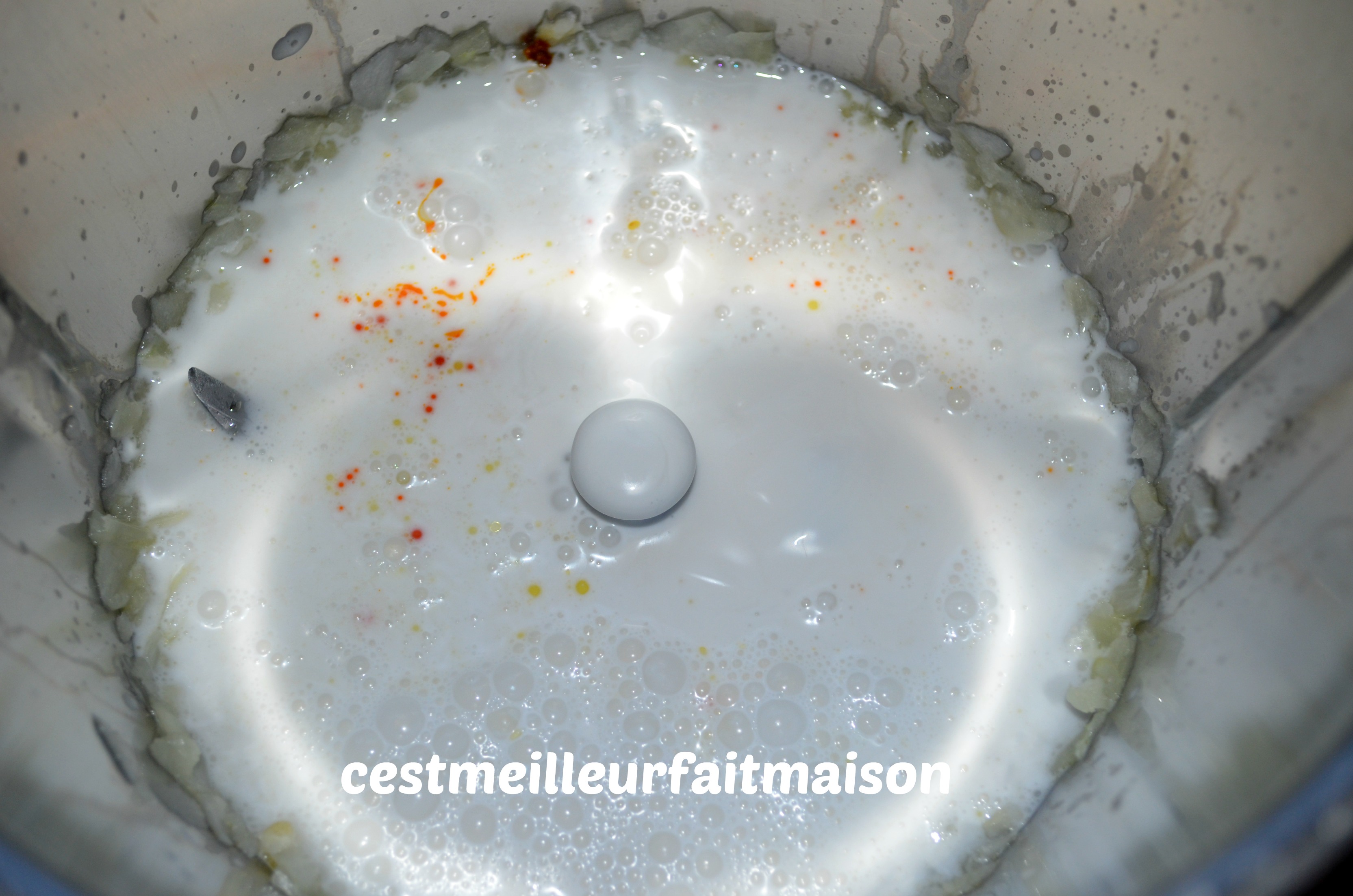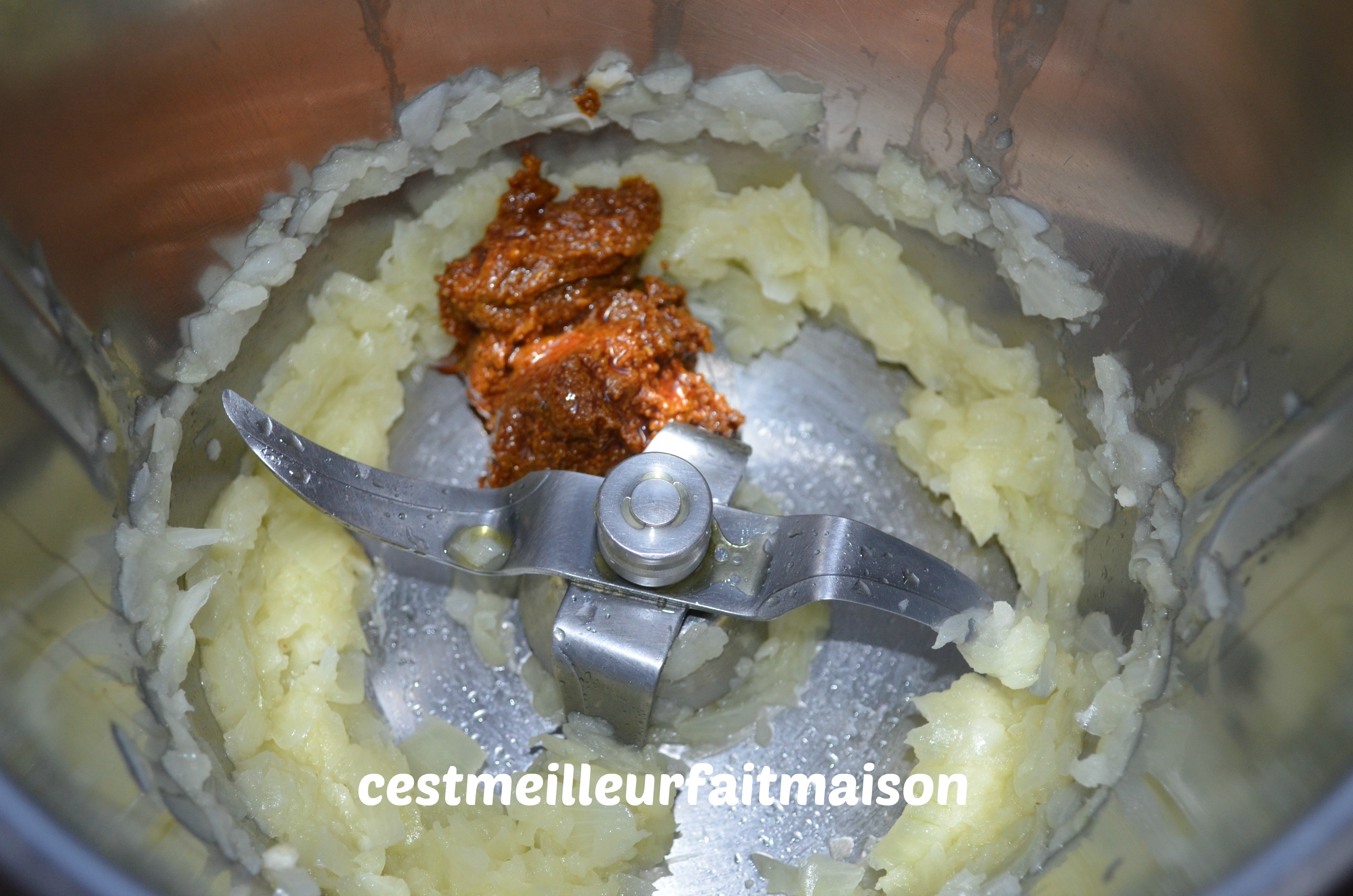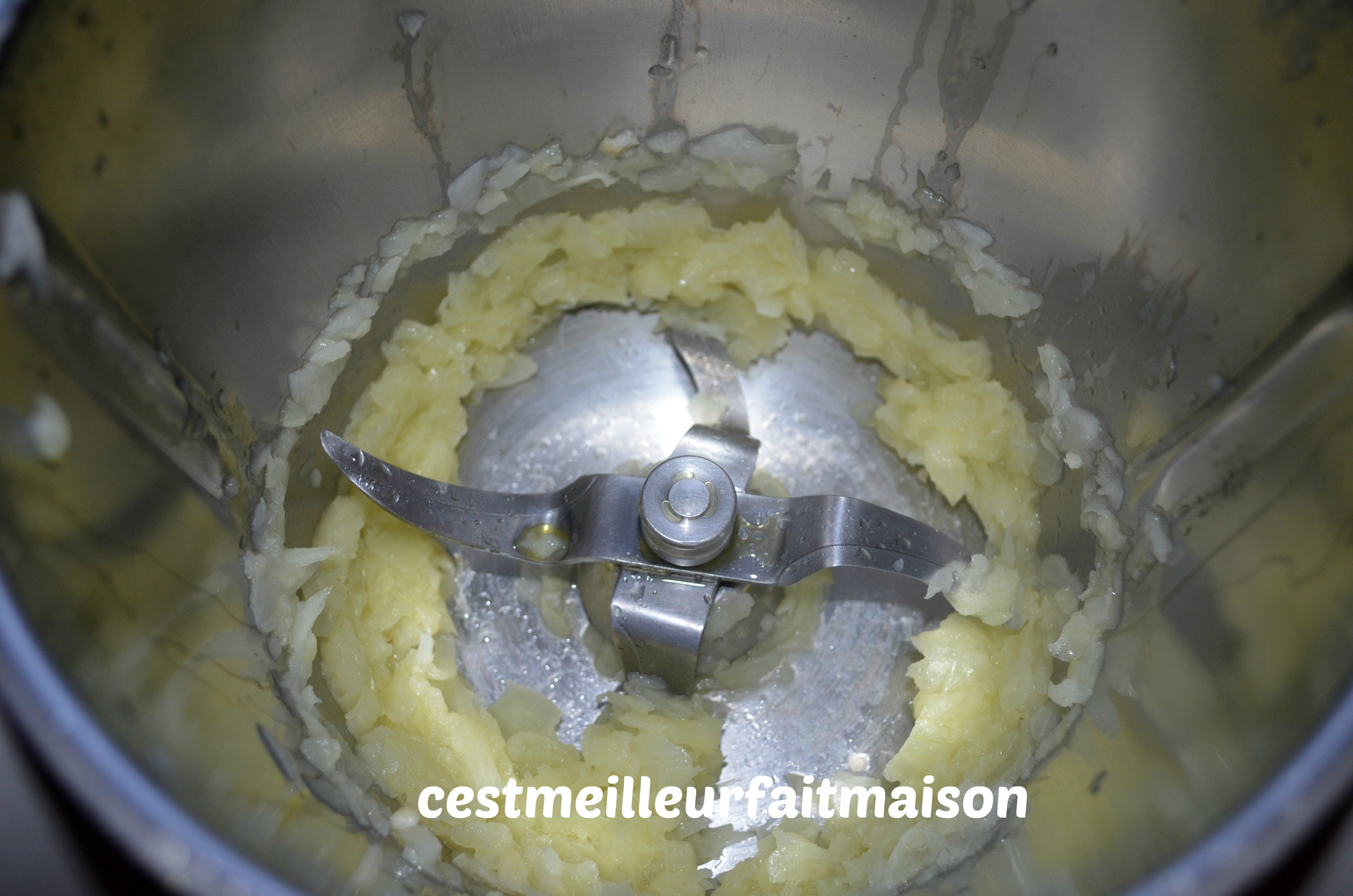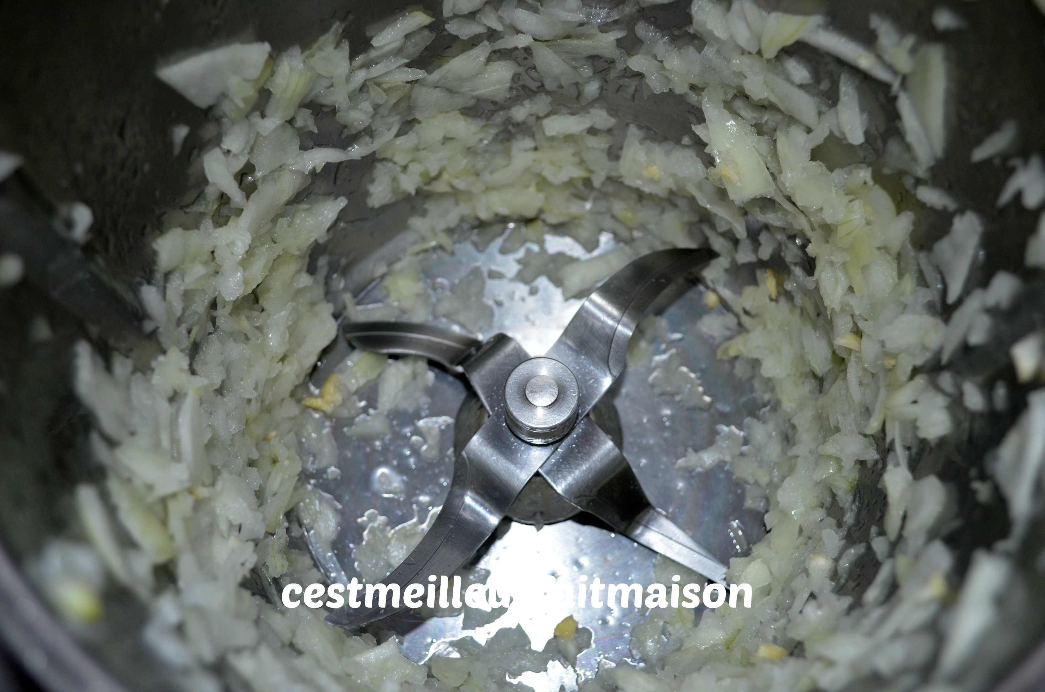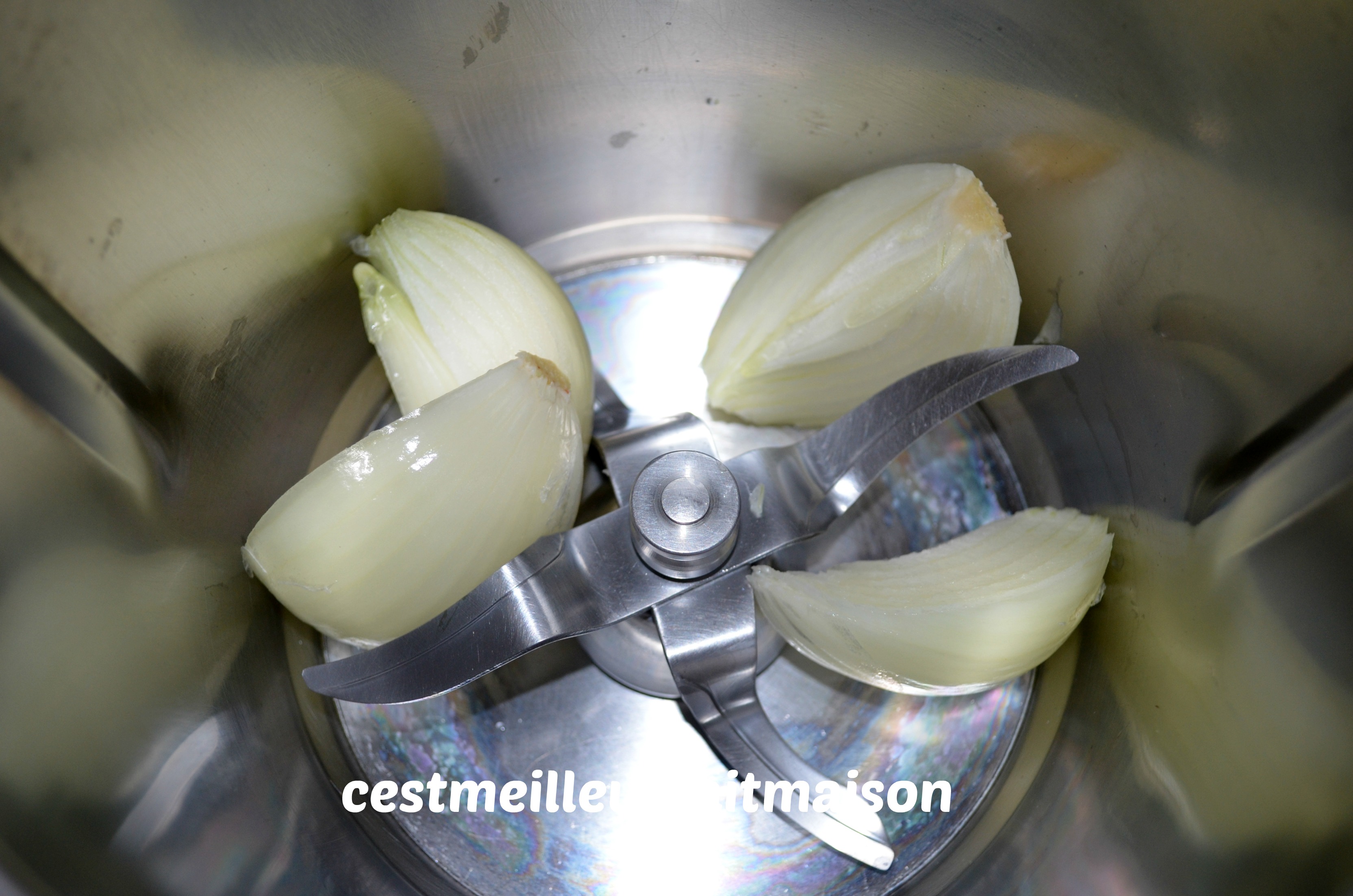 1- Dans le bol du Thermomix, mettre l’oignon coupé en quatre. Mixer 5 sec/Vit 5.