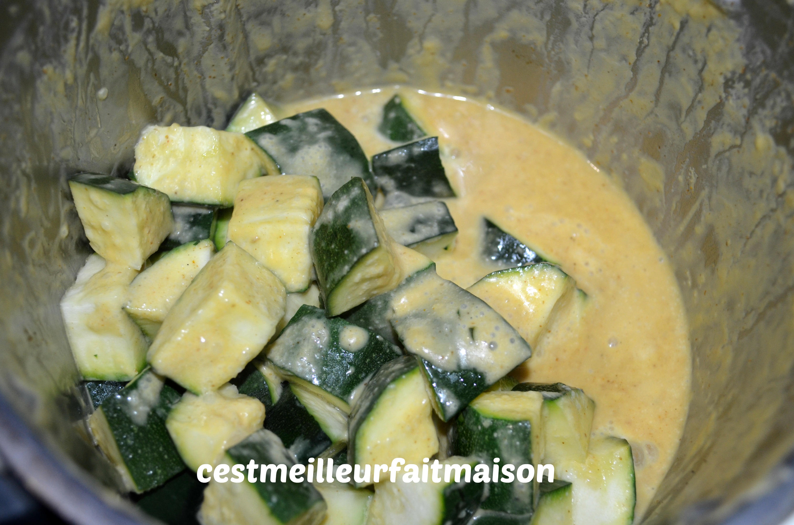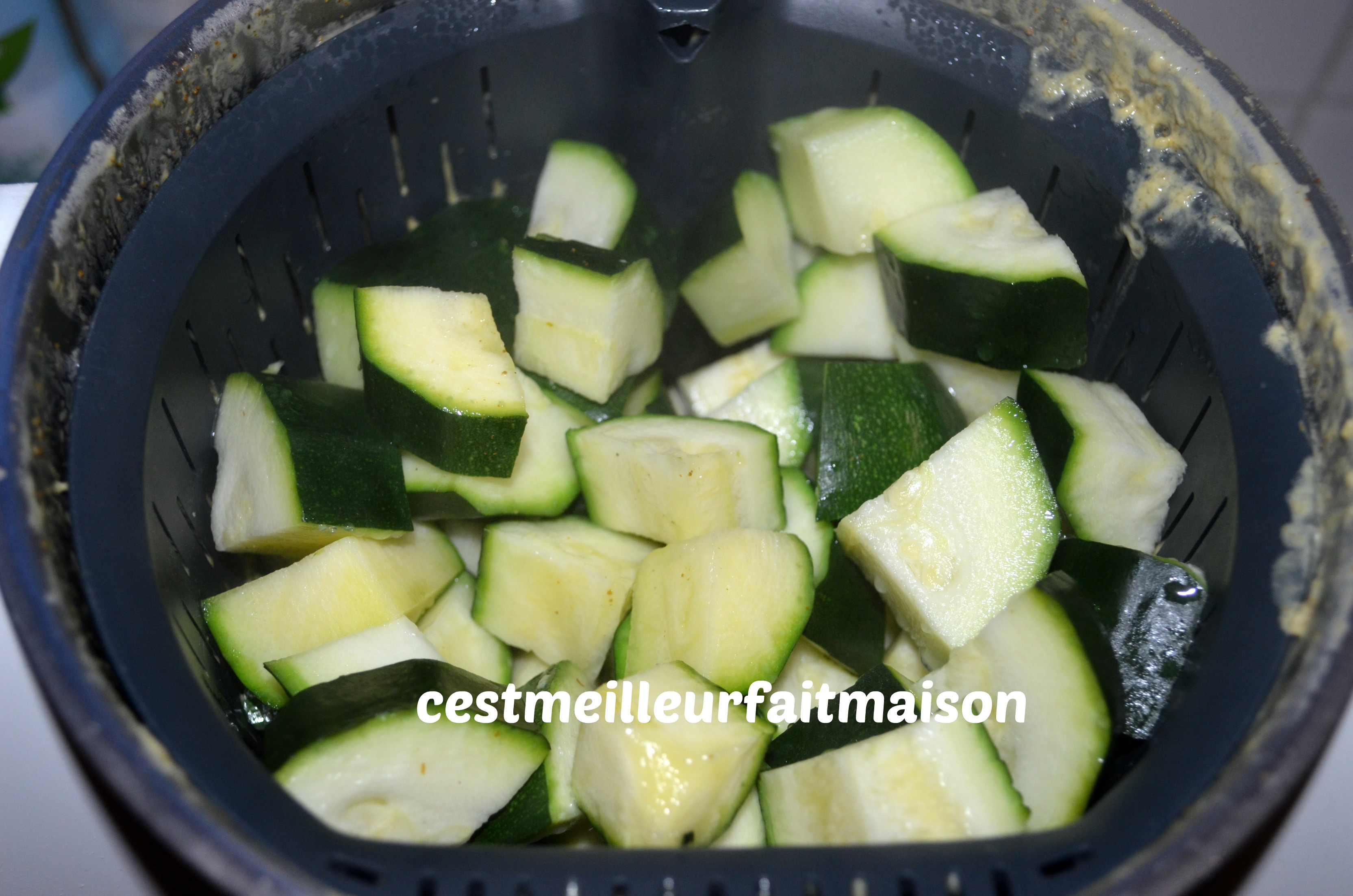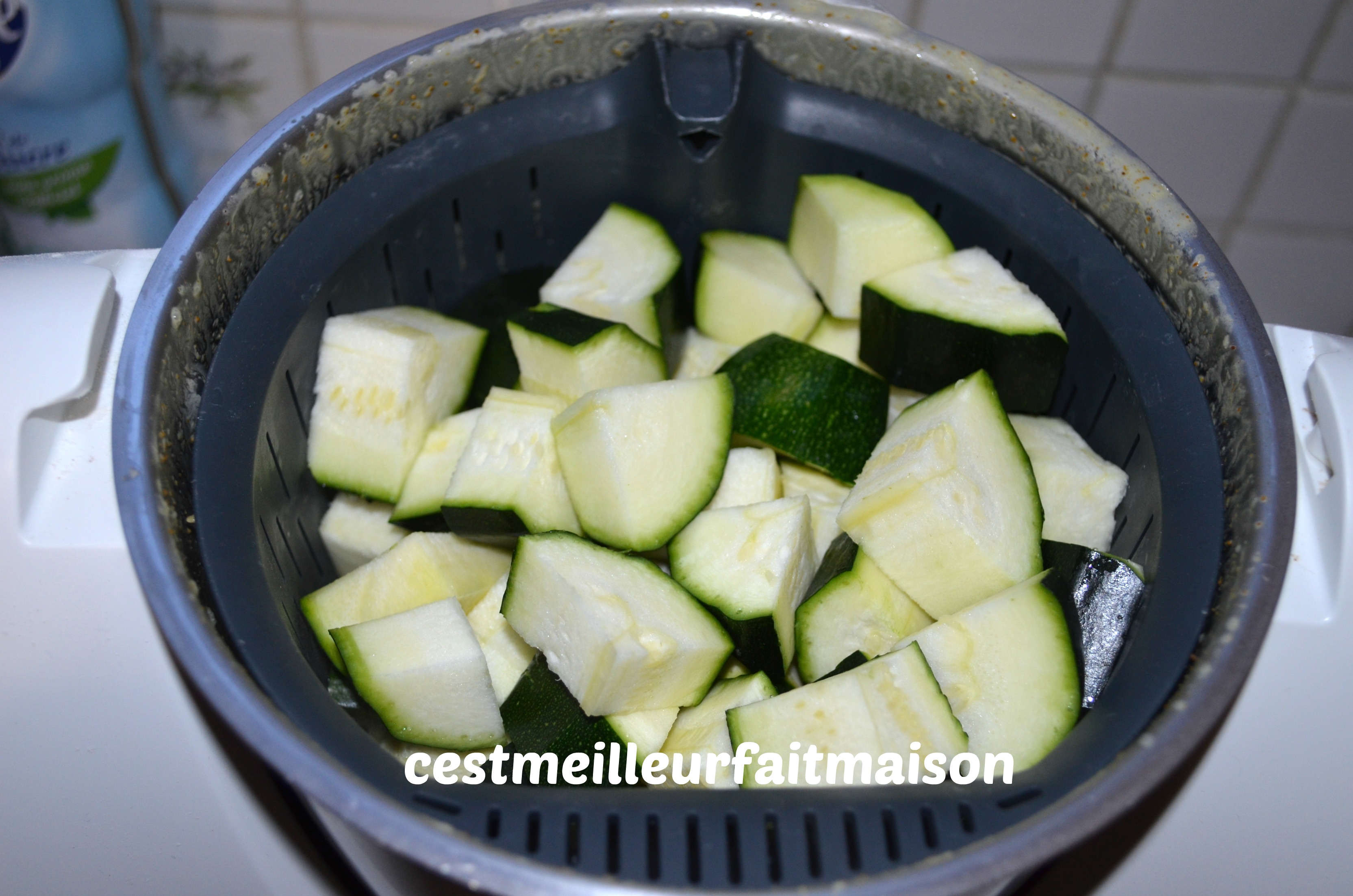 4- Couper les courgettes en cube et les mettre dans le panier. Insérer le panier dans le bol et cuire 8 min/Varoma/Vit cuillère.