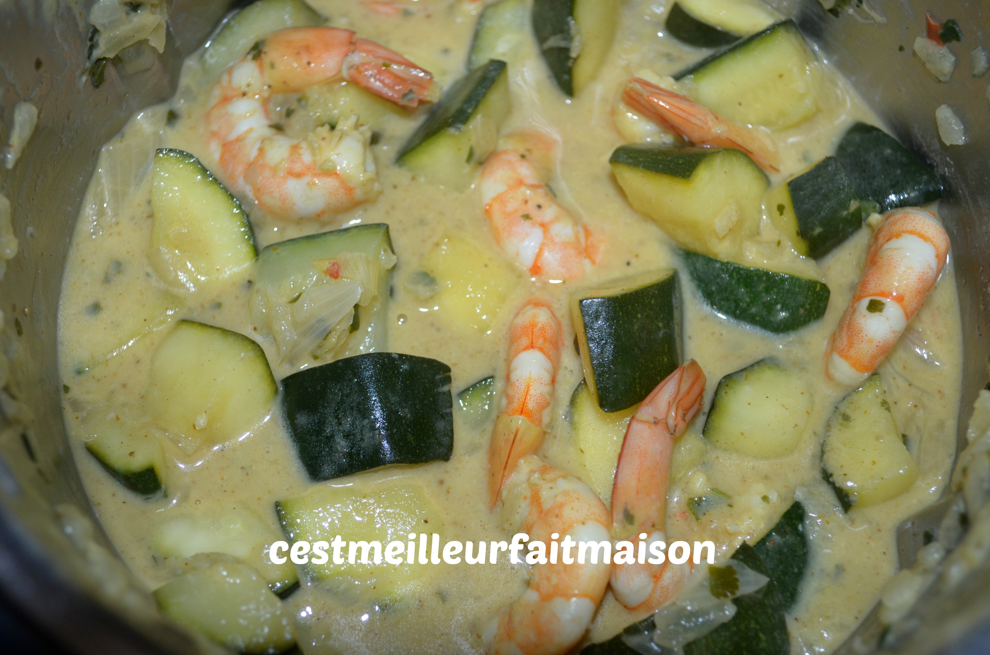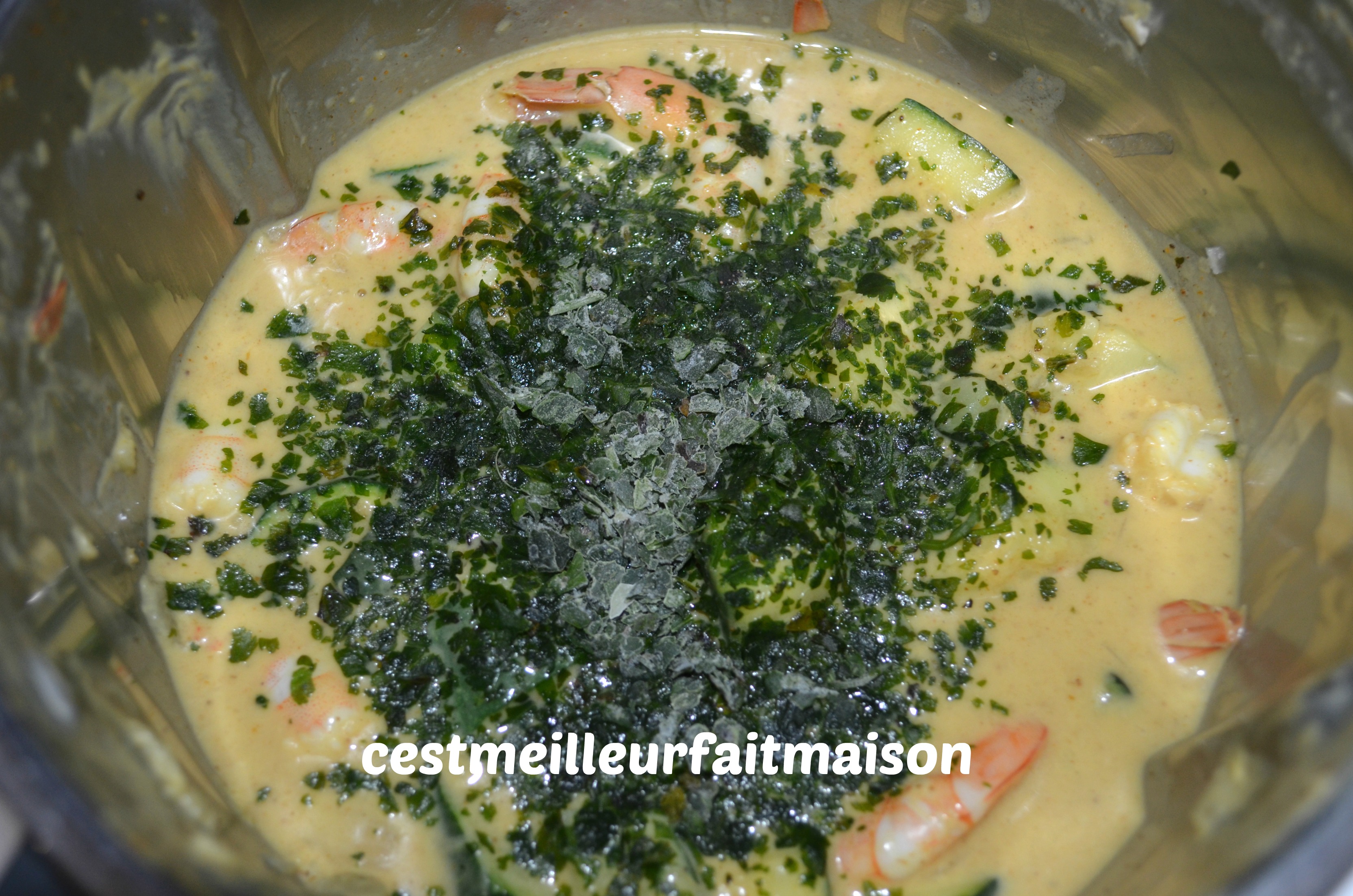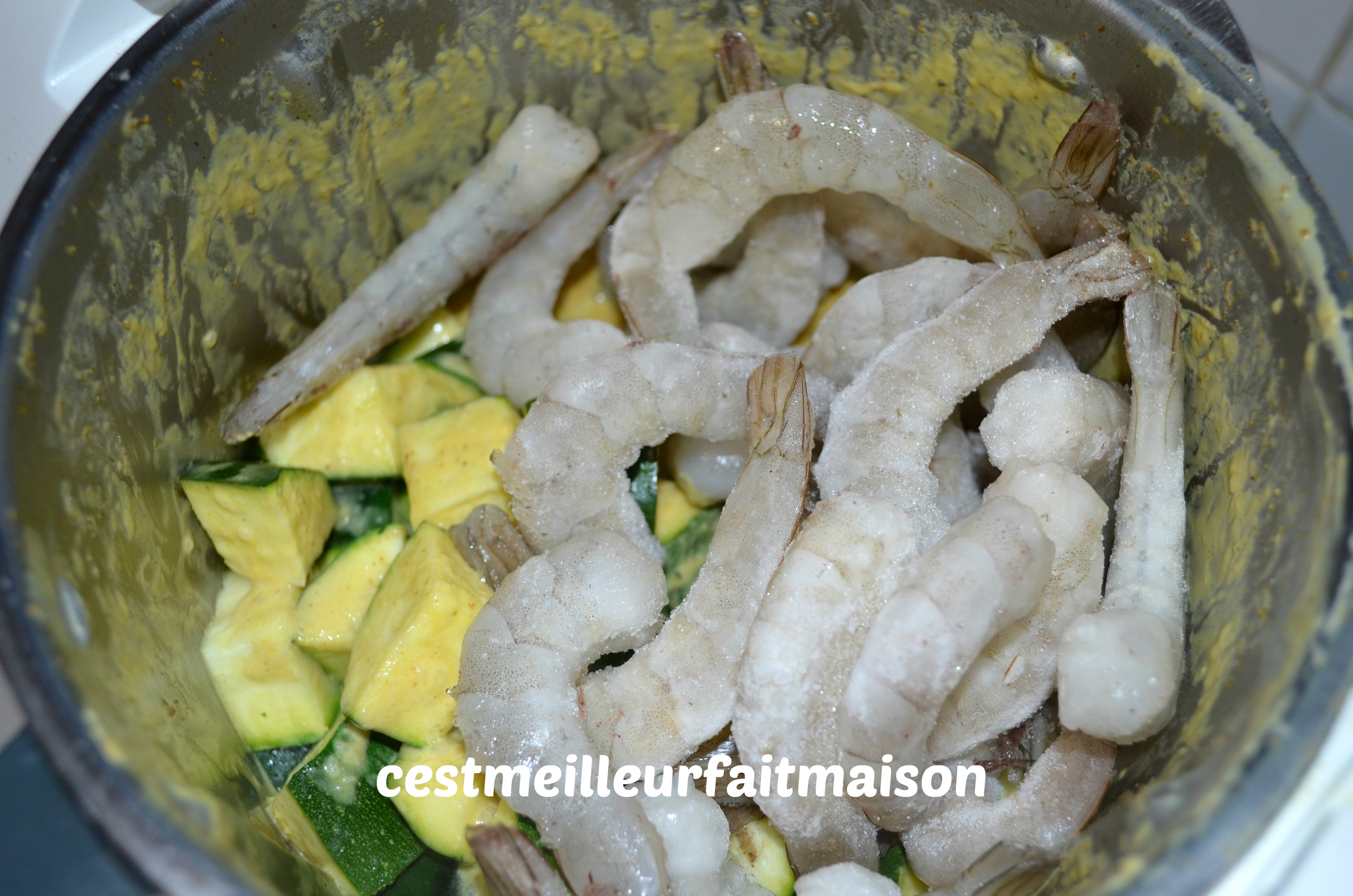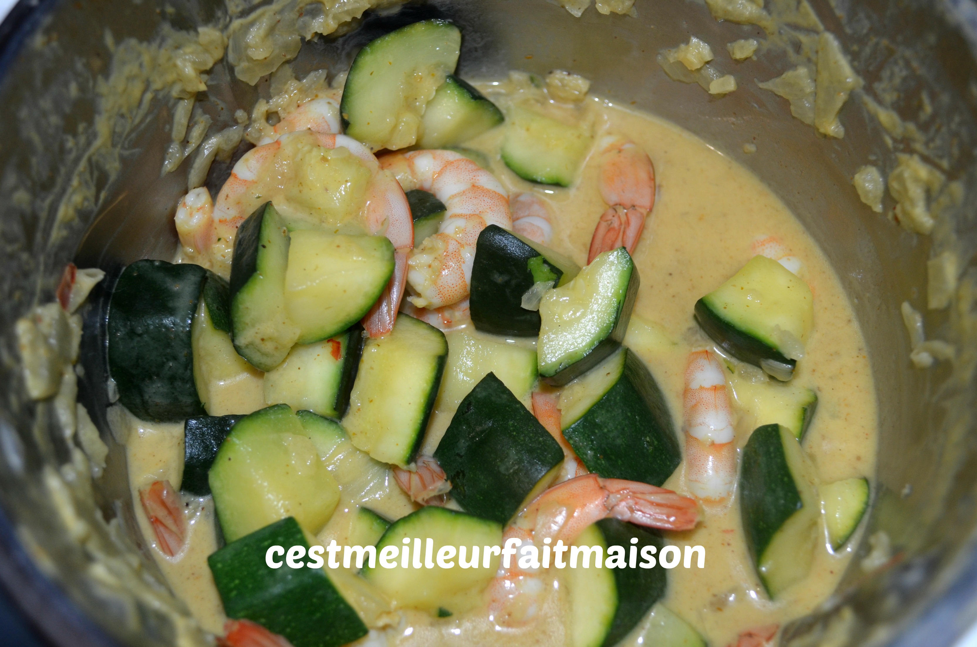 5- Verser le panier de courgette dans le bol et ajouter les crevettes. Cuire 8 min/100°C/Sens Inverse/Vit cuillère.