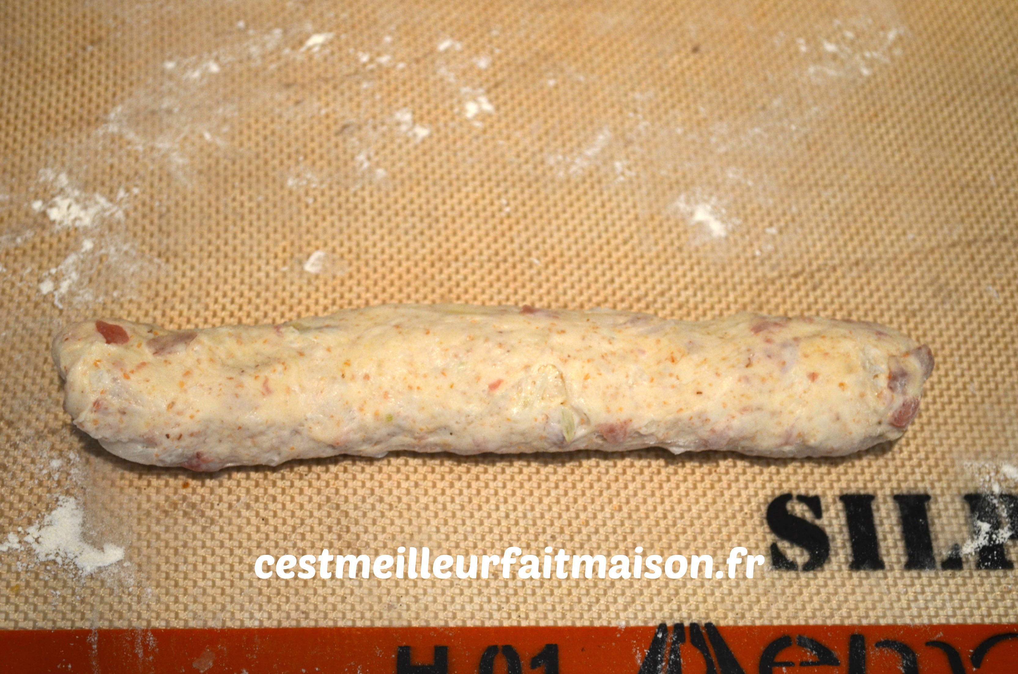 3- Ajouter les farines et le sel et pétrir 1 min. Ajouter ensuite l’oignon et les lardons et pétrir 1 min de plus.