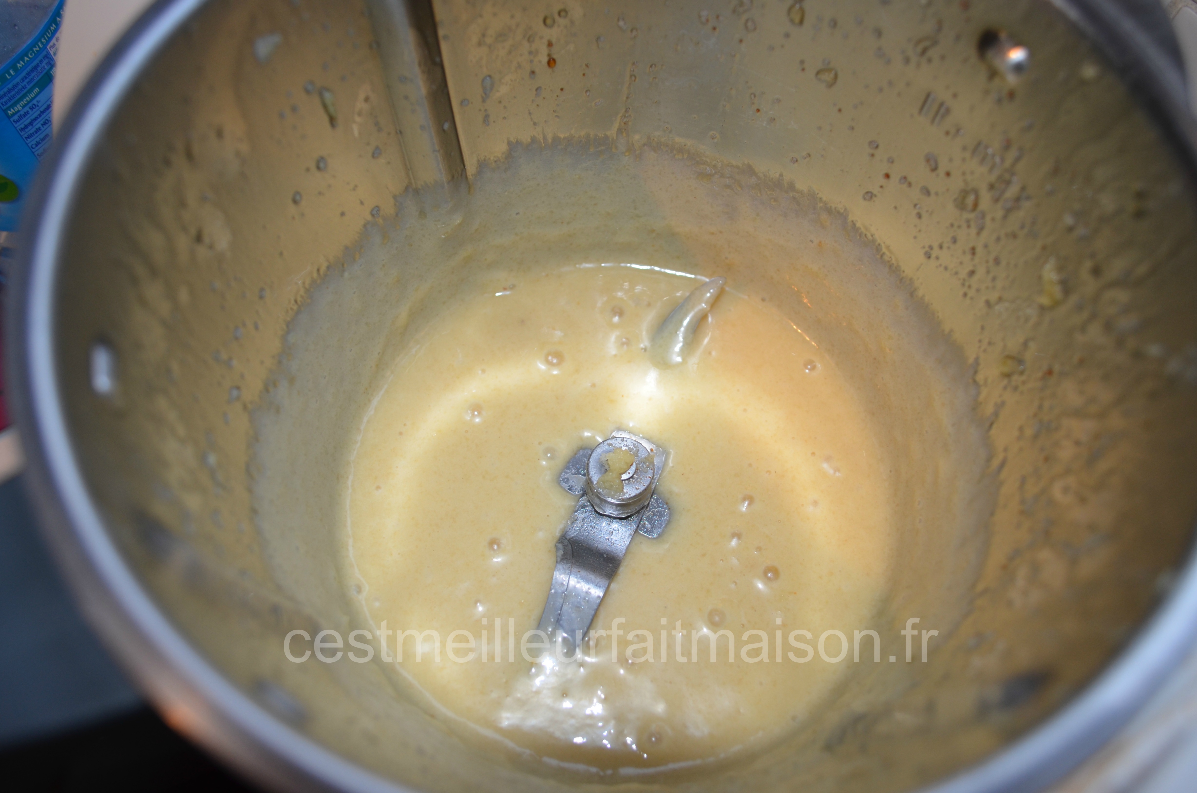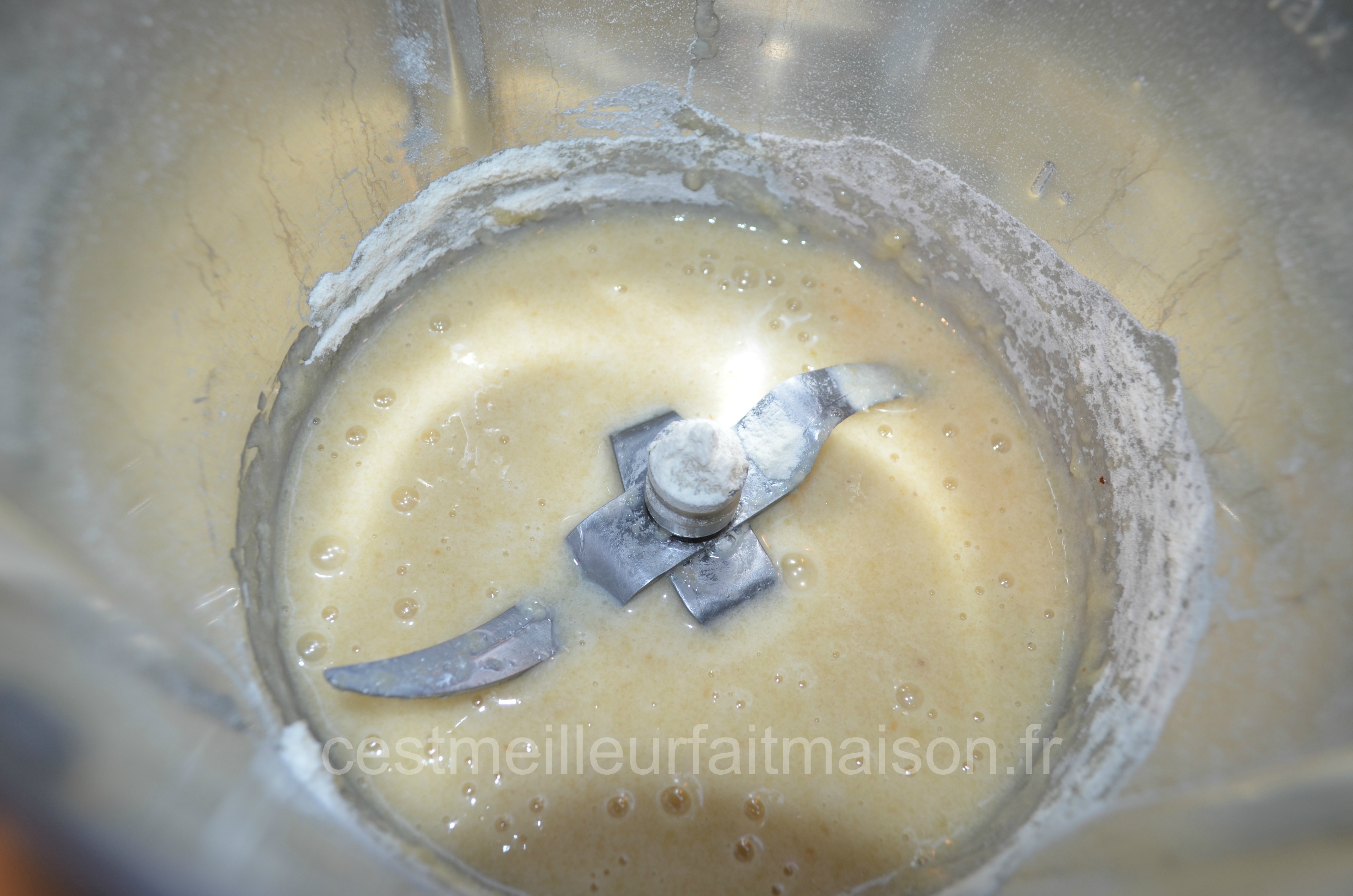 2- Faire fondre le beurre dans une petite casserole. Réaliser un beurre noisette. Petite astuce de Monique (conseillère Thermomix): arrêter la cuisson dès que le beurre ne “chante” plus. Le verser, à travers un chinois, dans la préparation précédente. Mélanger et laisser reposer 15 min.
