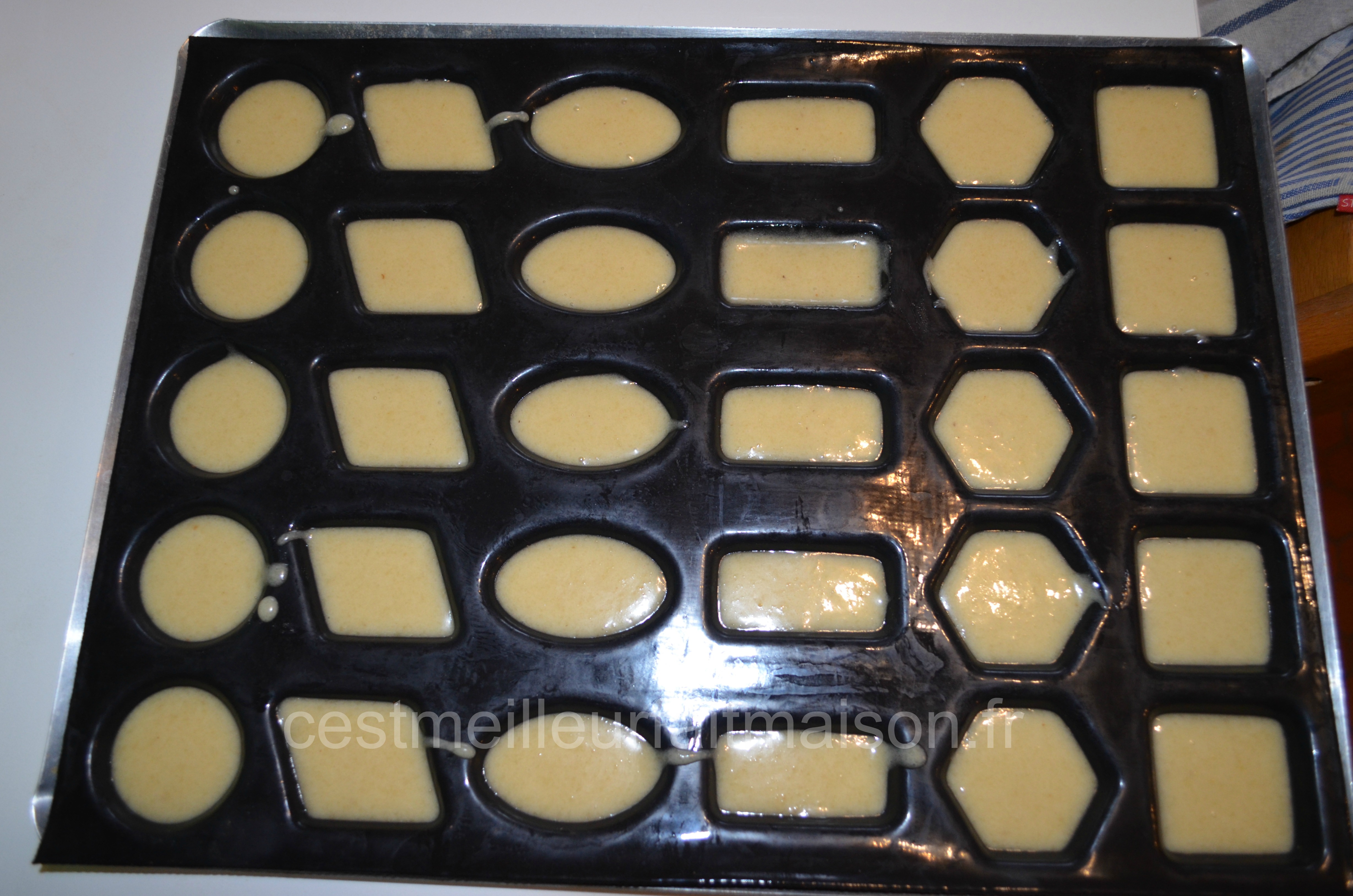 3- Préchauffer le four à 200°C. Poser vos empreintes sur une plaque perforée et les garnir au 2/3. Je n’ai pas les empreintes financiers, j’ai utiliser la plaque Mignardises.