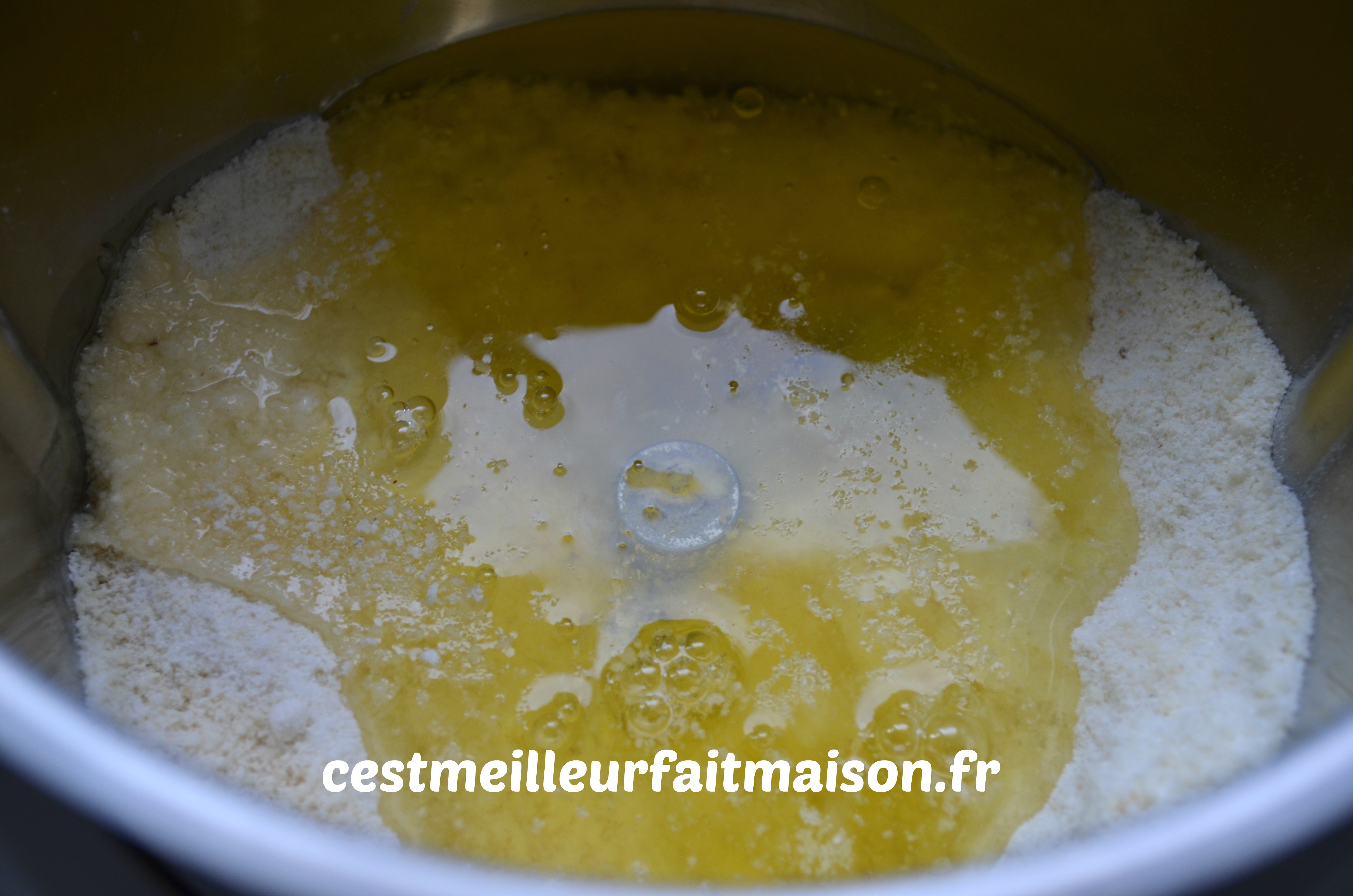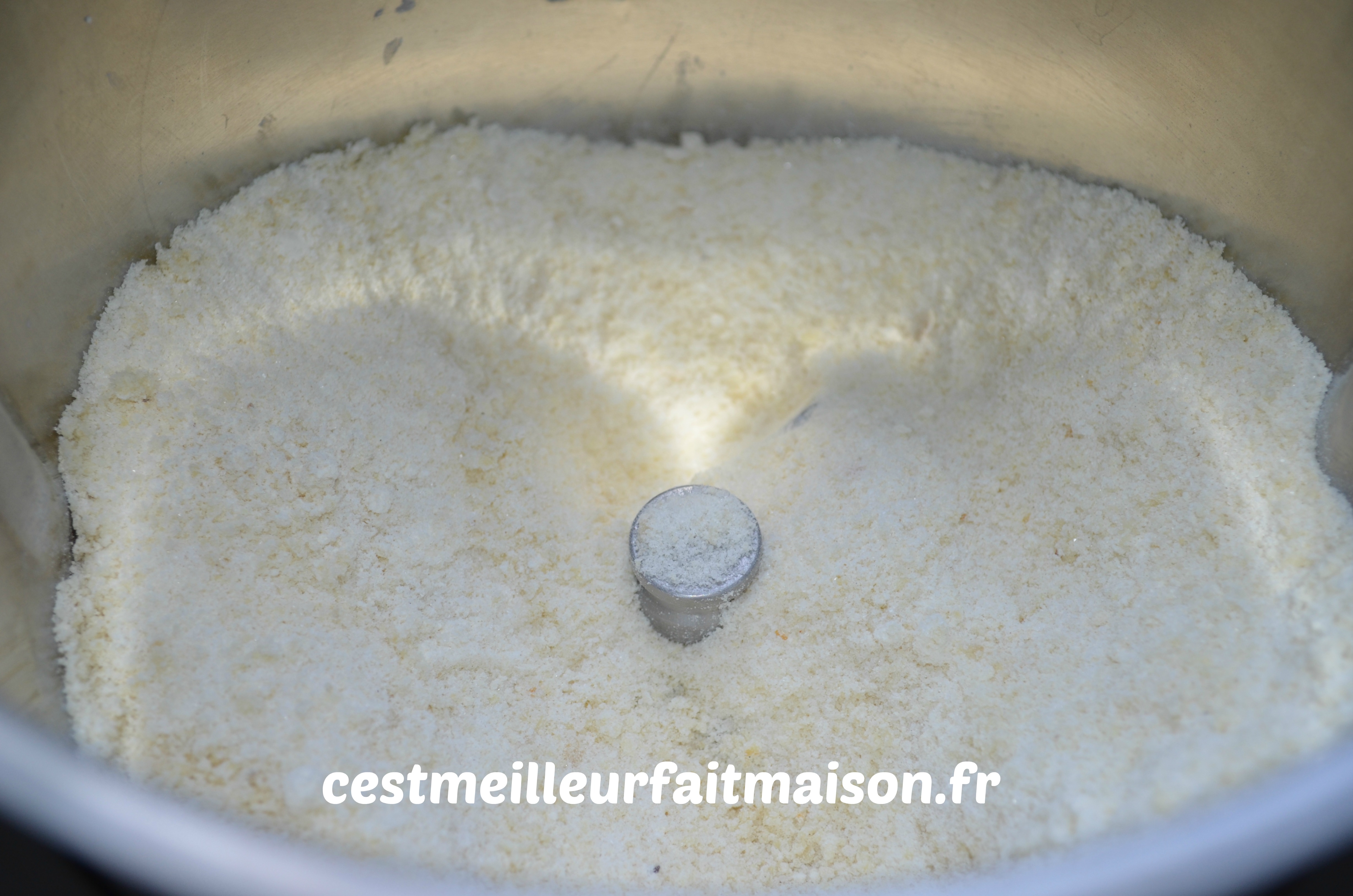 1- Mettre dans le bol du Thermomix, la poudre d’amande, le sucre et la farine. Mélanger 10 sec/Vit 5.