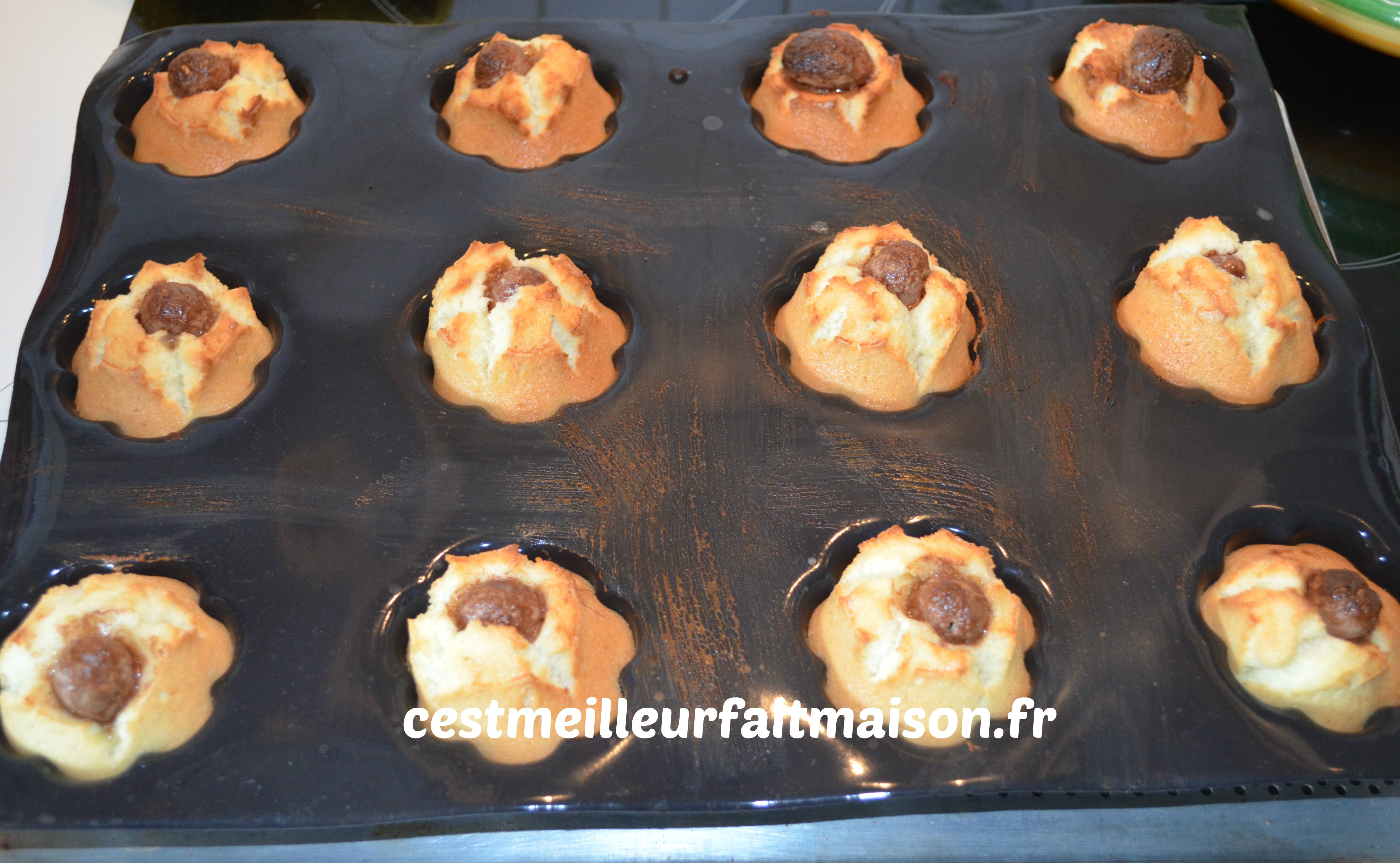 5- Verser la pâte dans les empreintes. Mettre un Schoko Bon au centre de chaque empreinte et enfourner pour environ 15 min à 200°C et 5 min à 160°C.