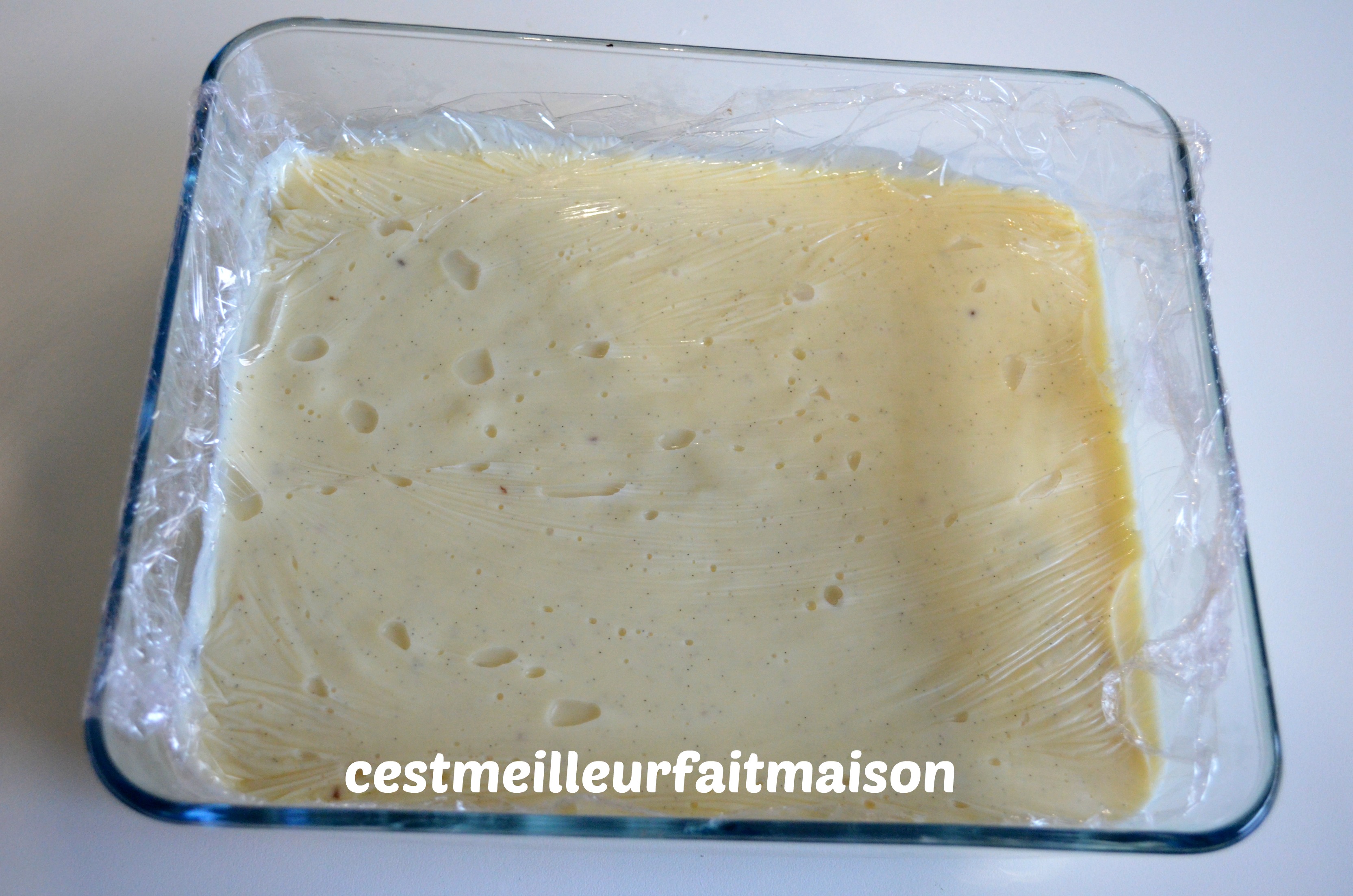 7- Remettre la crème dans la casserole et laisser épaissir à feu doux sans cesser de remuer. Lorsque la crème est épaissie, la verser dans un récipient pour qu’elle refroidisse. La filmer au contact.