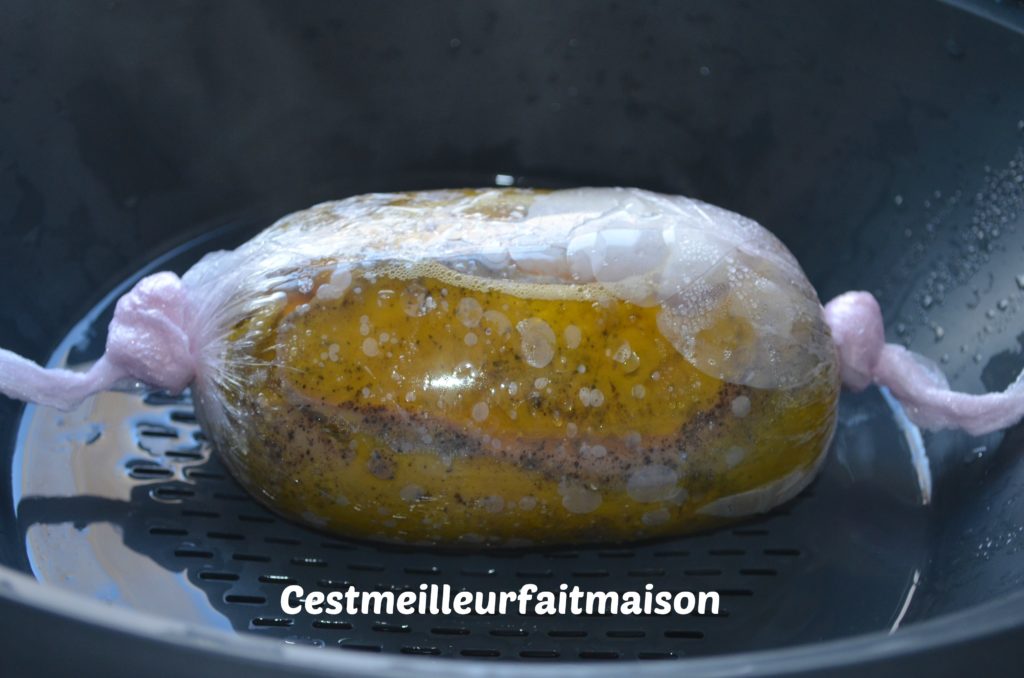Astuce qui n’est pas sur la photo: Lorsque vous rouler le foie avec la 5ème feuille de film, faites en sorte d’avoir des extrémités beaucoup plus longues afin de les attacher pour obtenir une anse. Vous pourrez ainsi vous servir de cette anse pour retirer plus facilement le foie du Varoma à la fin de la cuisson