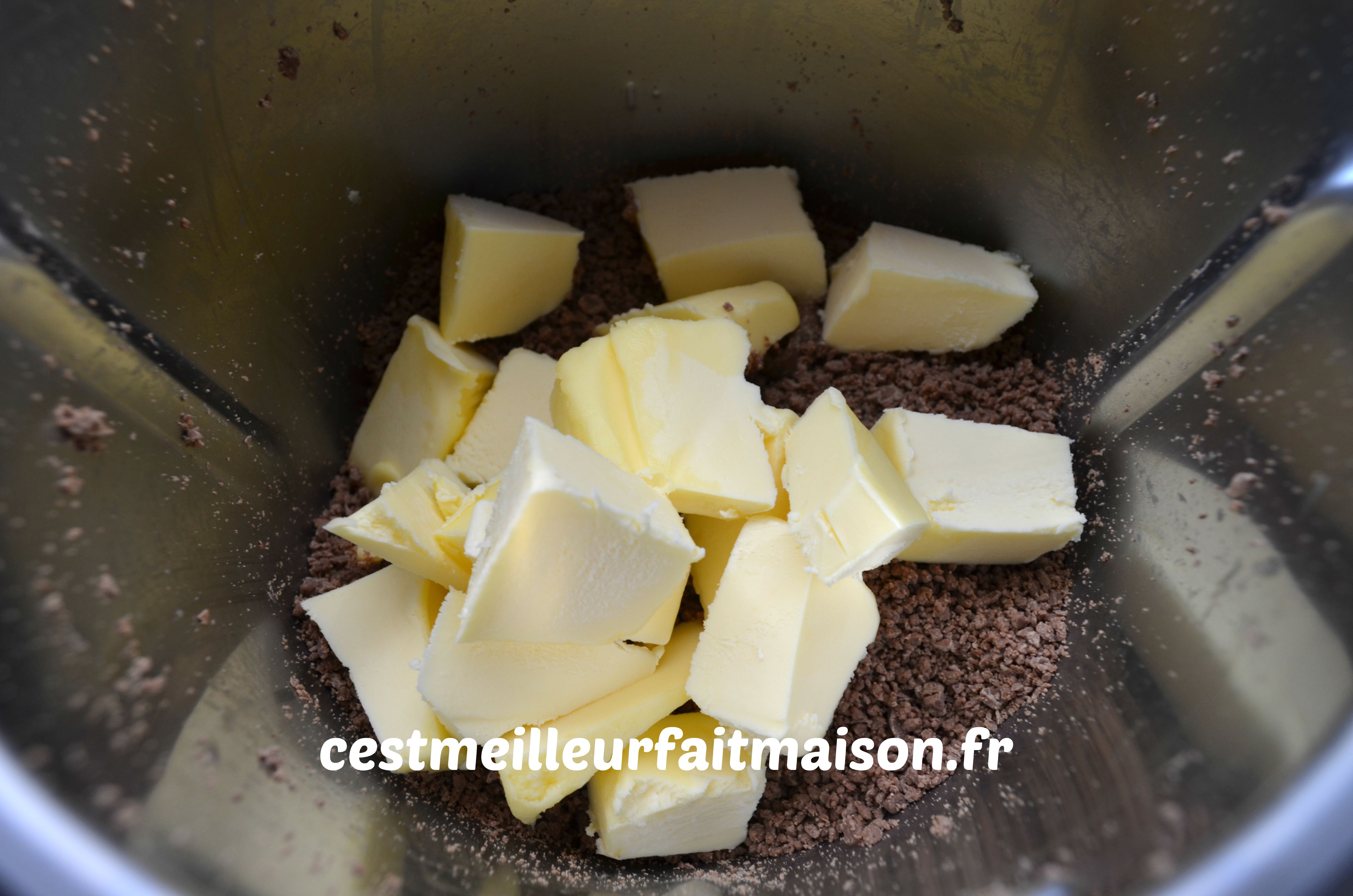 2- Racler avec la spatule et ajouter le beurre coupé en morceaux. Chauffer 3 min/50°C/ Vit 2.