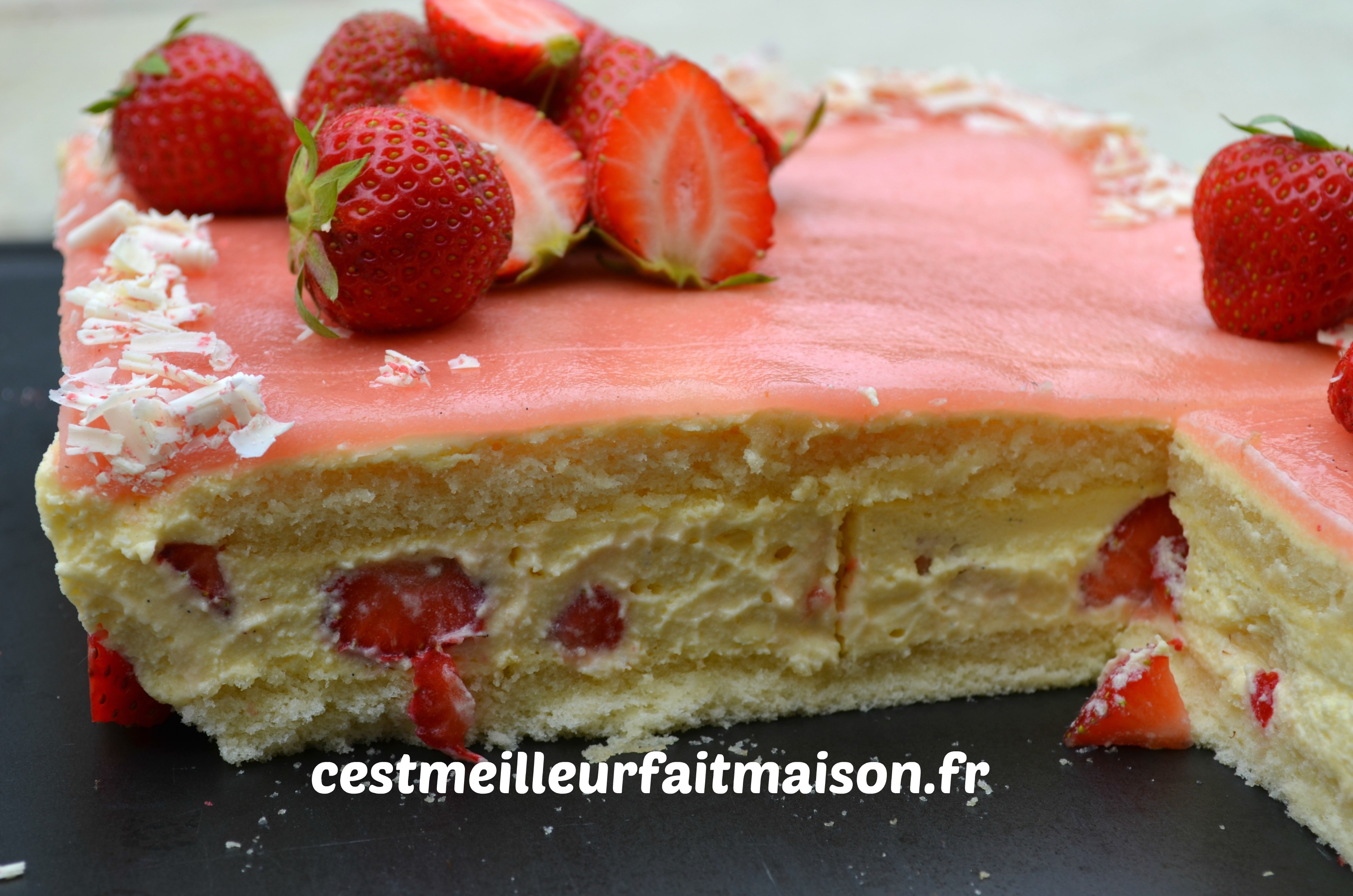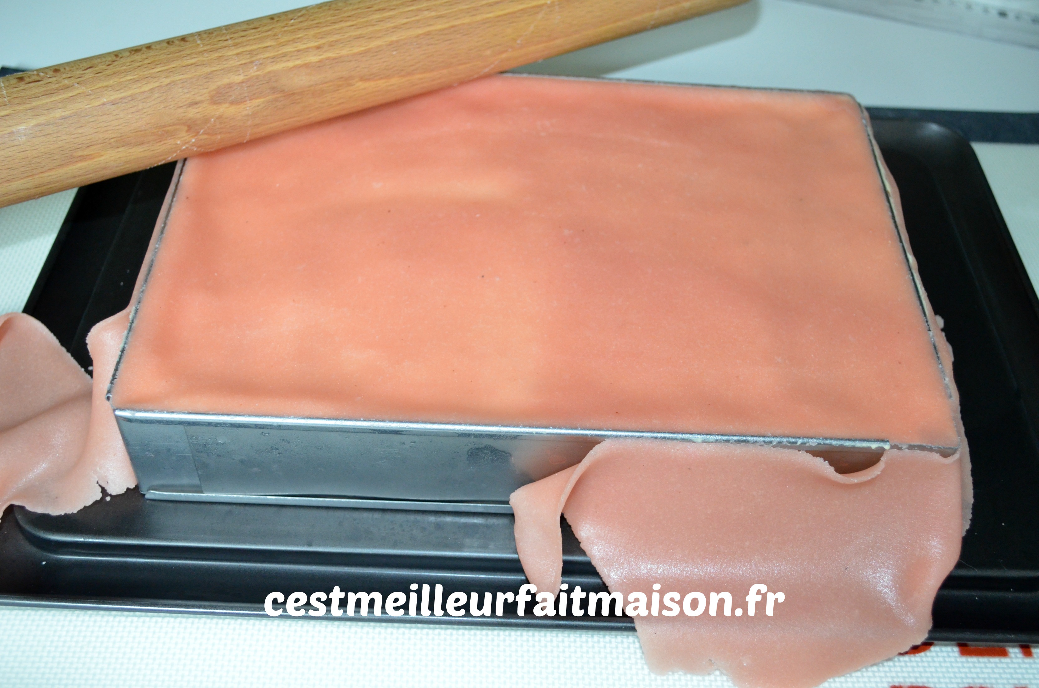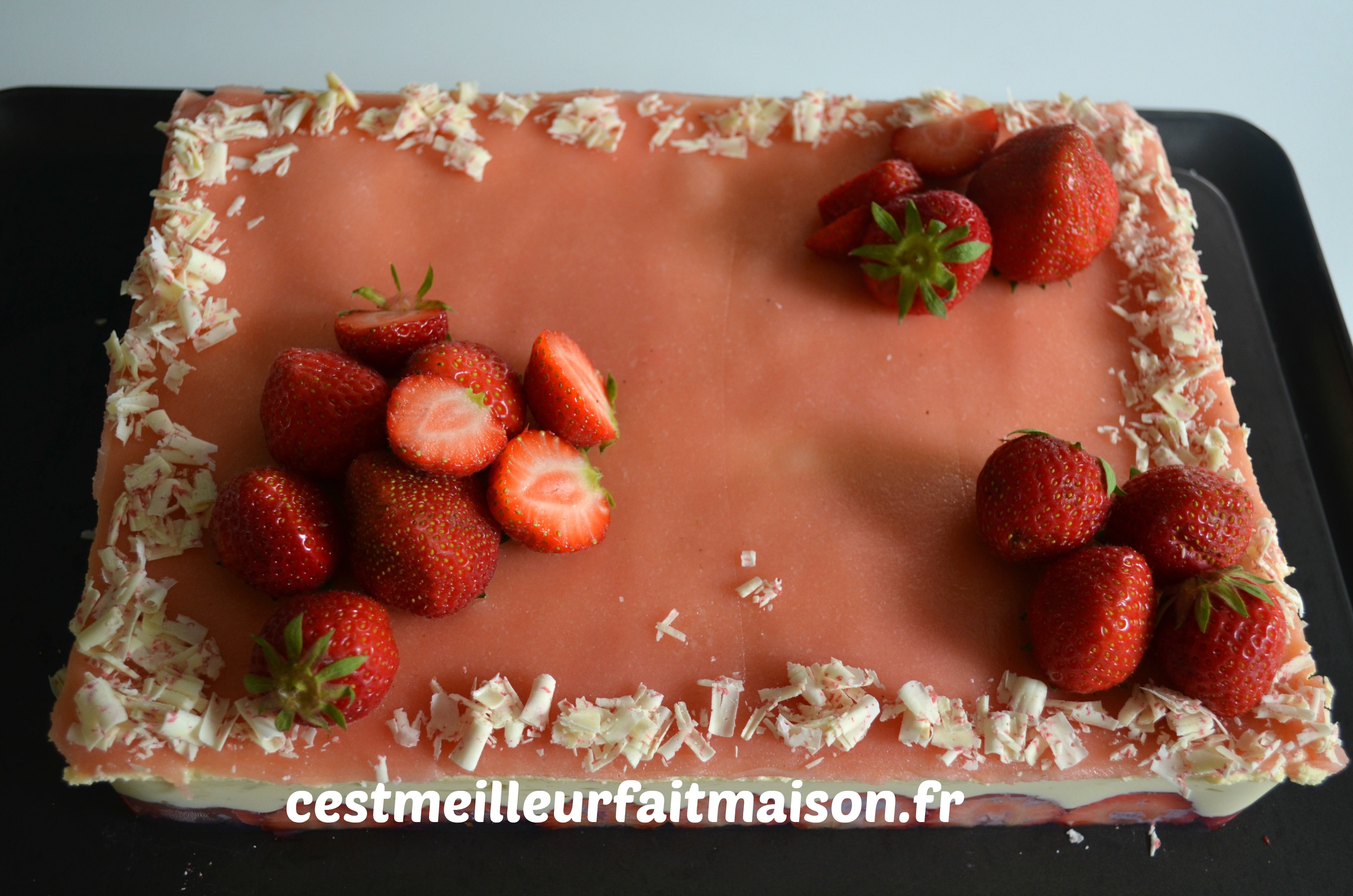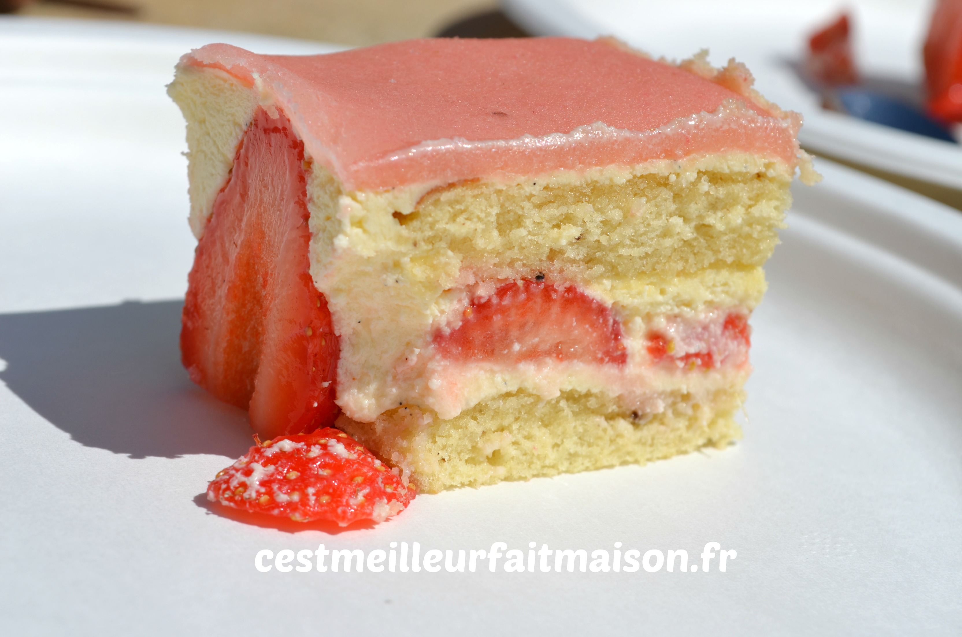Cela fait deux printemps que je m’exerce à faire un fraisier. Il y avait toujours un truc qui n’allait pas: la crème, la pâte d’amande, la présentation…Je pense avoir enfin trouvée la recette qui me convient. J’ai aussi mis du temps à me décider entre un fraisier rond et un fraisier rectangulaire ou une pâte d’amande verte ou rose. J’ai finalement opté pour un fraisier rectangulaire avec une pâte d’amande rose. Mais tout ça n’est que du détail, le plus important c’est qu’il soit bon.