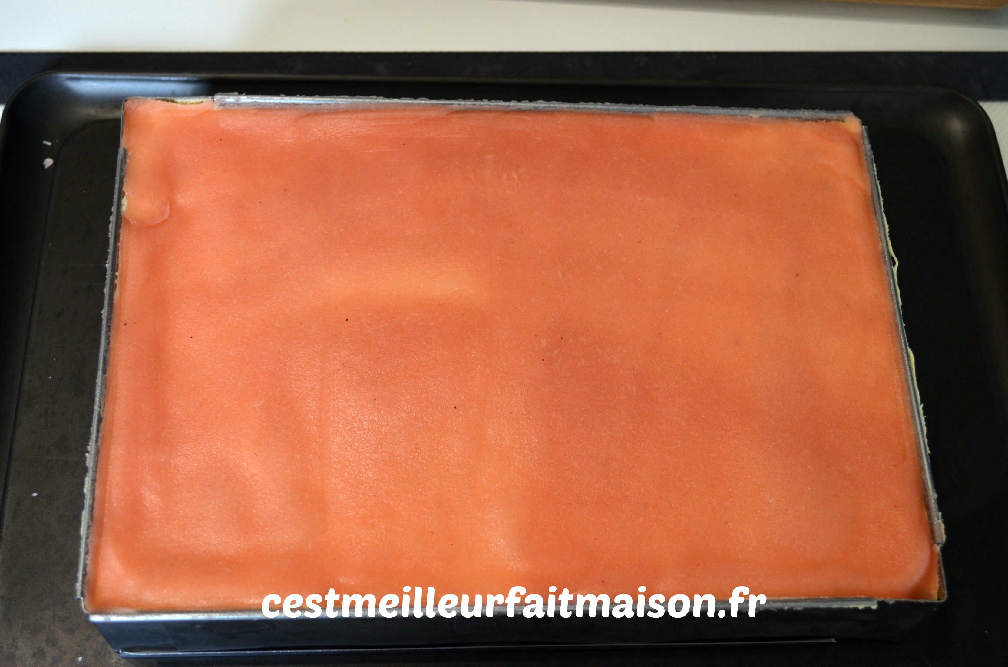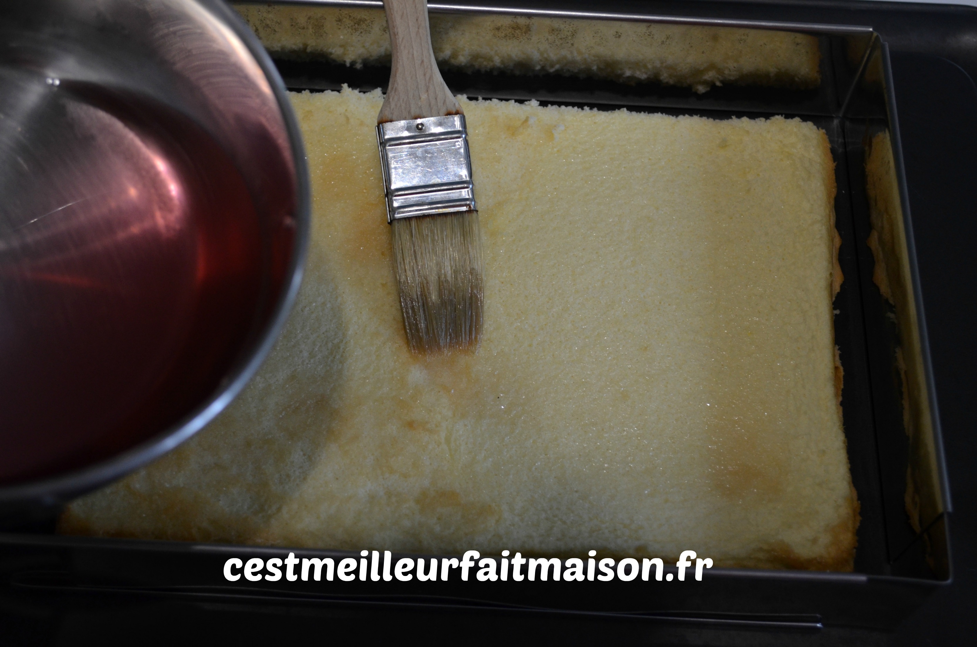5- Puncher le côté intérieur d’une demie génoise et la mettre sur un plat de service avec le cadre. J’ai régler le cadre à 20 x 28 cm.
