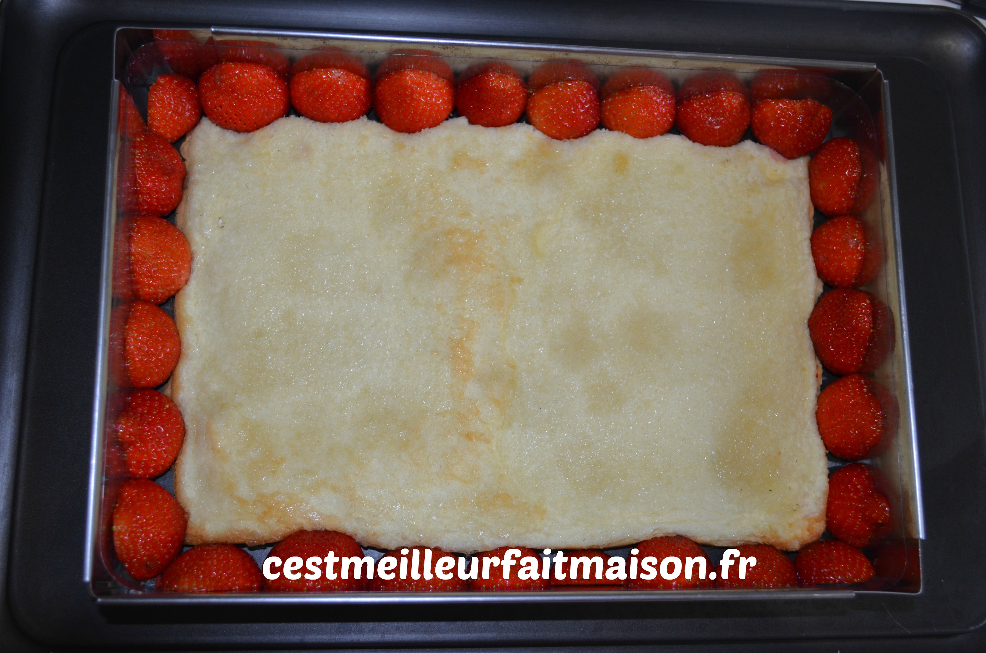 Mettre du rhodoïd à l’intérieur du cadre (facultatif mais cela facilite le démoulage). Disposer des moitiés de fraise tout autour de la génoise.