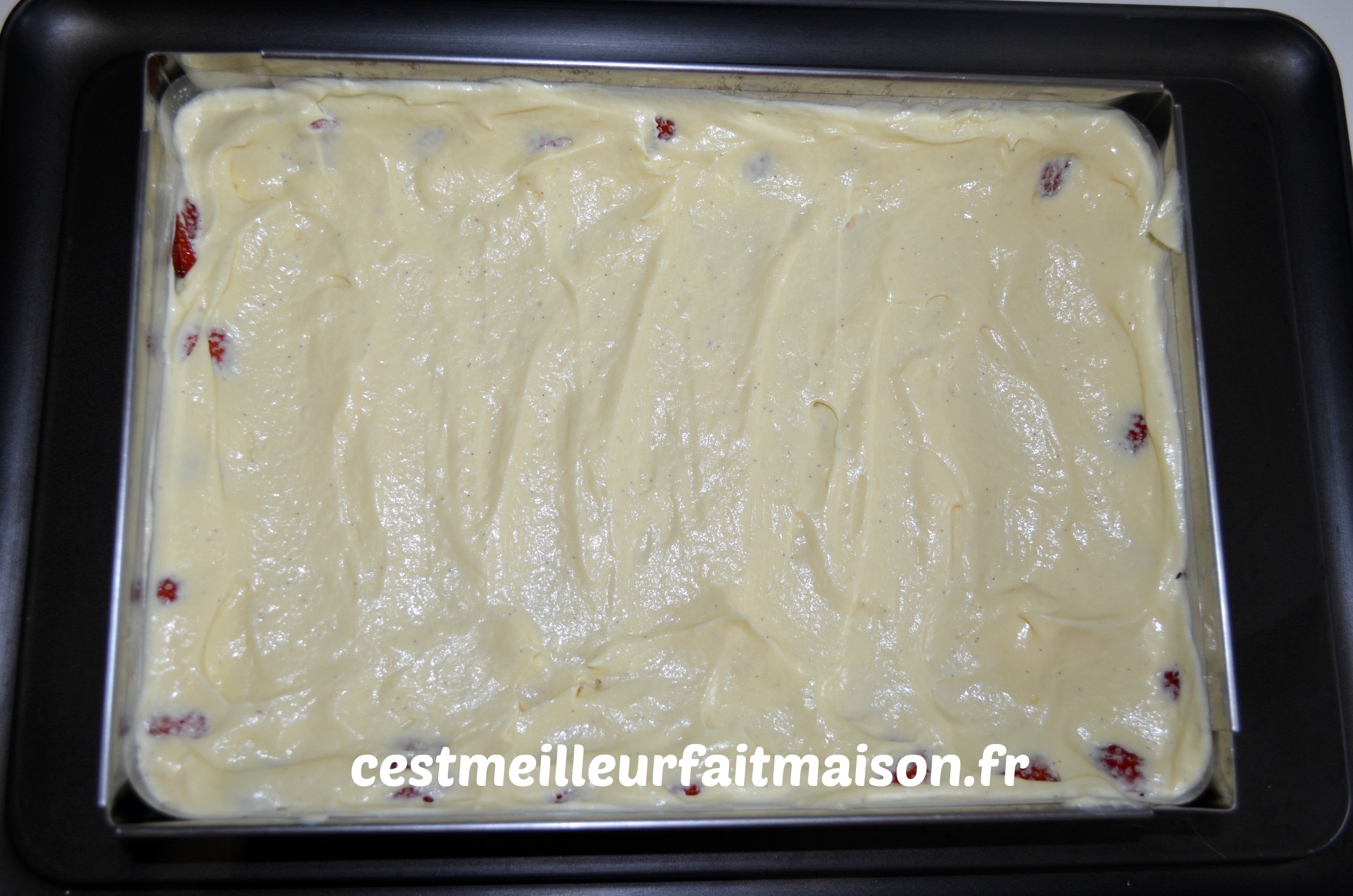 Étaler une bonne couche de crème mousseline en tassant bien au niveau des fraises.