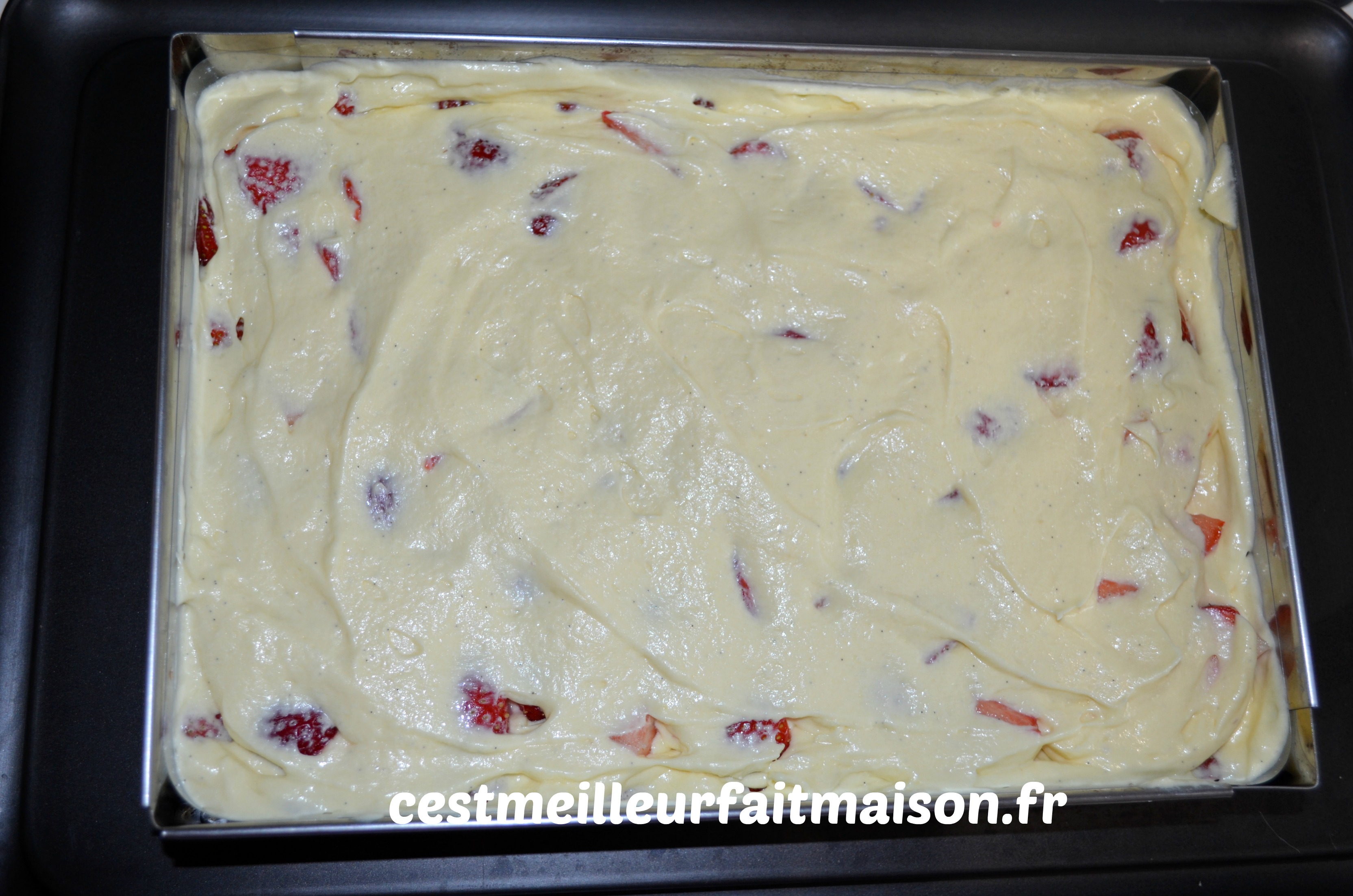 Mettre le reste des fraises et recouvrir de crème. Attention, il faut en garder un peu pour la dernière couche qui sera fine.