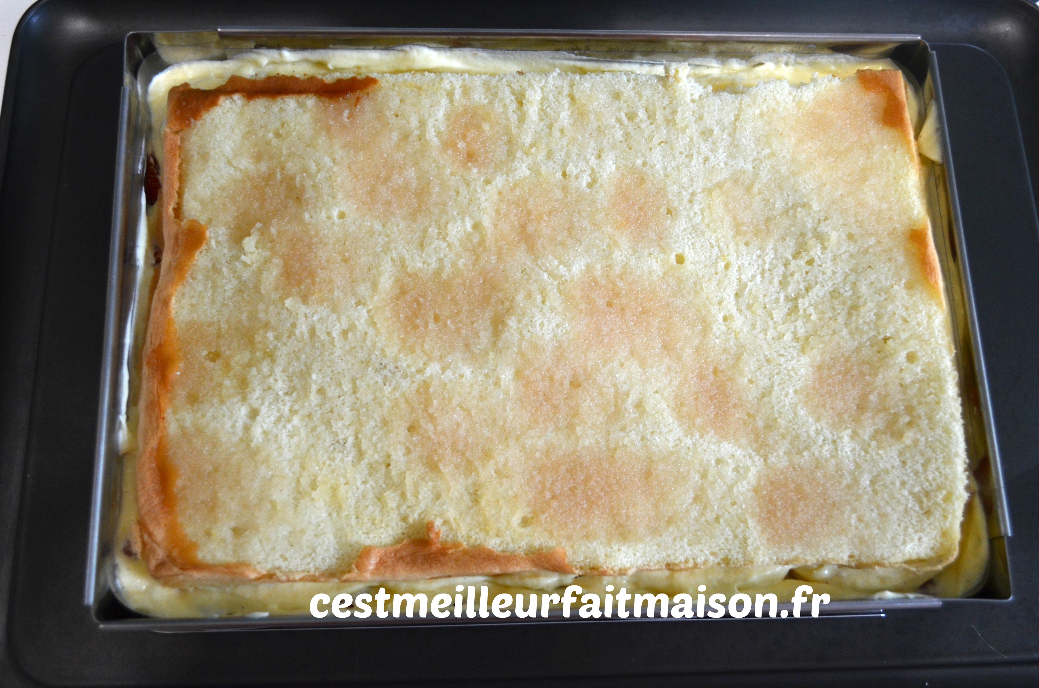 Puncher l’autre moitié de génoise mais des deux côtés cette fois. Mettre la génoise au-dessus et recouvrir du reste de crème mousseline. Mettre au frais.