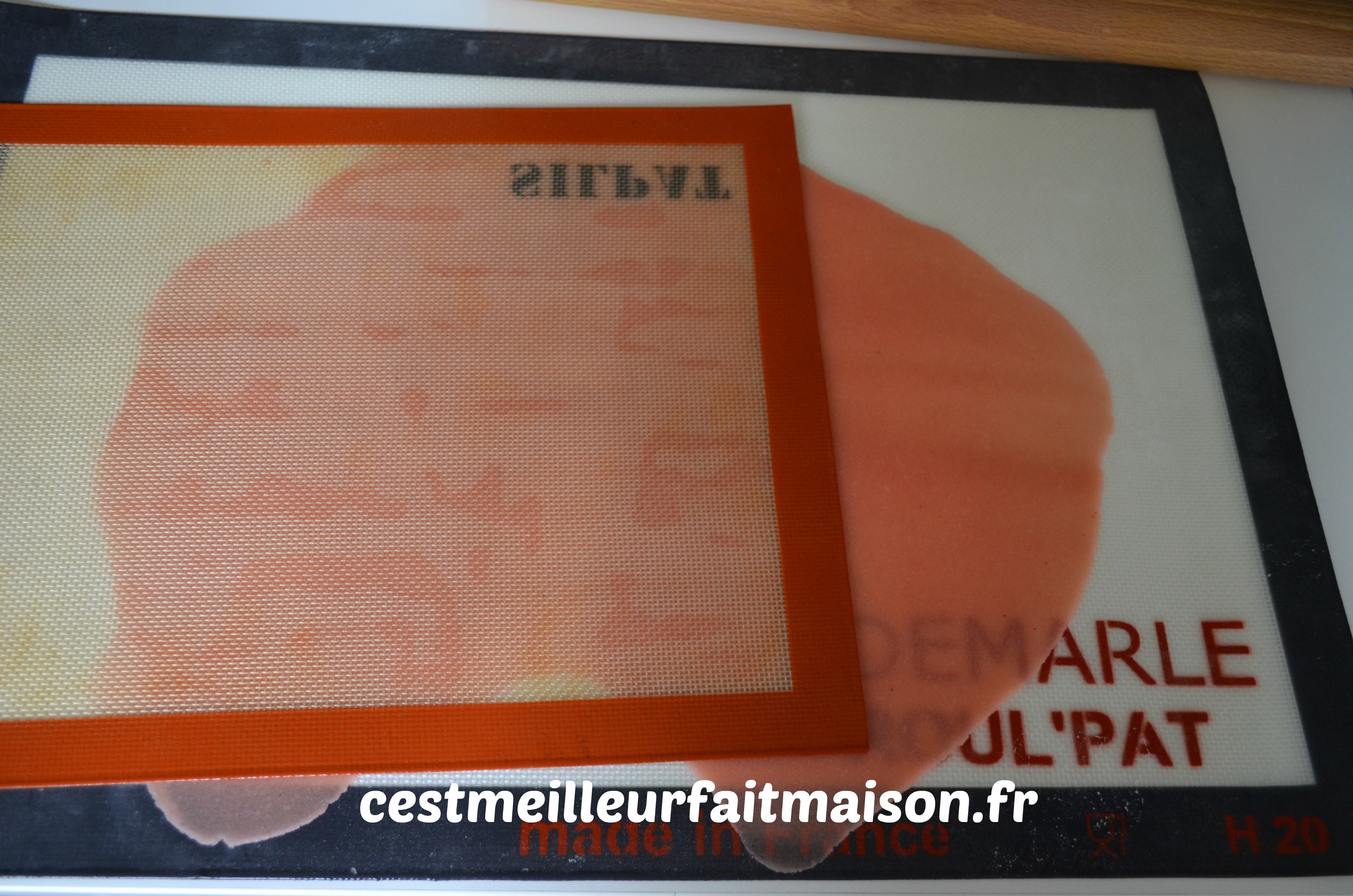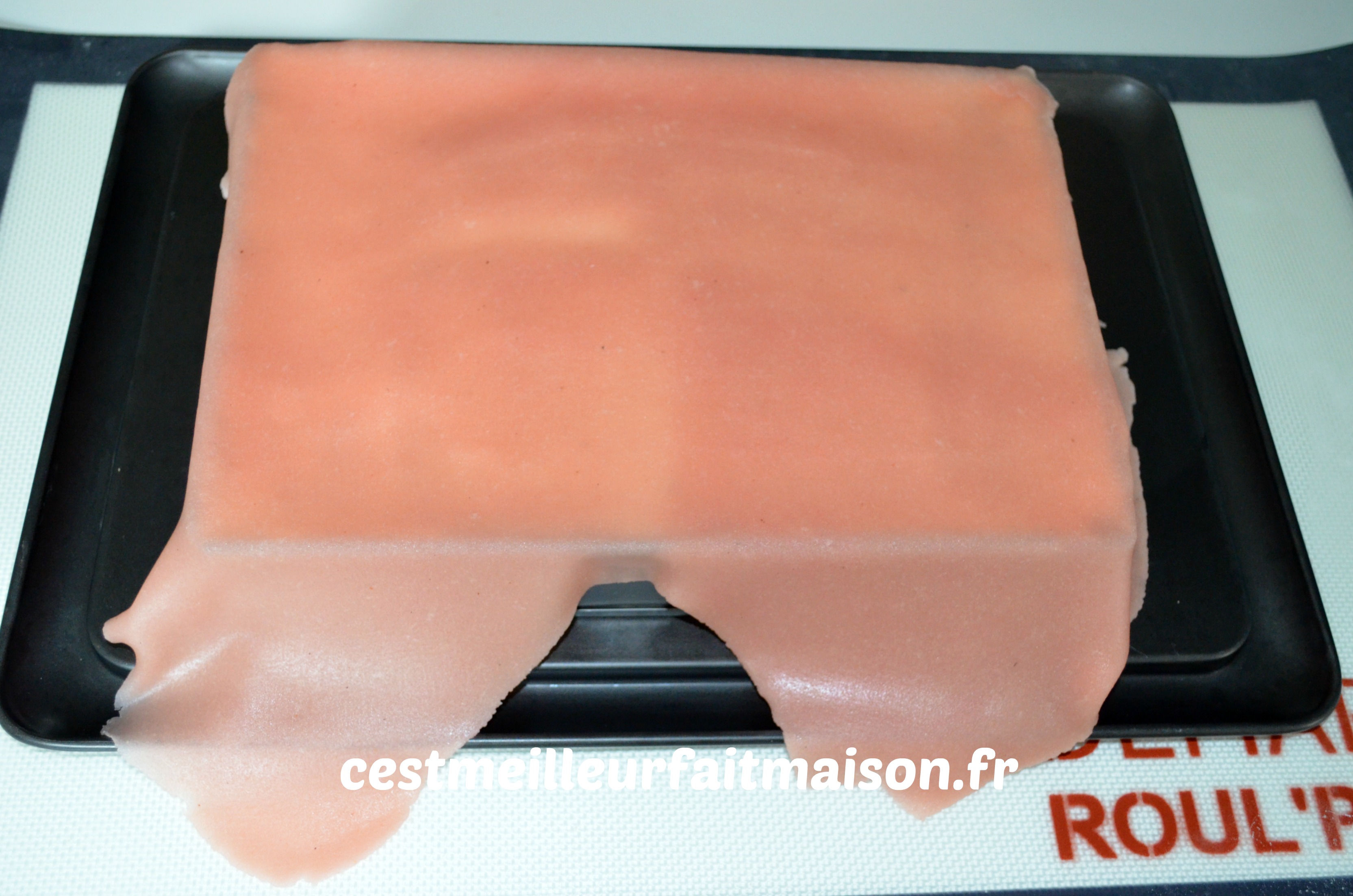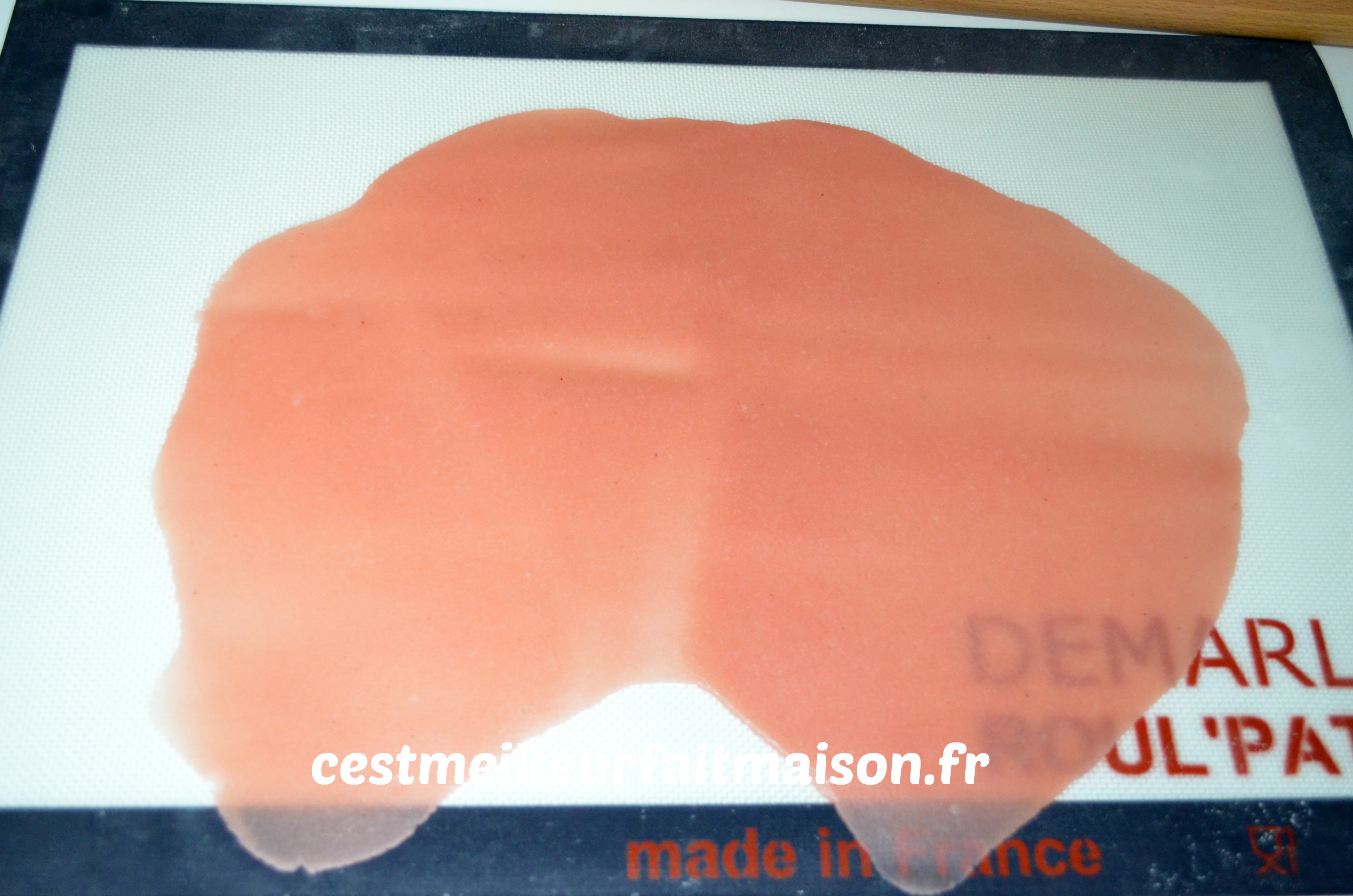 6- Étaler finement la pâte d’amande en s’aidant avec une toile Silpat.