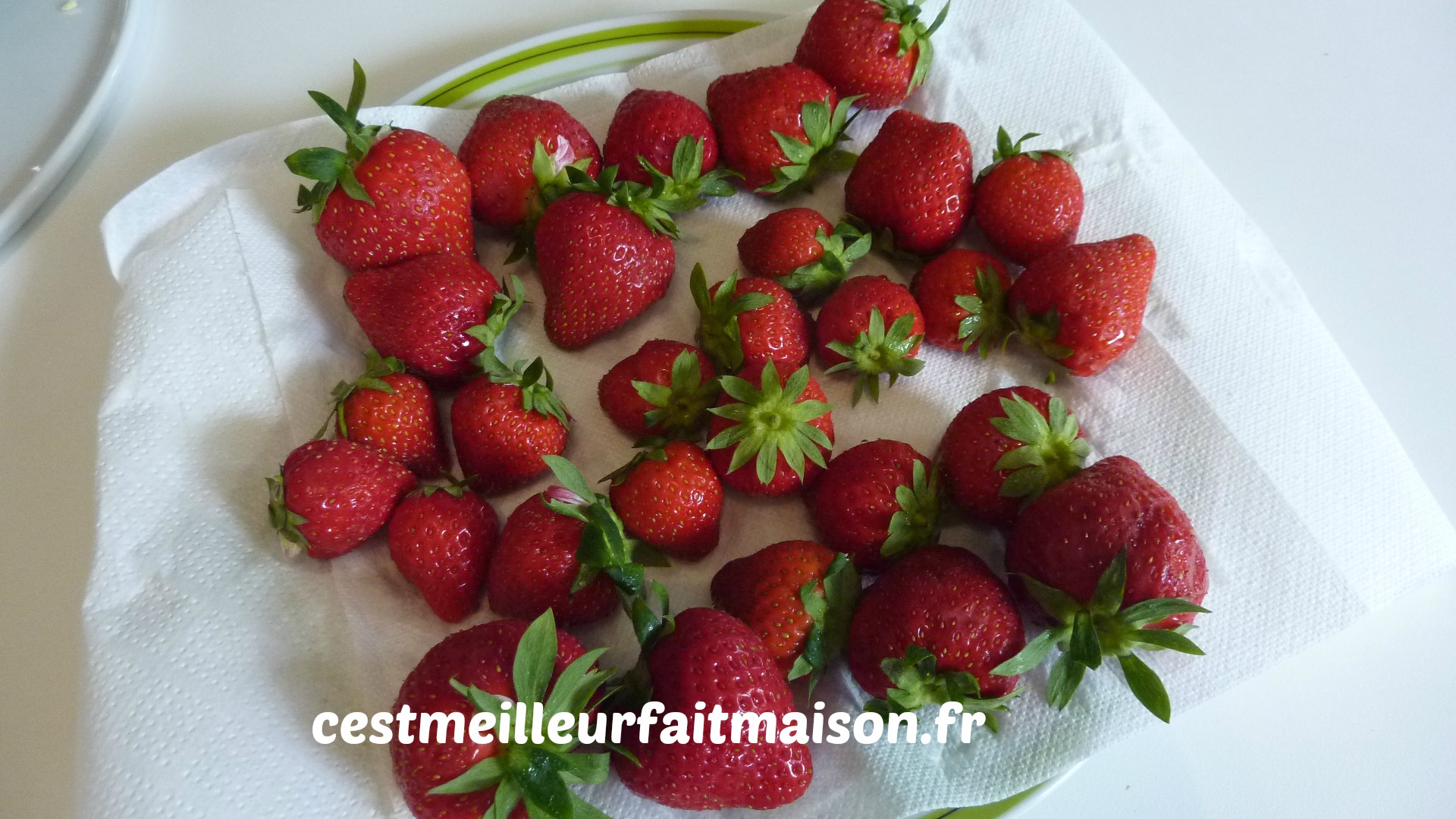 Rincer les fraises, les équeuter et les couper en deux. Il faut en garder pour la décoration.