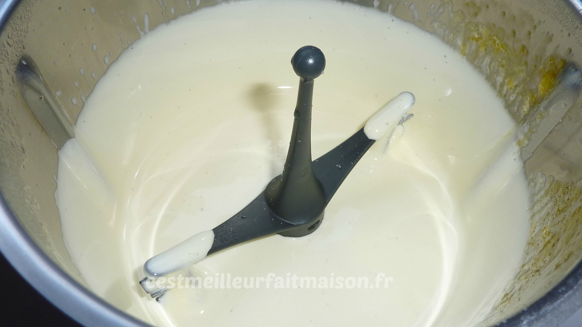 On peut la faire à la casserole comme ici ou au Thermomix. Dans ce cas, mettre tous les ingrédients dans le bol (pour la gousse de vanille, on utilise uniquement les graines) et programmer 7 min/90°C/Vit 4. A l’arrêt, mixer 5 sec/Vit 9.