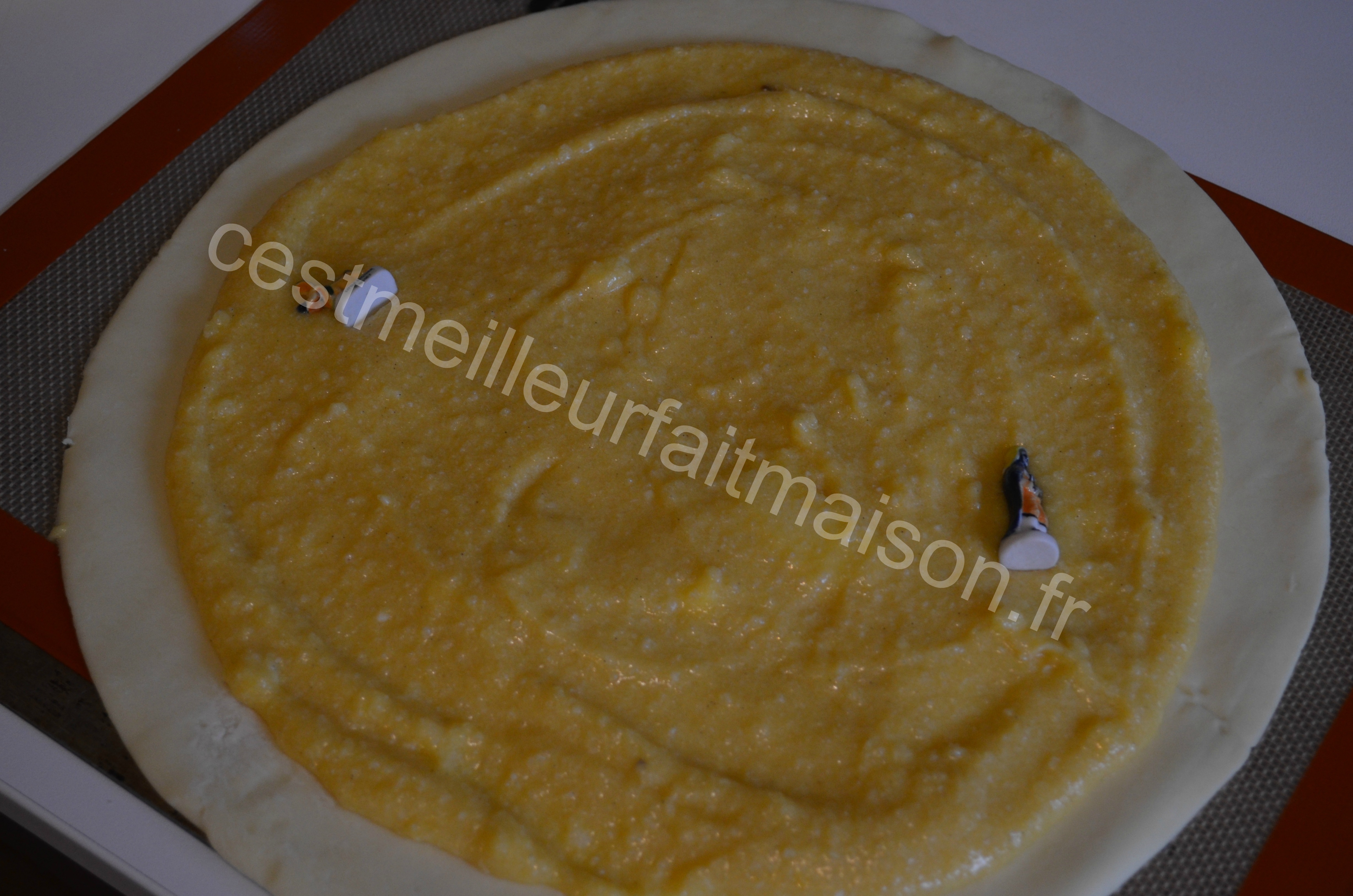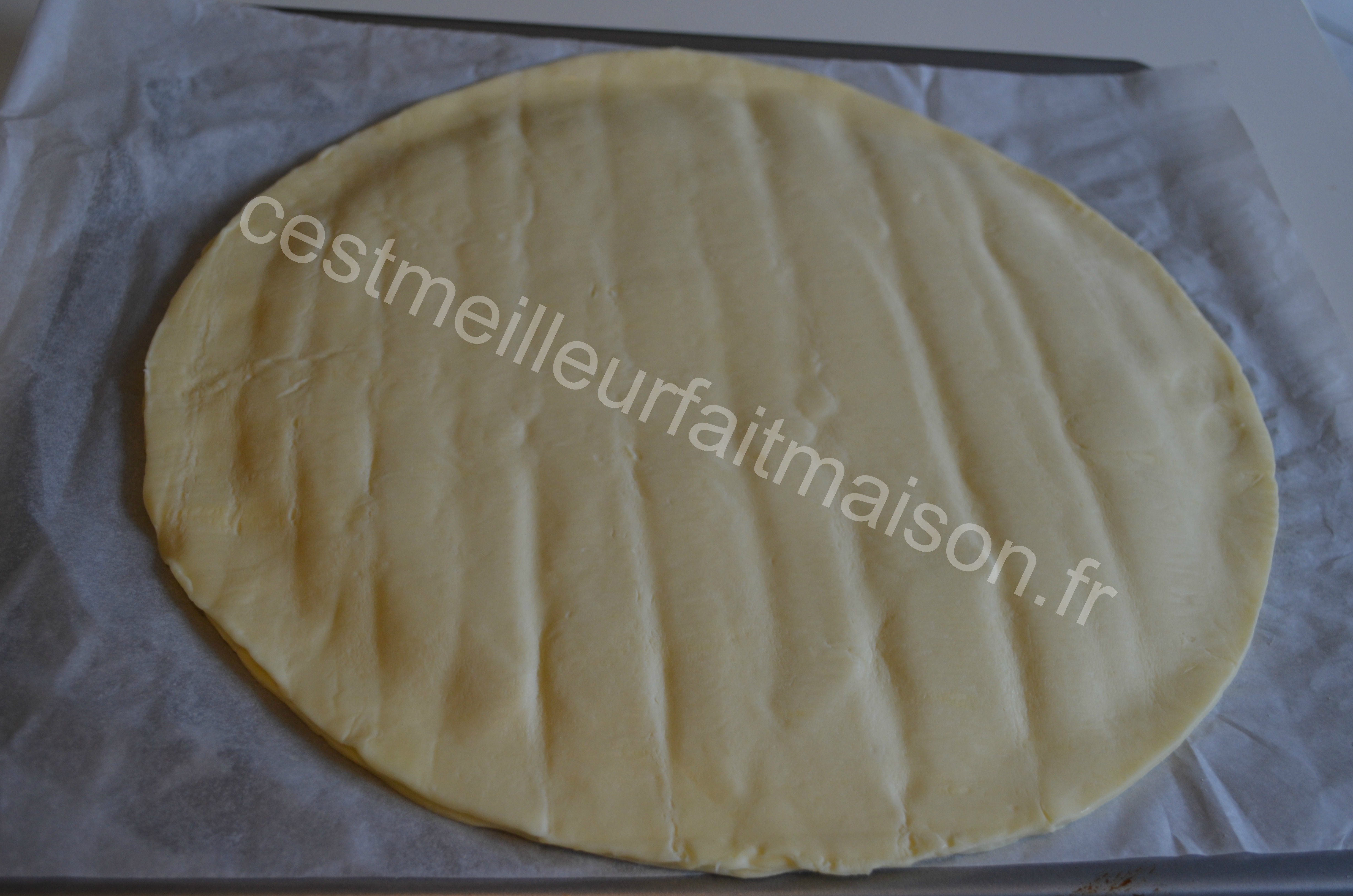 3- Dérouler une pâte feuilletée et y étaler la frangipane en gardant une marge de 2 cm environ. Penser aux fèves. Badigeonner le pourtour avec de l’eau avant de poser la deuxième pâte. J’ai lu je ne sais plus où, qu’il est préférable de retourner la galette à l’aide d’une deuxième plaque afin d’avoir un galette plus plate. C’est ce que j’ai fait avant de passer à l’étape 4.