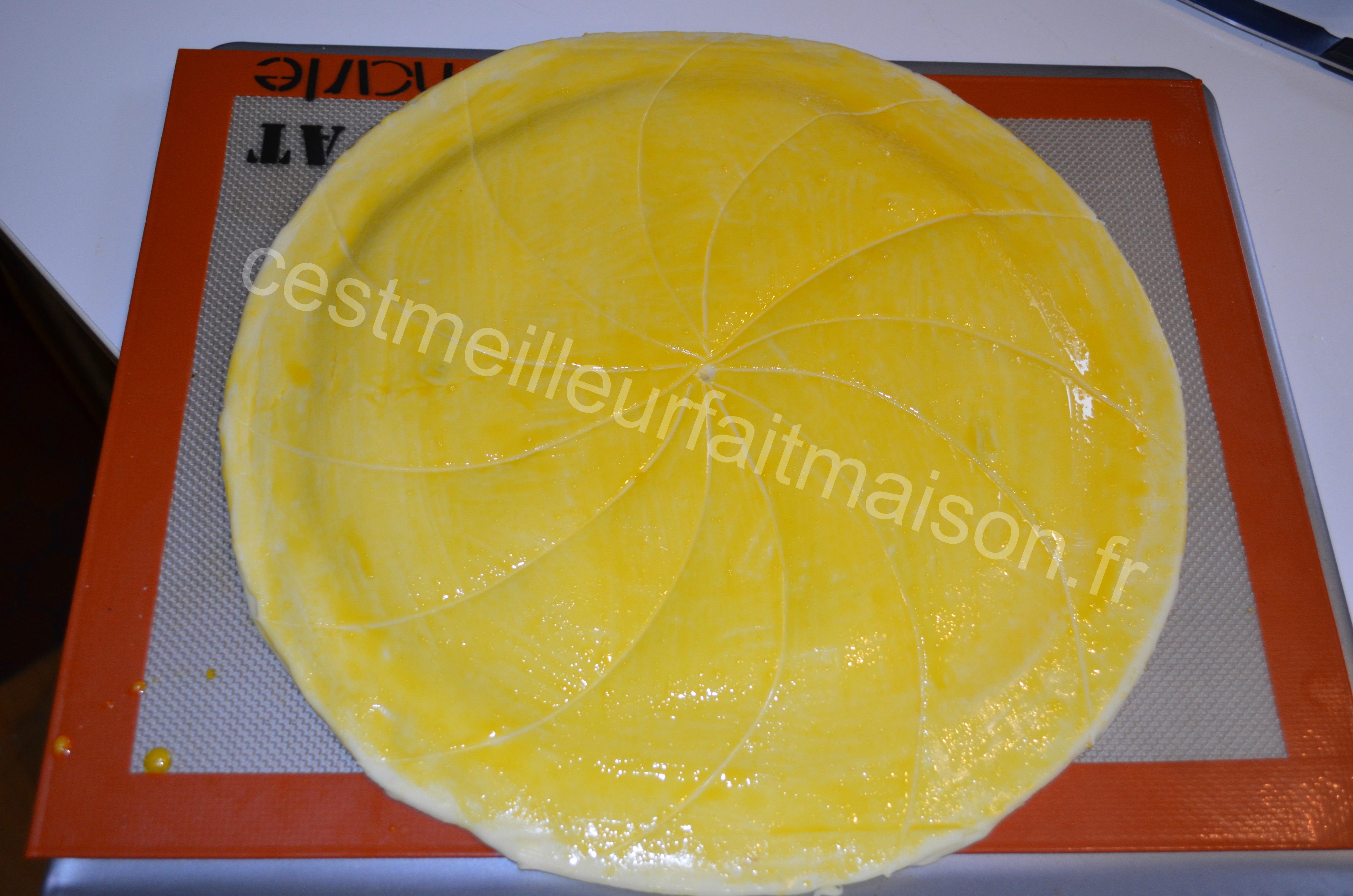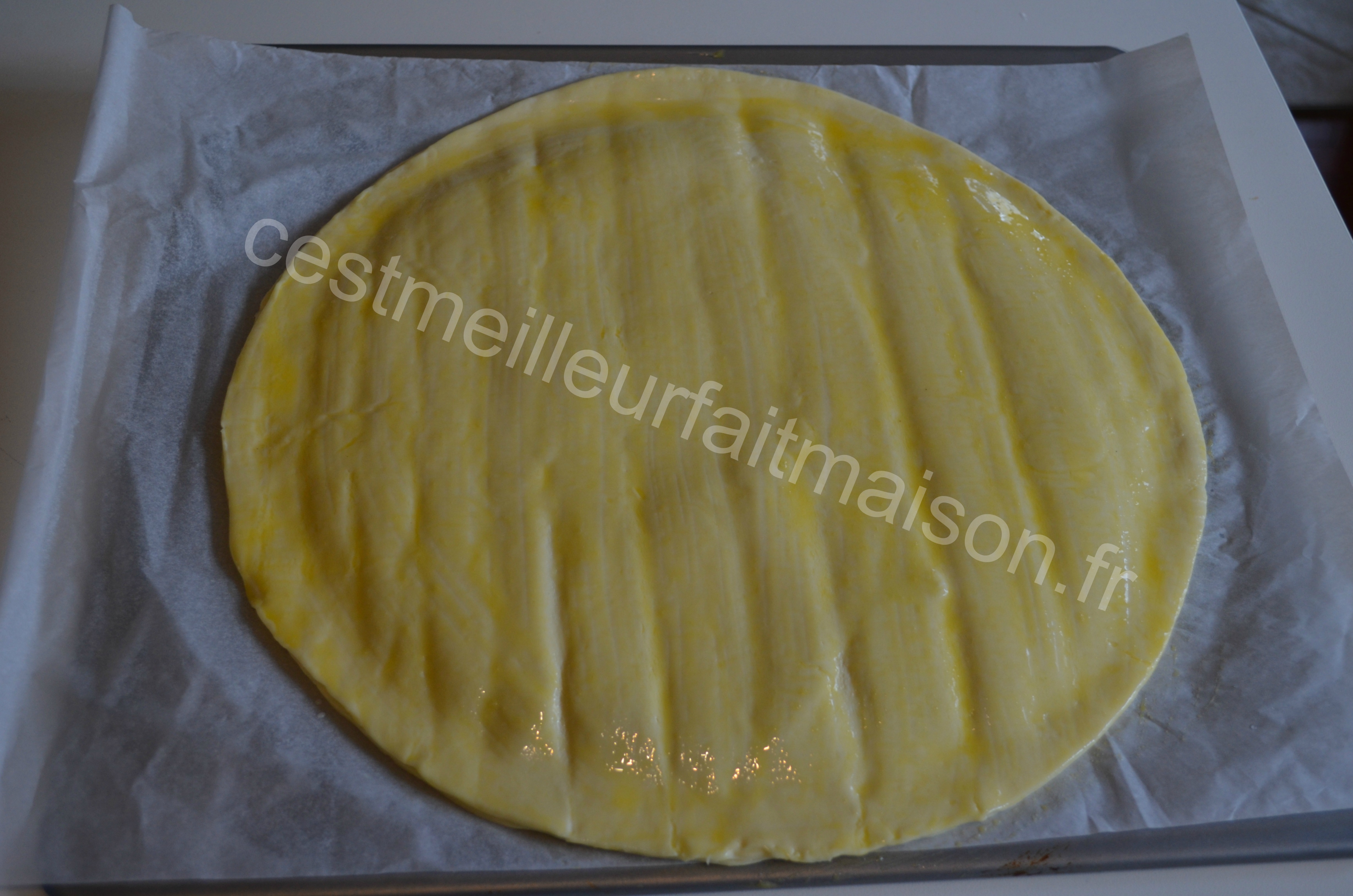 5- Préchauffer le four à 210°C. Sortir la galette du réfrigérateur et la dorer une deuxième fois avec le reste de l’oeuf. Faire un trou au milieu, pour l’évaporation, et faire des traits en fonction de votre imagination.